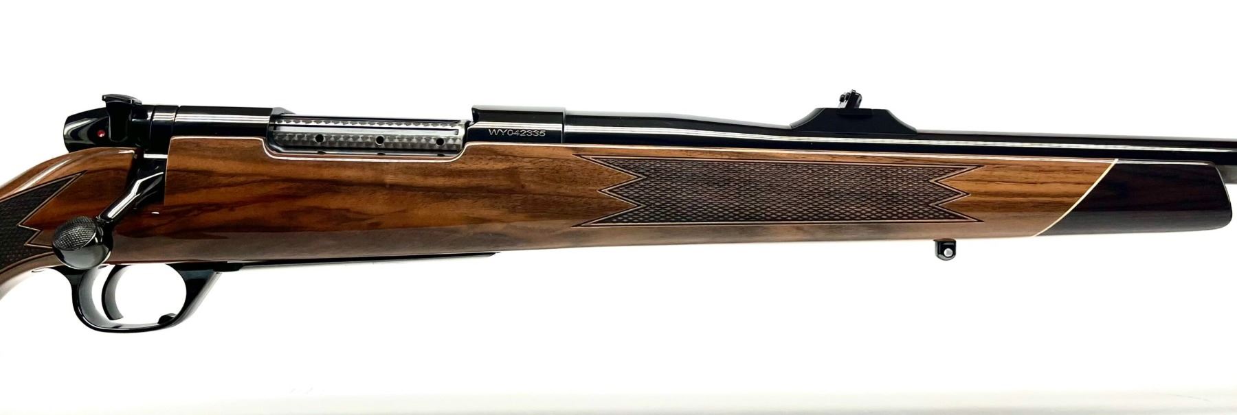 Weatherby MKV custom deluxe in 416 Wby. Perfect for that buffalo, hippo or other large nasty critter you have been dreaming of chasing. Beautiful gloss finish on the fancy wood and metal, classic Weatherby style. Iron sights. Muzzle brake, hand checkered bolt knob and jeweled floor plate, fitted hard case and even 2 boxes of ammo!. Blueprinted by Weatherby custom shop with the WY WSF logo on the floorplate.