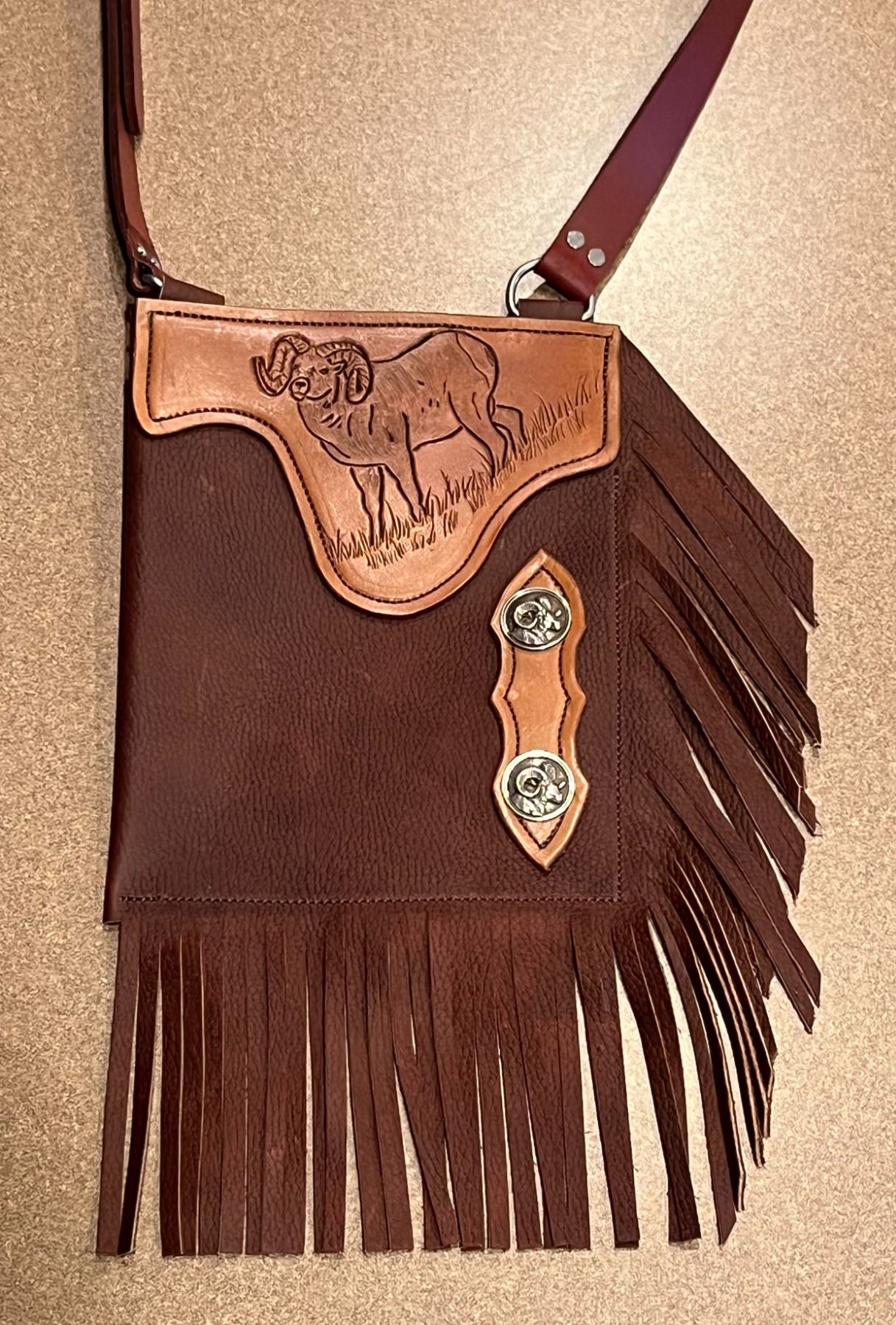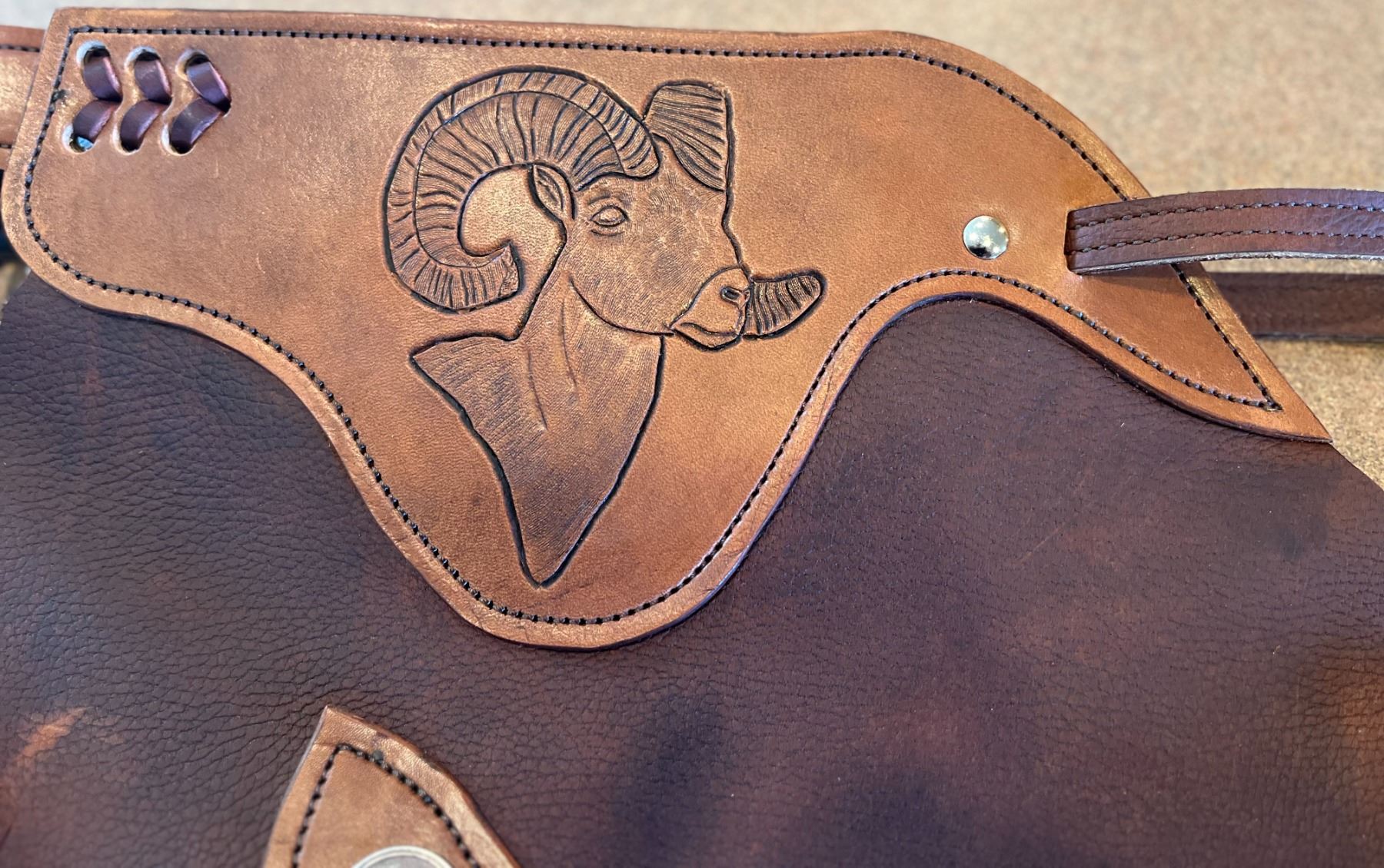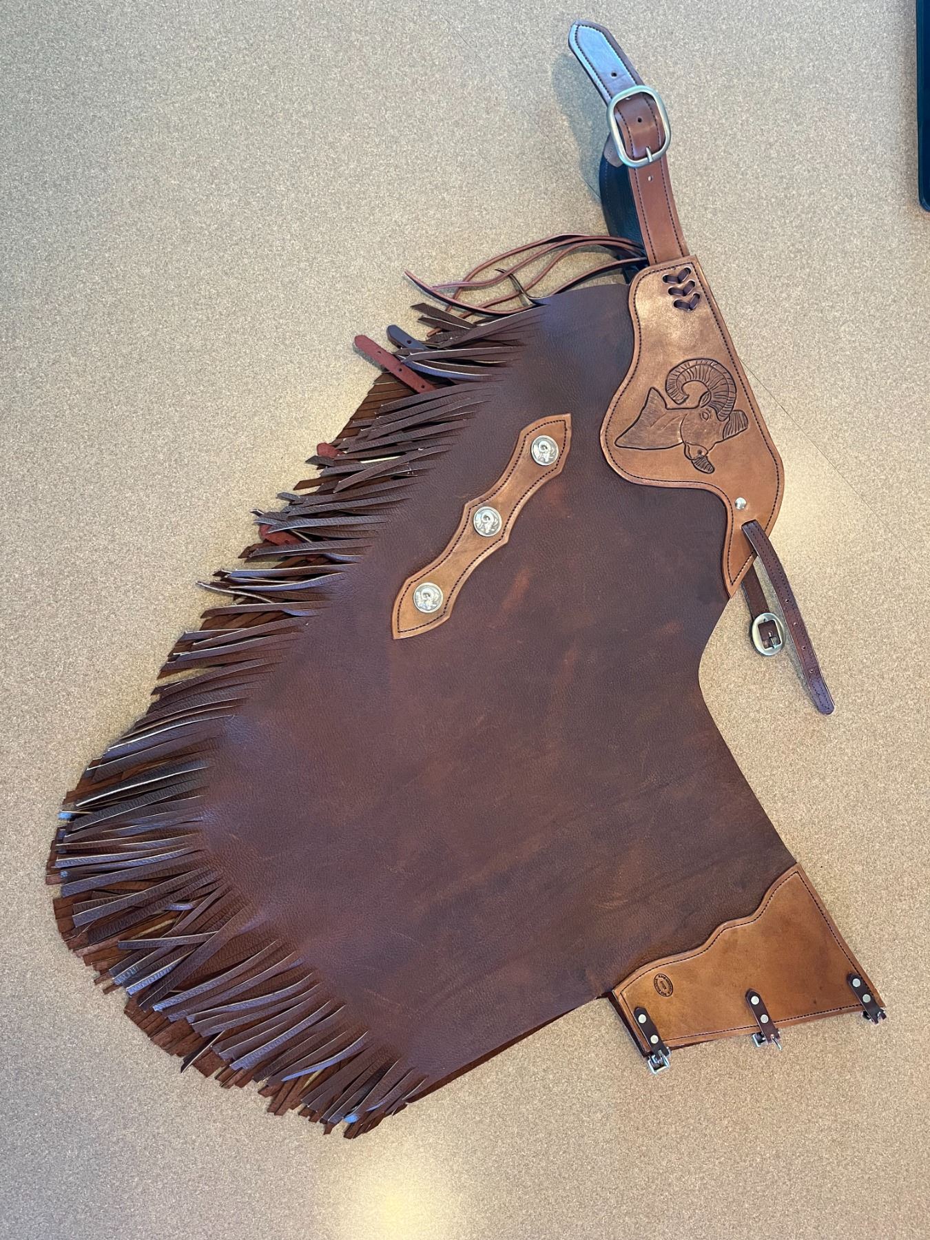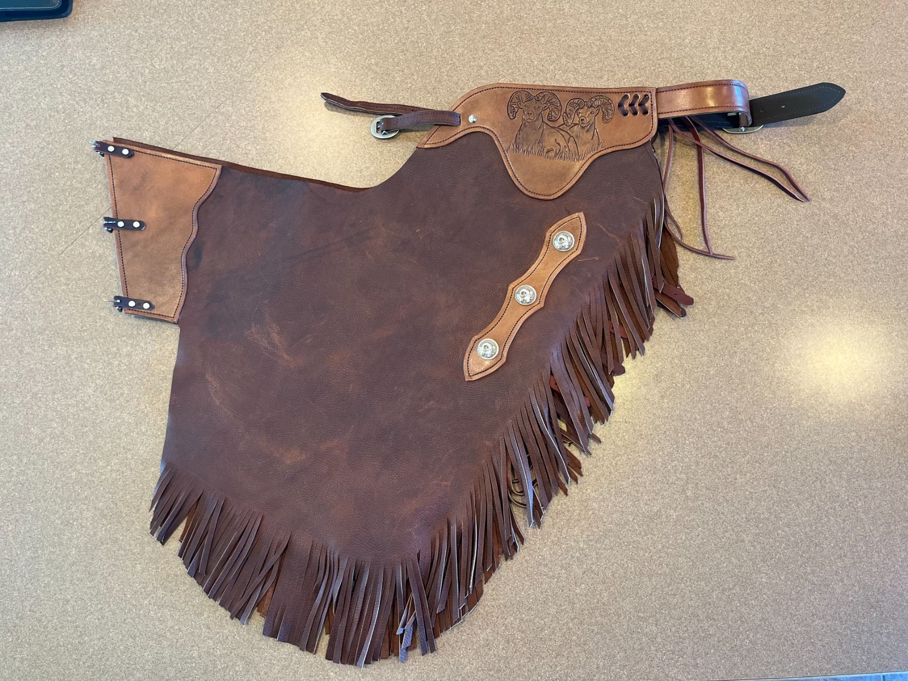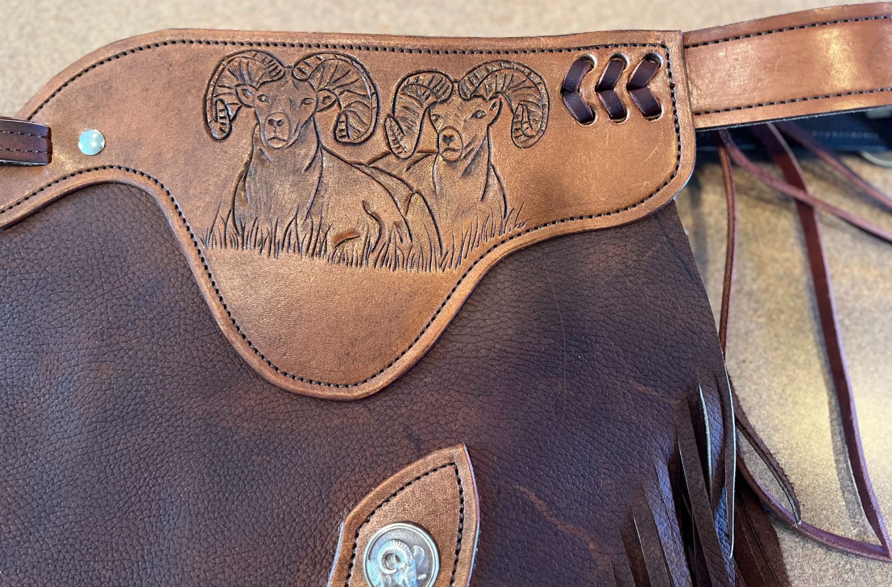 Description: Ryan Amundson Leather Chinks with matching Purse. One of a kind! Custom leather chinks with hand tooled images of bighorn sheep with a matching women’s purse with hand tooled bighorn sheep images. Made of top quality leather, 6 oz. weight body leather with antique finish hardward. The chinks are very adjustable in the waist with a front and back strap as well as a thigh strap. Complete with a 5" fringe. These hand tooled bighorn sheep images will never again be used by the maker. 1 of 1! Complete with matching purse.