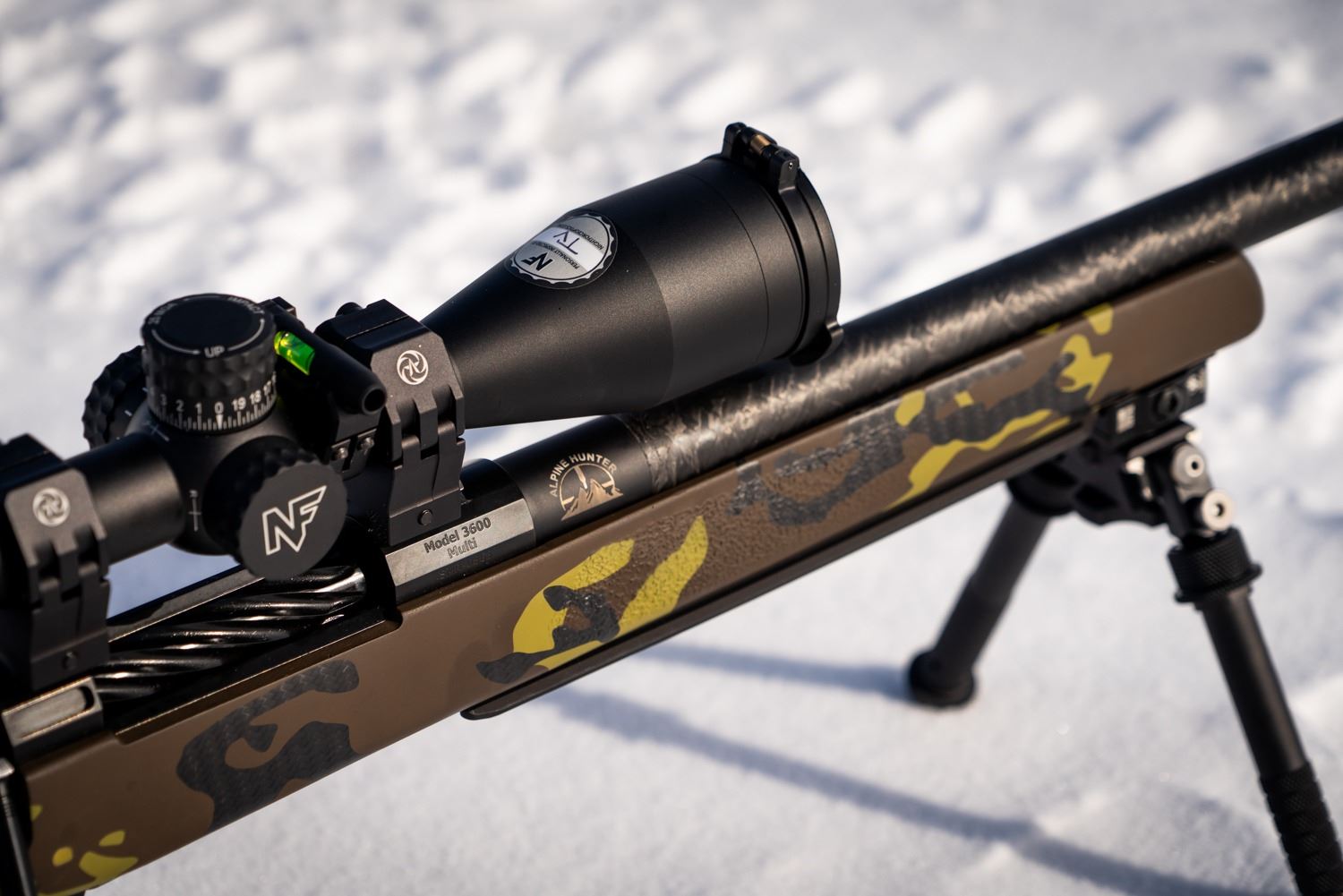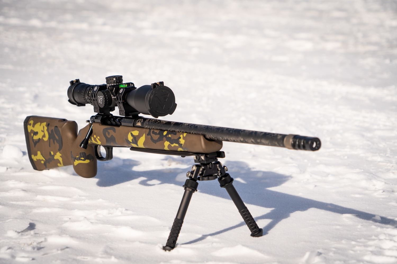 Description: Snowy Mountain Custom rifle build. RH 300 PRC. custom finish {WY WSF colors} Night force scope. Includes Rifle, scope, rings and bases, laser cut rifle case, bipod, full length BC combo rail, muzzle break, load data