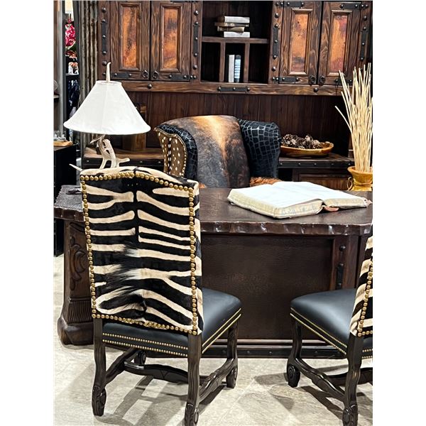 Commemorate your hunt in a truly extraordinary way with LOREC Ranch Home Furnishings. Our talented team of skilled artisans is ready to collaborate with you to design two bespoke chairs that beautifully celebrate your hunting achievements. Featuring your trophy hides, exquisite Italian leather, and hand-hammered nail heads, these chairs are not just functional; they are a tribute to your adventures.