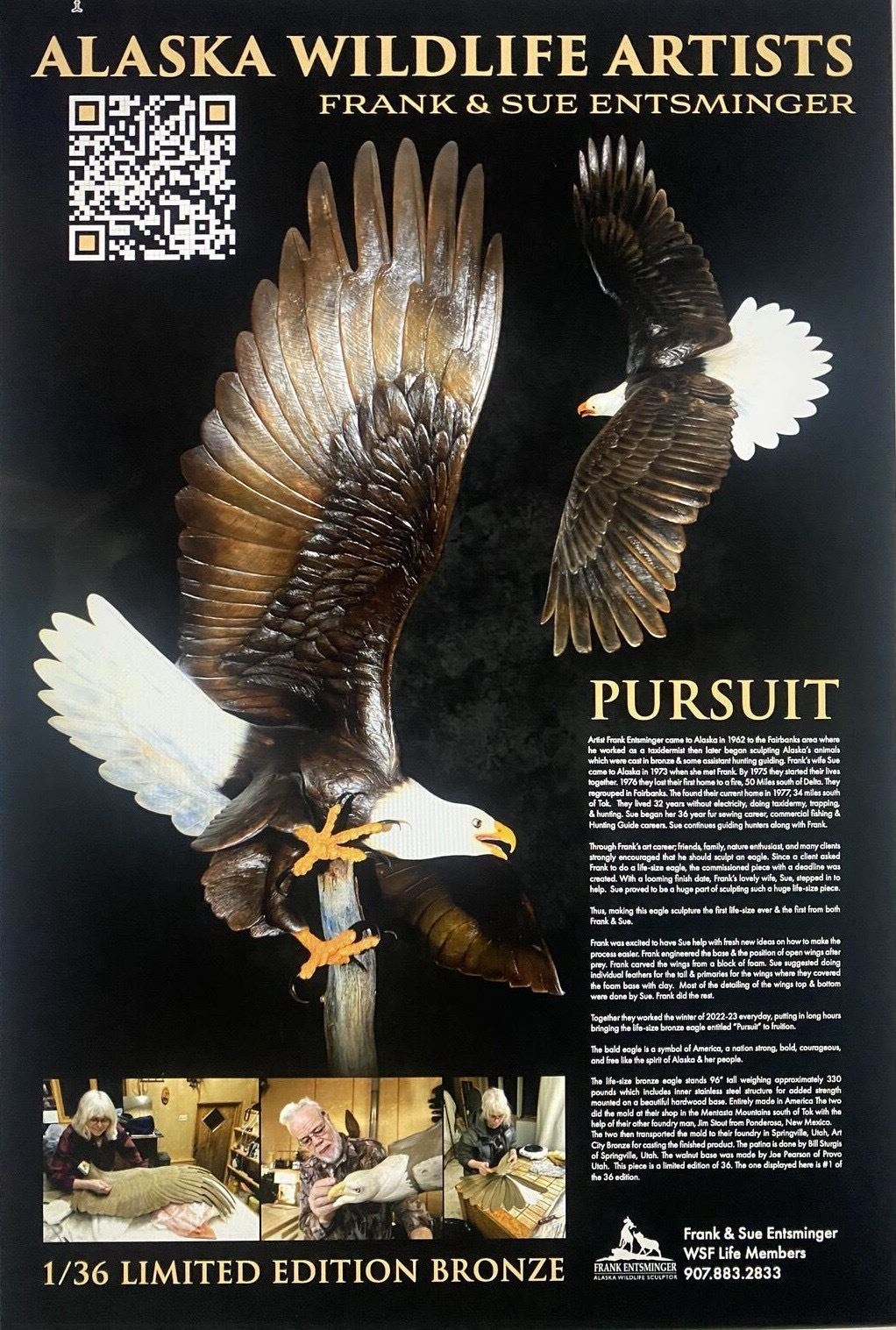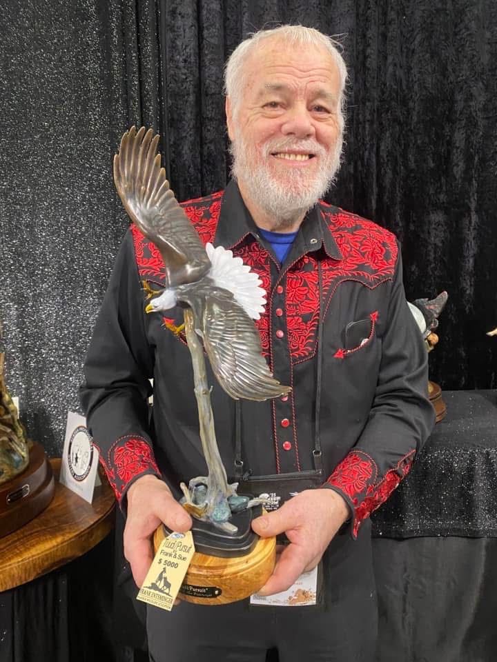 This limited edition 1/36 scale bald eagle bronze sculpture is based on the lifesize bald eagle sculpture"Tuudi Soaring Eagle", the first lifesize sculpture Frank and Sue Entsminger ever produced. They painstakingly sculpted individual feathers for the tail and wings and produced a landmark piece of art that sold at the Wild Sheep Foundation's National Convention in 2024.