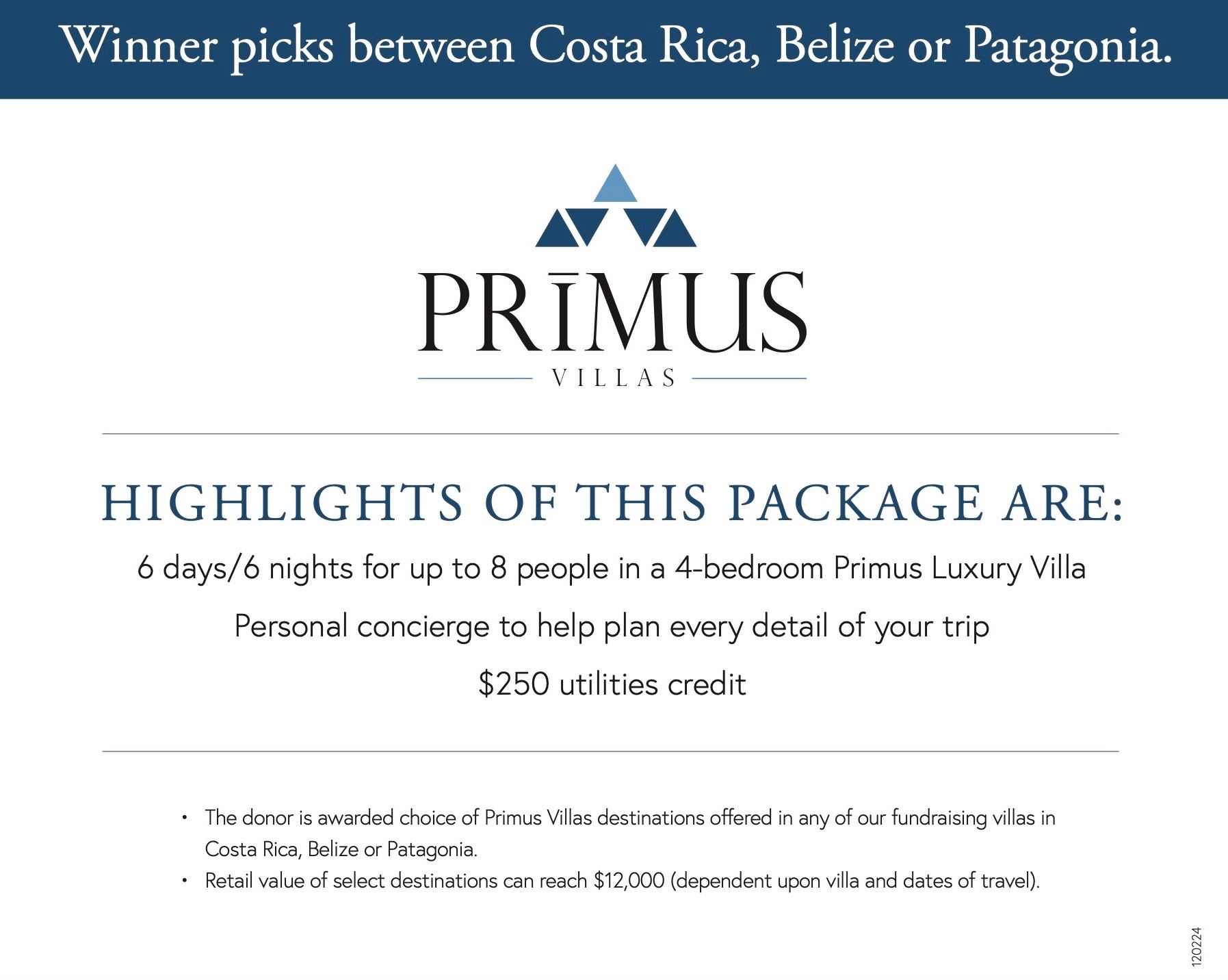 Pack your beach gear and travel south for six magnificent days and nights at your choice of premium vacation locations of Primus Villas in Belize, Costa Rica, or Patagonia!