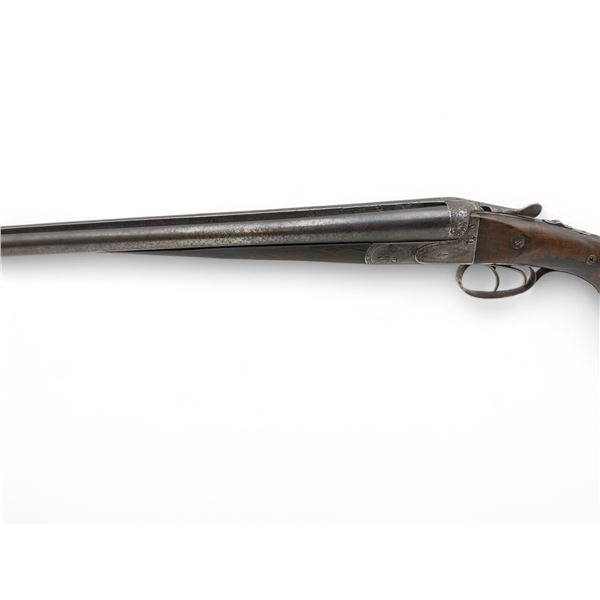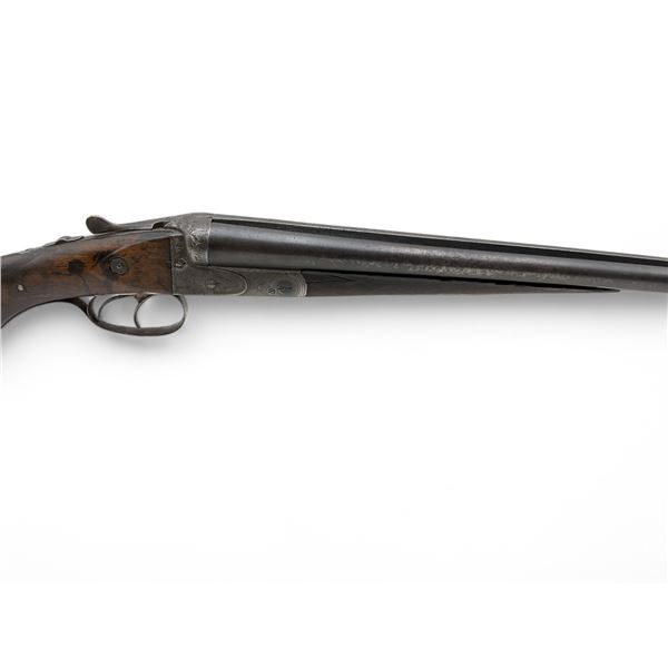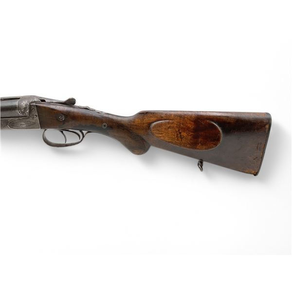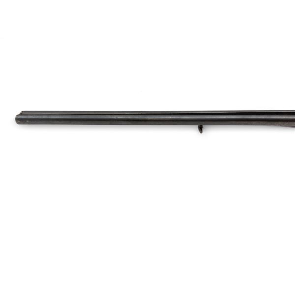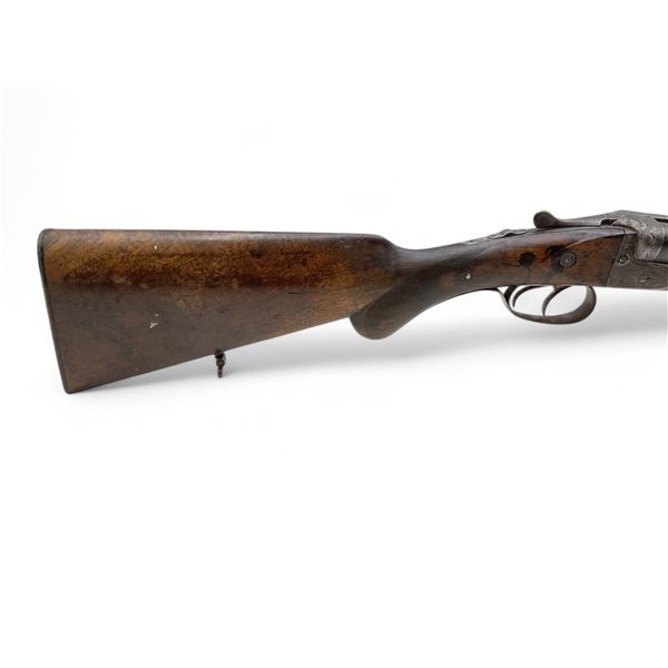 Unknown German Side By Side Shotgun 16Ga 30" Barrels Wood Stock. Wood forend is cracked; rear stock is cracked and has been repaired. Bead sight; fixed chokes. Double triggers. Finish shows signs of corrosion. This is a non-restricted firearm.