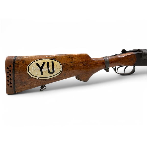 Baikal Side By Side Shotgun 16Ga 29" Barrels Wood Stock. Bead sight; fixed chokes. Double triggers; custom rubber butt pad. Rear stock is cracked and has water clamp holding it together. Both barrels have multiple dents. Action is loose even when locked up. This is a non-restricted firearm.