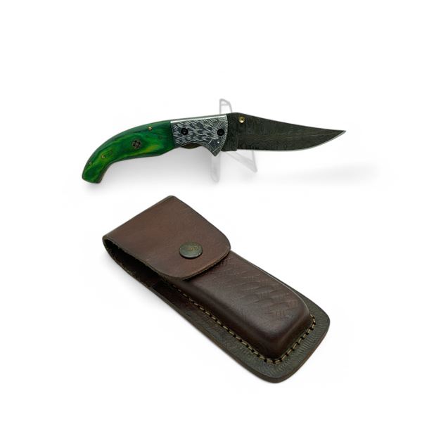 Hand Forged Damascus Folding 4" Blade Knife with Eagle Engraving and Leather Pouch, New