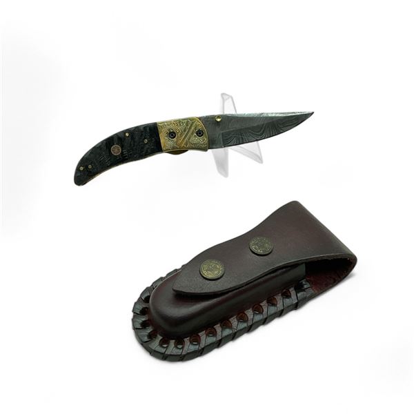 Hand Forged Damascus Folding 3.5" Blade Knife with Leather Pouch, New