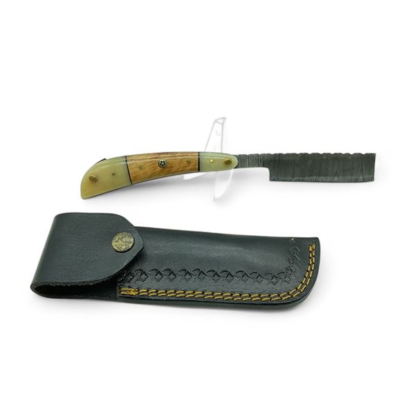 Folding Damascus Razor Blade with Leather Belt Sheath