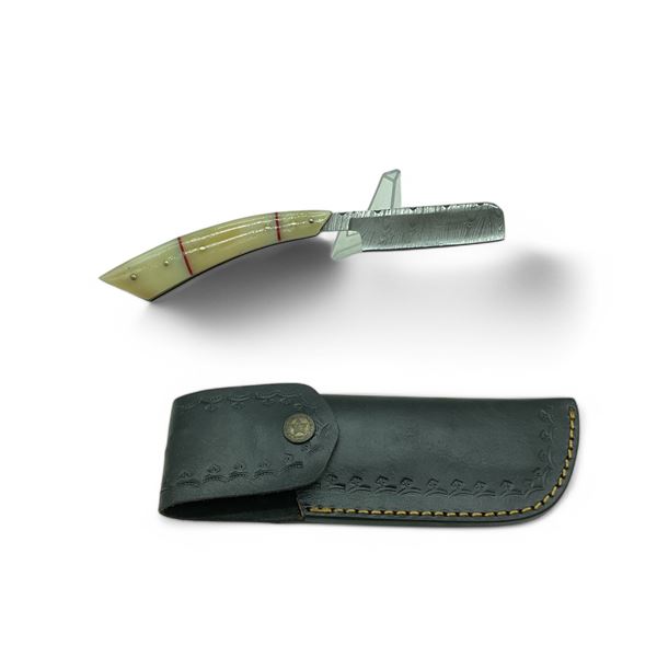 Folding Damascus Razor Blade with Bone Handle and Leather Belt Sheath