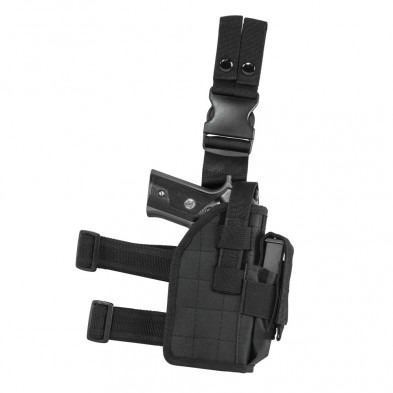 This Universal Holster features an adjustable Thumb Snap to secure your pistol in the holster, a single Magazine Pouch on the front edge of the holster, two adjustable slip resistant Thigh Straps with Quick Release Buckle, adjustable for height Drop Leg Strap with Quick Connect Buckle, and dual Belt Loops with thumb snaps.