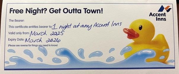 Donated by Accent Inns – 1 free night at any Accent Inns valid between March 2025 – March 2026.
