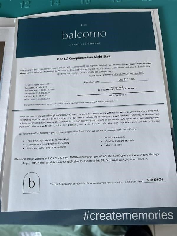Gift certificate for one complimentary night's stay at Balcomo - Ramada by Wyndham hotel in Penticton. Valid for one Courtyard Upper Level Two Queen Guestroom at Balcomo in Penticton.