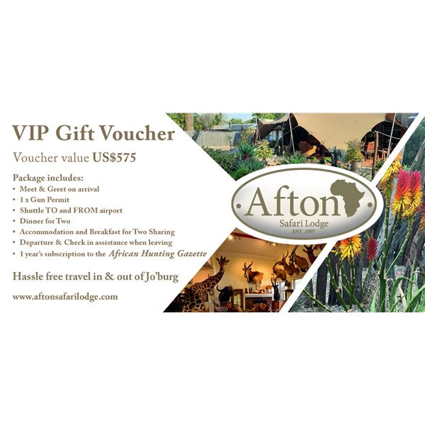 The package includes their VIP meet and greet service at Johannesburg airport, gun permits for one, shuttle and a one-night stay at Afton Safari Lodge in Johannesburg for two with shared accommodations, it also includes Afton's legendary steak dinner and breakfast the following morning as well as a one-year subscription to the African Hunting Gazette!