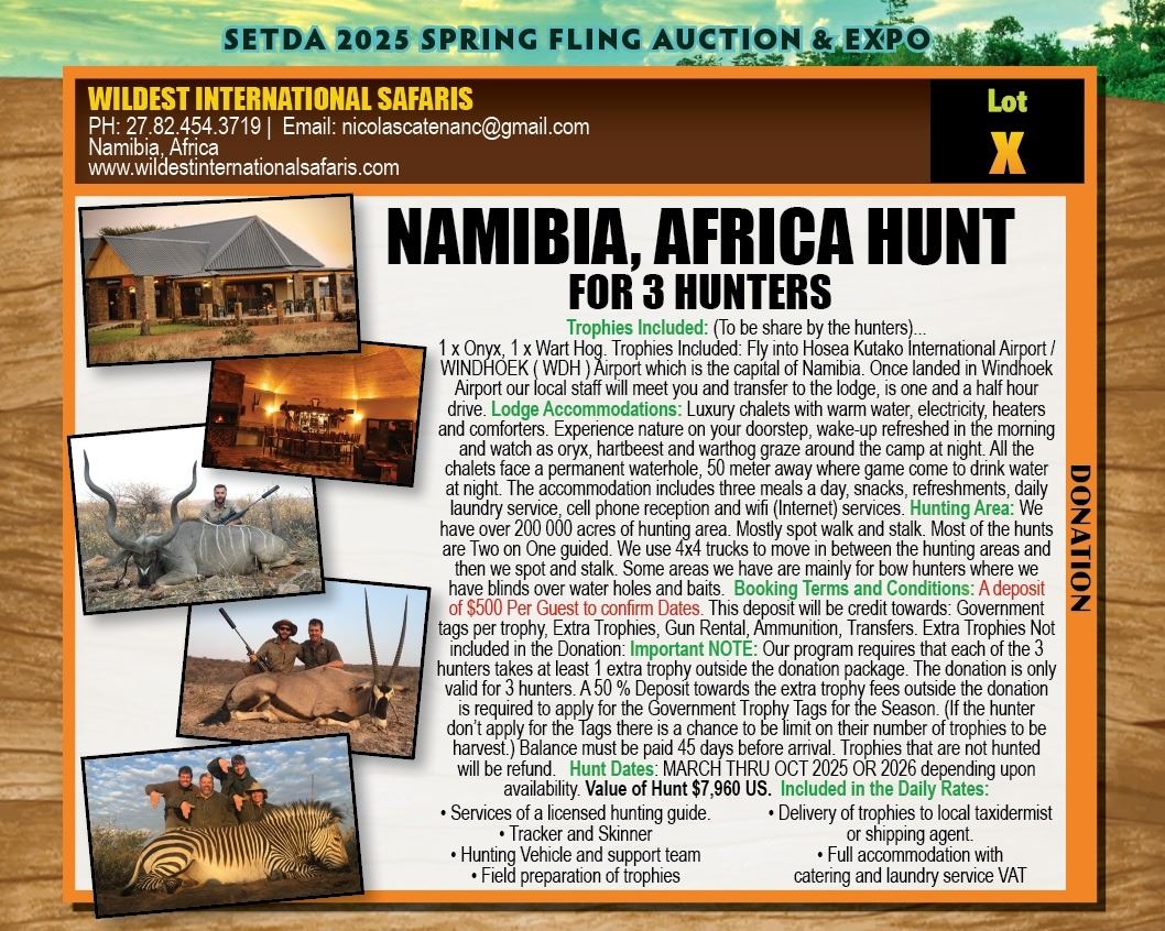 Lot 8 Wildest International donates Namibia for 3 hunters for 6 days for Oryx and Warthog. Val.$7,960.