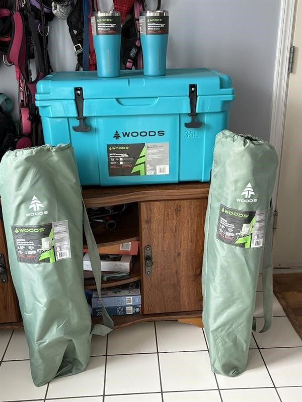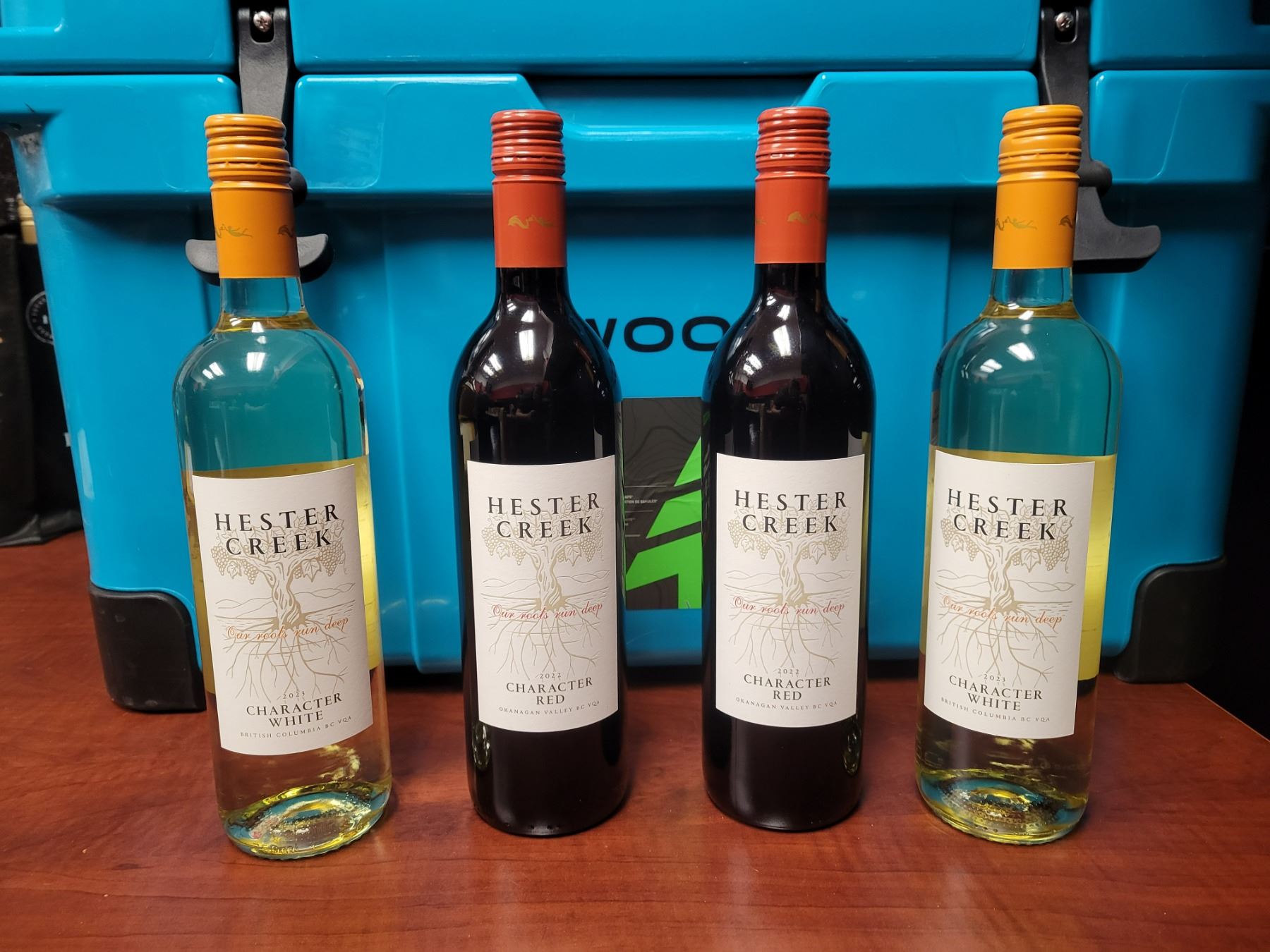 Woods Camping Package featuring 2 travel mugs in teal, a matching teal cooler and 2 camping chairs. This fantastic package also includes a bonus of 4 bottles of wine! There are 2 bottles of Hester Creek Character White, as well as 2 bottles of Hester Creek Character Red.