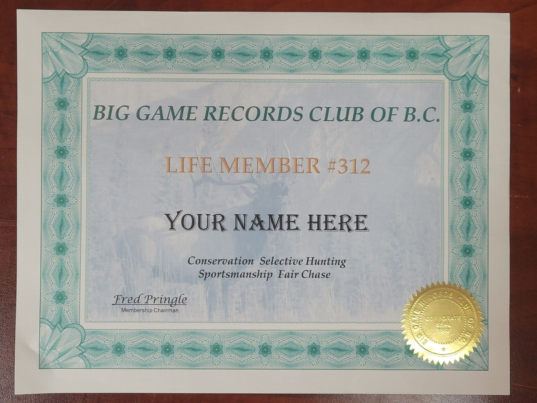 This certificate entitles the winner to a life membership with the Big Game Records Club of BC.