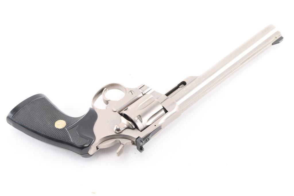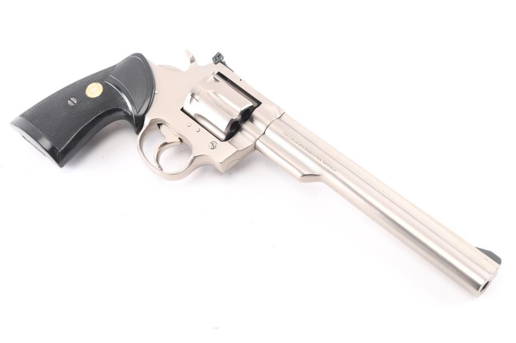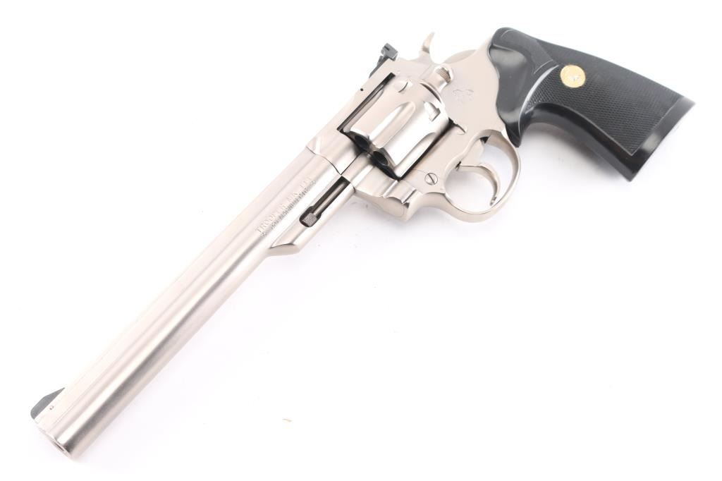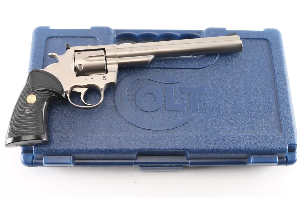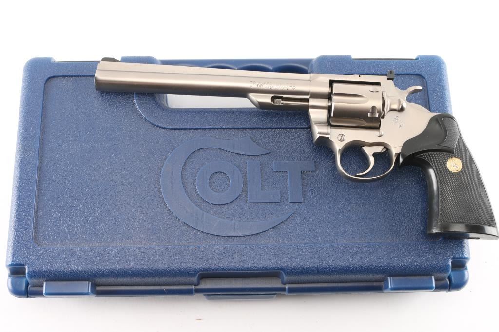 Double-action revolver chambered in .357 Magnum, circa 1968. Features a satin electroless nickel finish, 8" barrel with a solid top rib, shrouded ejector rod, raised, serrated & pinned ramp front sight, pinned adjustable square notched rear sight, fluted six-shot cylinder, smooth trigger, knurled wide hammer spur, checkered black rubber Pachmayr target grips with Colt medallions. Bore is bright with strong rifling. Retains approx. 98% finish with little to no scratches, edge wear and or handling marks. Heavy cylinder drag line. Grips are excellent. Includes factory blue plastic case. Condition is NRA excellent.***C&R Firearm***