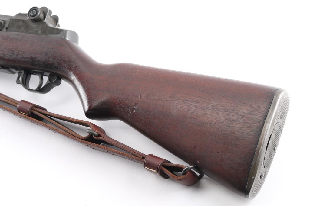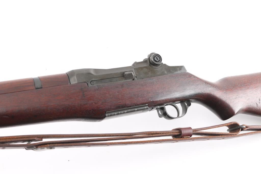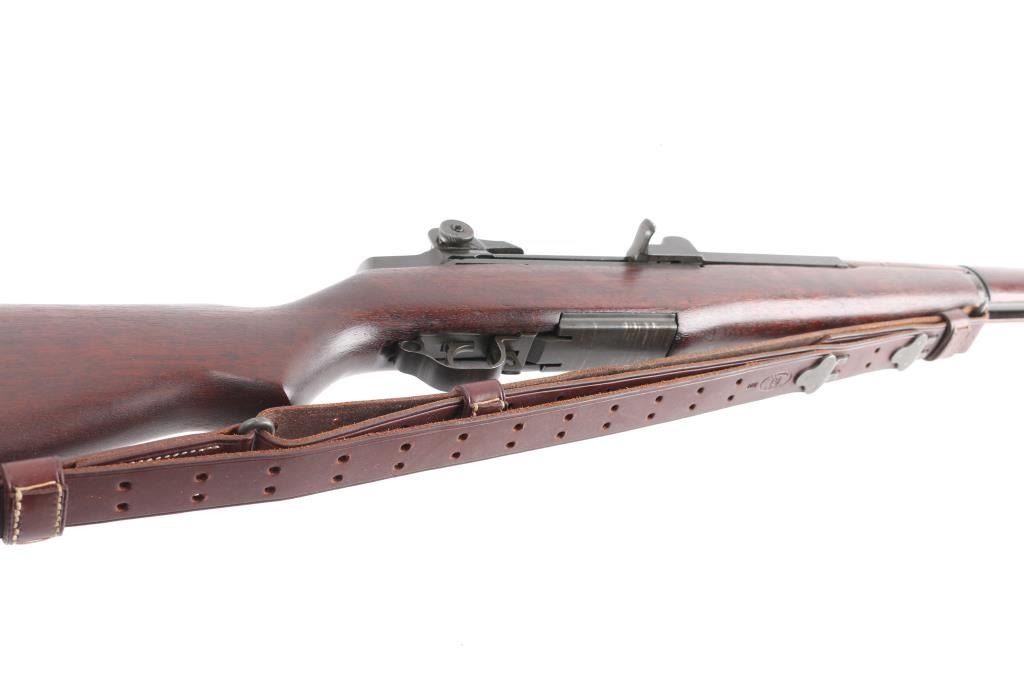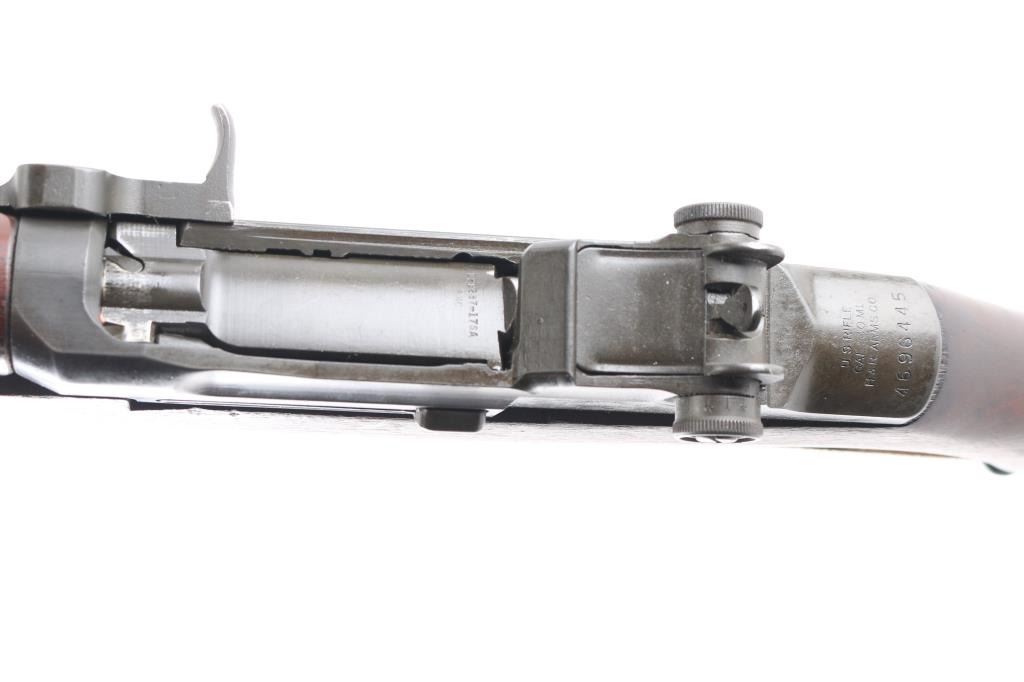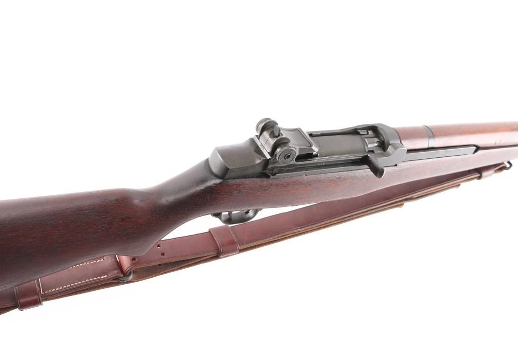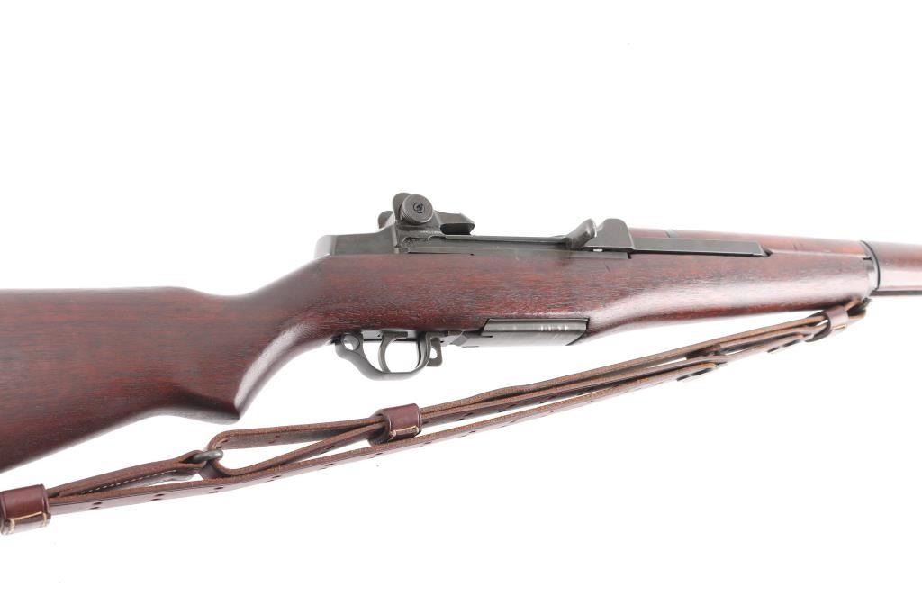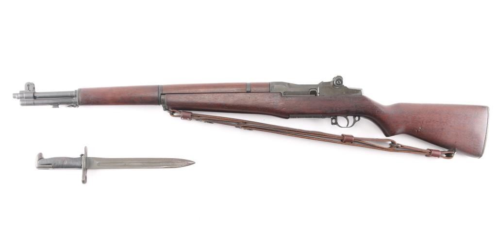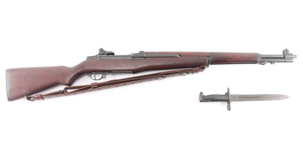 Korean war era US military semi-automatic rifle, manufactured circa 1953. Features parkerized finish, wood stock & hand guards, 24" barrel, adjustable sights with protected front blade & protected rear peep, fixed magazine for en-bloc clip, manual safety. Trigger guard has stamped style trigger guard. Barrel marked "HRA D6535448 12-53 RS26 ". Bolt marked "D282287-17SA B4C". Rear sight marked "DRC IHC". Includes correct type M1907 sling by Turner Saddlery. Bore is excellent/bright, finish is excellent with very minor edge wear, action is crisp/tight, and the wood is excellent with no cartouches. All markings are crisp/clear. Comes with correct bayonet, 10" parkerized blade marked "OL US with flaming bomb in between 1943". No scabbard. Comes with 3 en-bloc clips.NRA Condition-Excellent. C&R Firearm