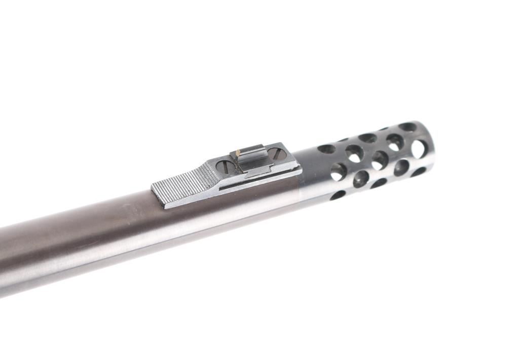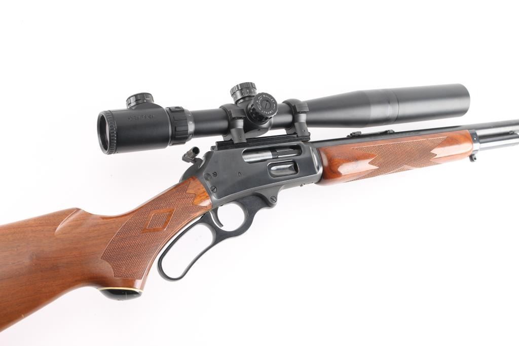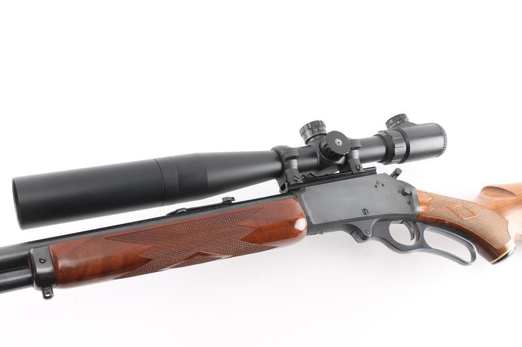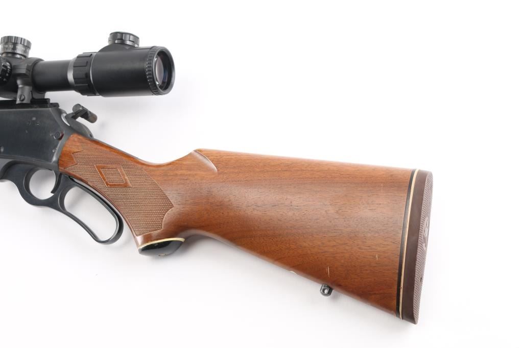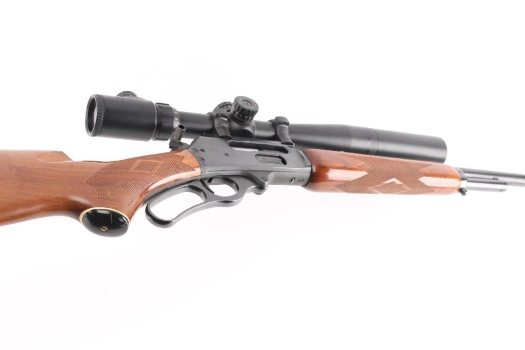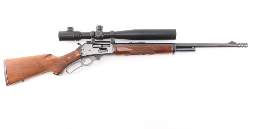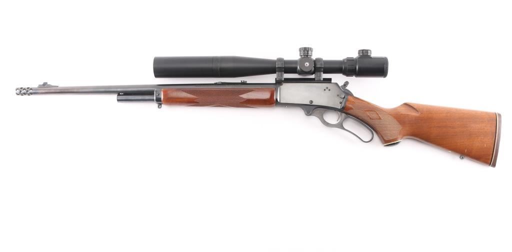 Lever action rifle manufactured circa 1996. Features blued finish, 23 5/8" barrel with muzzle brake, serrated ramp blade/beaded front sight, folding adjustable rear sporting sight, mounted Barska 3.5 X 10 Scope, 2/3 length magazine tube, pushbutton safety, sling swivel studs. Checkered walnut stocks with curved wrist, brown rubber Marlin butt pad, blued steel forend cap, black plastic grip cap, white spacers. Bore is pristine with strong rifling. Retains 98% blue with little to no handling marks. Wood is very good with small scratches on bottom of stock. Scope is clear.NRA condition is Excellent.*** Modern Firearm ***