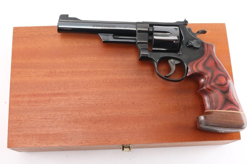 The 1955 model .45 Target Heavy Barrel Large frame double action revolver chambered in .45 Automatic, circa 1961. Features a blued finish, pinned 6 1/2" heavy barrel with serrated wide sighting rib, raised ramp Patridge front sight with red painted dot, micrometer click white box rear sight, fluted six-shot cylinder, shrouded ejector rod, case colored serrated .500" wide target trigger and .500" wide checkered target hammer, three screw square butt N target frame and a smooth finger groove rosewood/walnut HOGUE Mono Big Butt Revolver Grip with ICORE stamp on bottom. Revolver exhibits approximately 98% of its original finish with rust and faint drag line on cylinder, minor scratches on frame. Action is smooth with tight lock-up, the bore is pristine and the wood grip is excellent. Includes the original shipping carton with factory cardboard box with cleaning tools, moon clips, manual and presentation case. NRA Condition is good+.***C&R Firearm***