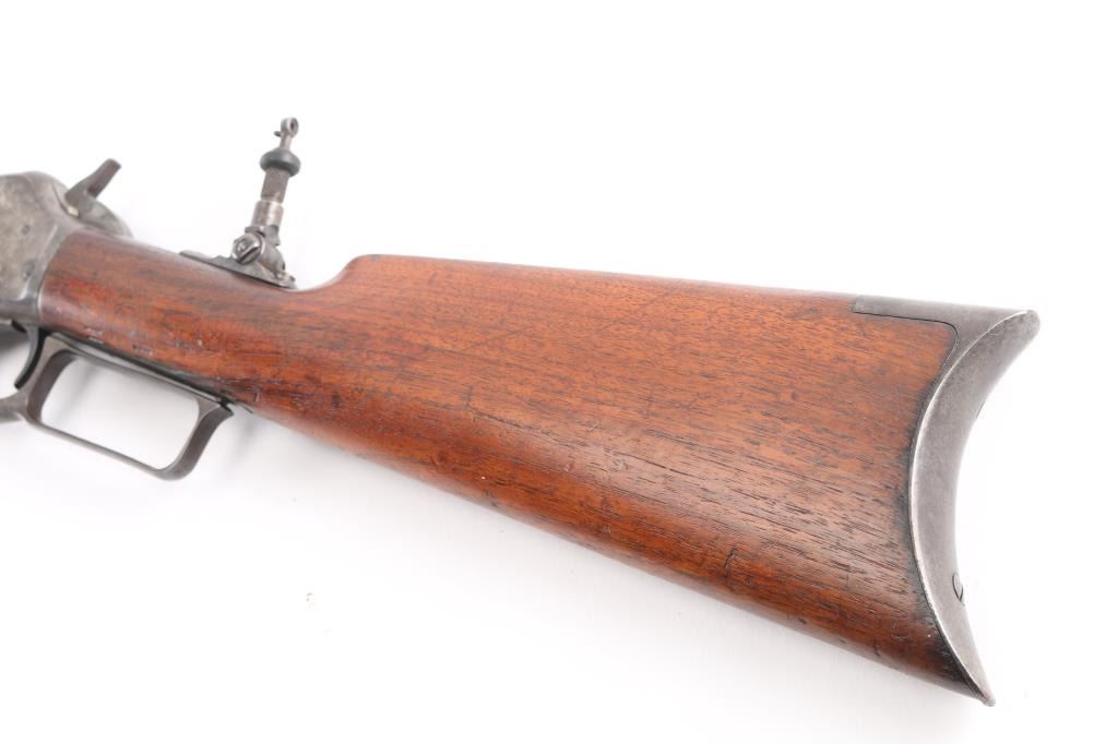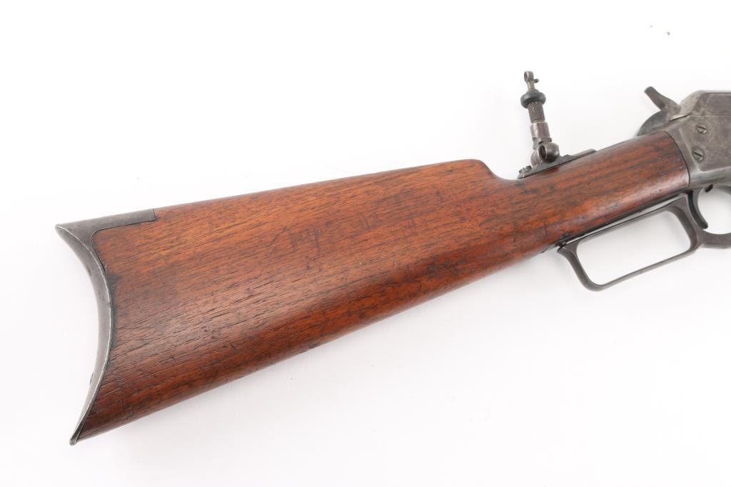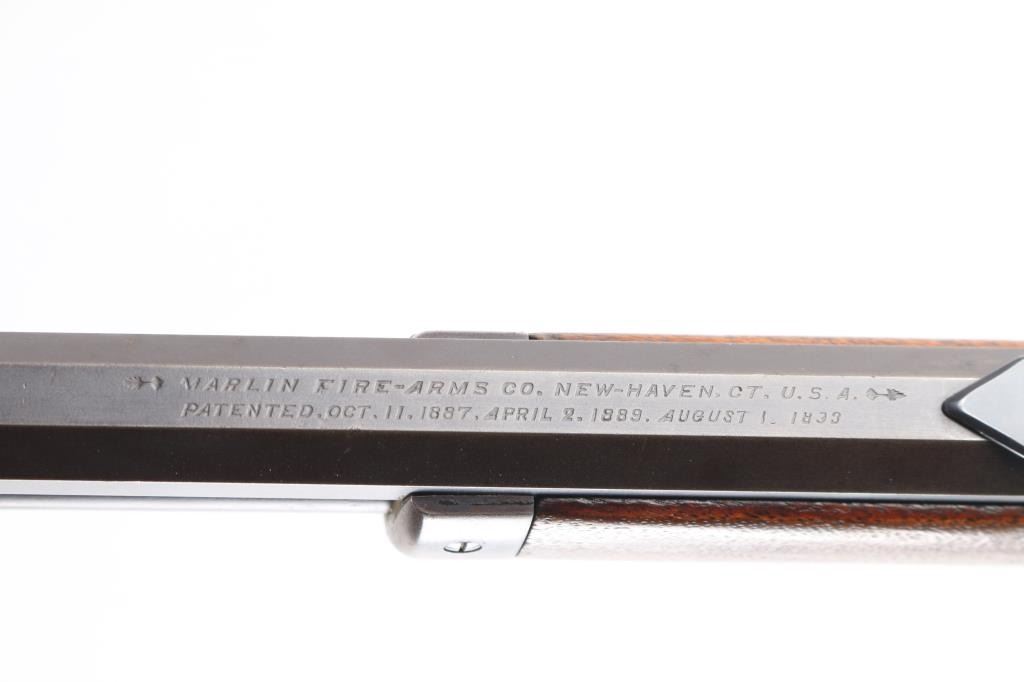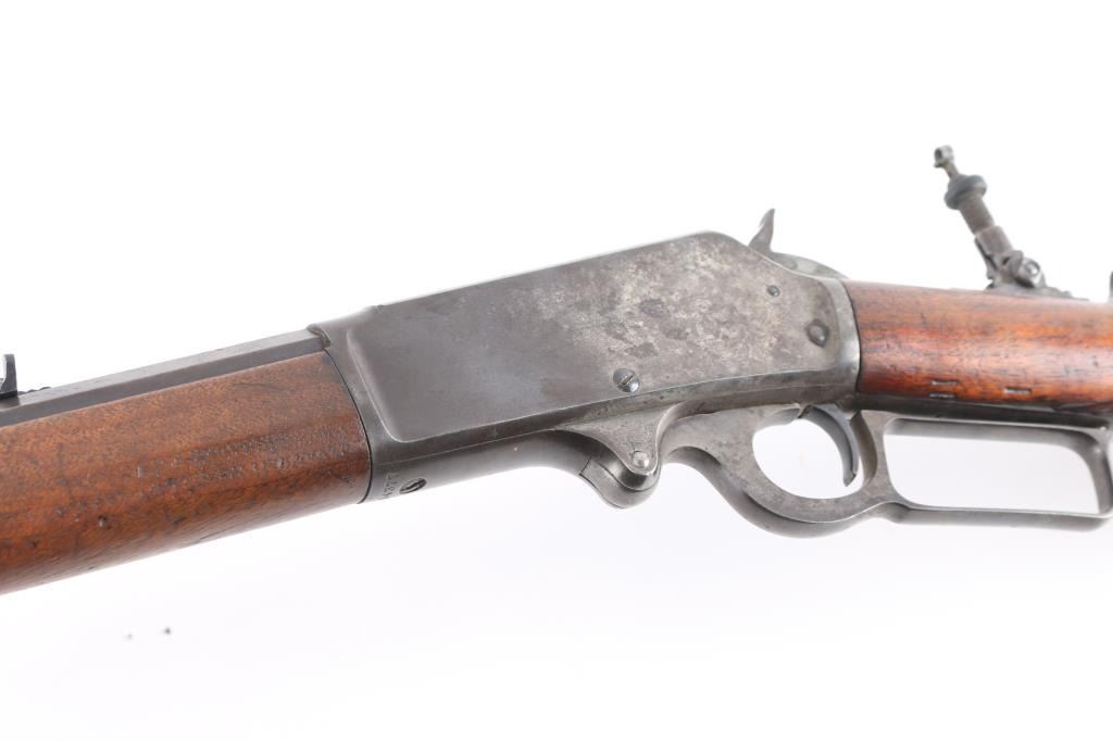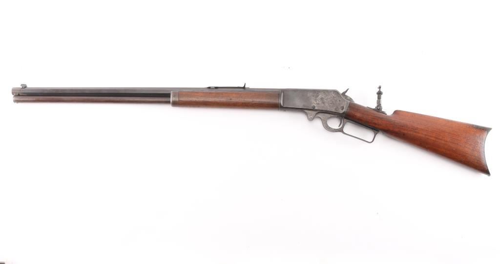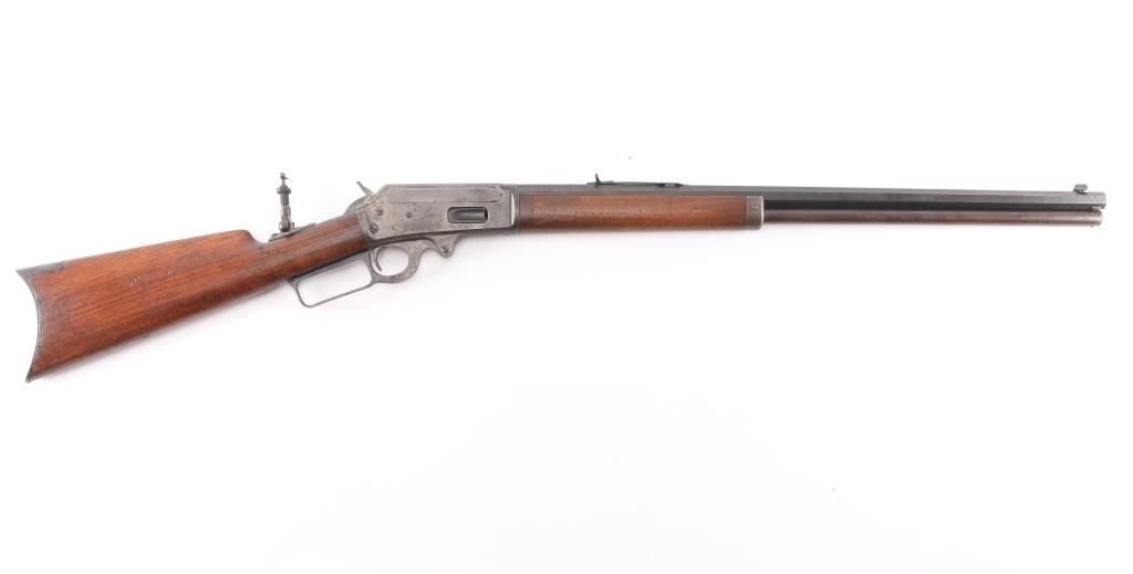 Marlin Model 1893 chambered in .32-40 Winchester. Lever Action Rifle manufactured 1899. This Marlin Model 1893 has a 24” inch octagon barrel with a full length magazine tube. The front sight is a blade/bead, elevator-adjustable semi-buckhorn rear sight. The barrel has the two-line Marlin address and caliber marking roll-stamped on the top flat. Left flat is marked "Special Smokeless Steel." The top of the receiver is marked “Marlin Safety”. The upper tang shows the model number (covered by sight) and the serial number on the bottom of the receiver. The barrel and magazine tube are blued steel and the forearm cap, receiver, hammer, loading lever and crescent-shaped butt-plate are color-case hardened. The stocks are made of straight-grained smooth walnut forearm and the straight-grip buttstock, crescent steel buttplate. Folding aperture sight installed on tang. Bore is dark/rough, worn rifling, action is smooth, stocks are good/sound, minor scratches/dings and the blued finish has dulled with the tube turning a brown patina from handling, just feint traces of case color turned a dark gray patina with some scattered pin-prick pitting, mostly on the right receiver/lever.NRA Condition-Fair to Good. C&R Firearm.