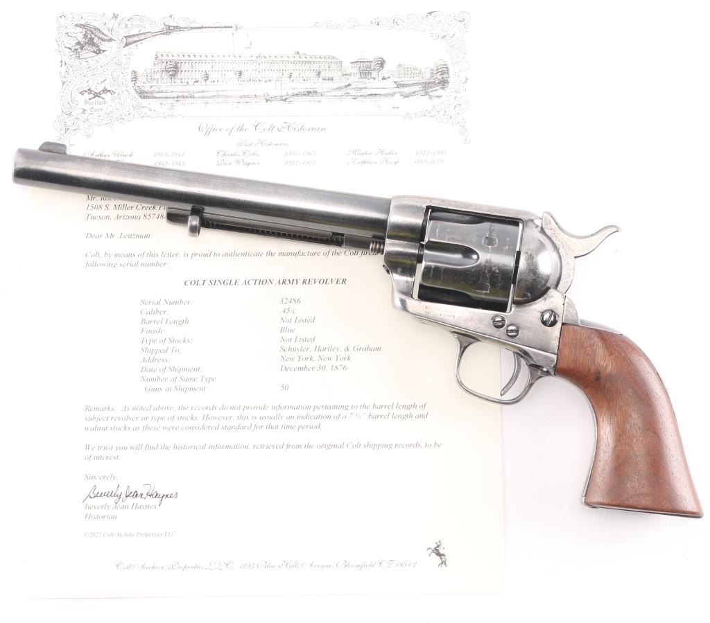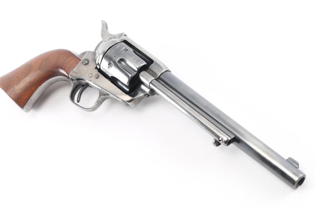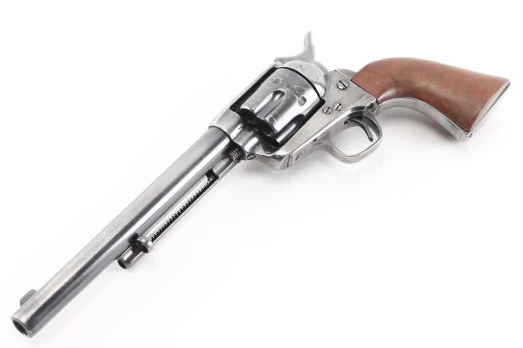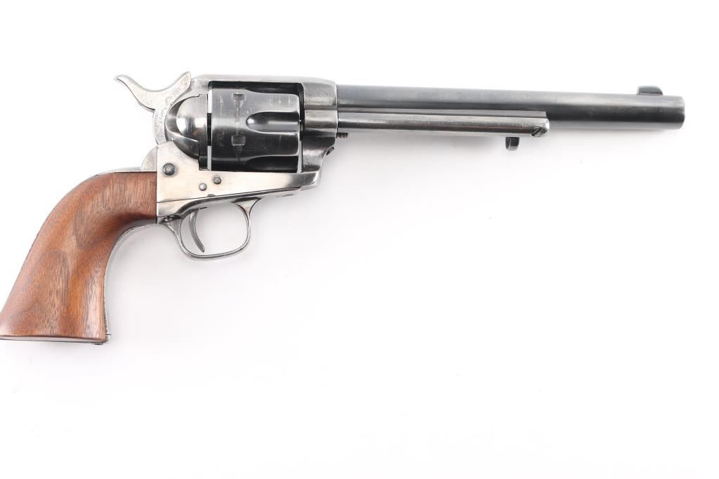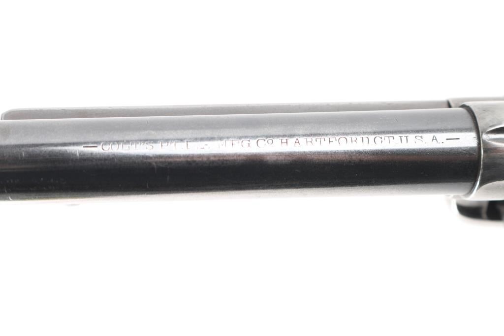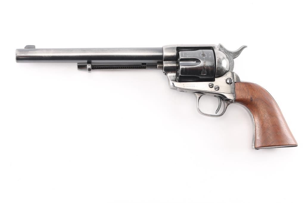 1st Generation Single action revolver manufactured in 1876 w/ factory letter. 3rd year of manufacture. Revolver has had some refurbishing over the years. Old reblued finish. Features 7-1/2" barrel, fixed sights, single piece walnut grip, round donut ejector rod head. Matching serial numbers on frame, triggerguard, backstrap and barrel under the ejector rod housing. Assembly number "1169" on loading gate. One line Hartford address on barrel, 2 line patent dates on left frame. Cylinder face stamped "H". Screw type base pin for black powder frames but the pin is not original to the gun. Bore is somewhat bright, retains good rifling with scattered patches of pin-prick pitting. Charge holes are very good. Blue is about 50%, mostly on the barrel and cylinder with holster/handling wear. Frame has traces of case color, also on the hammer. The grips are near excellent and appear to be later replacements. Markings are mostly sharp with some handling wear to the patent dates but are still readable. Action is crisp/smooth with tight lock-up.NRA Condition-Very Good+ as Refinished. Antique Firearm.