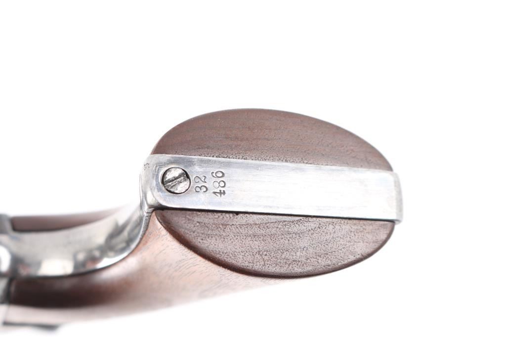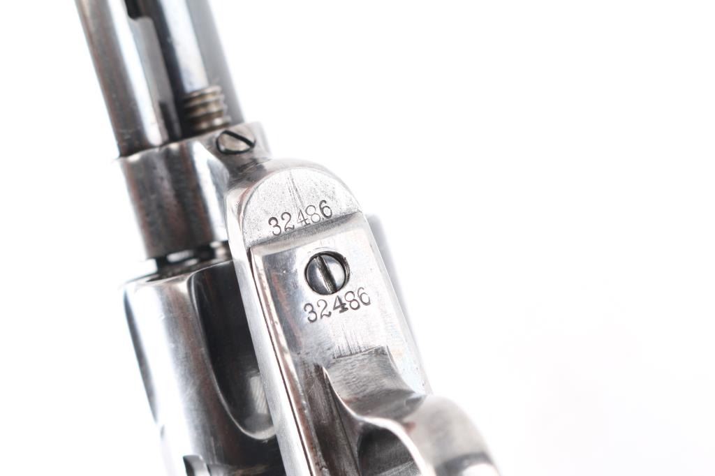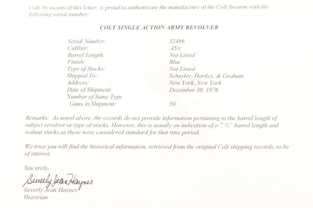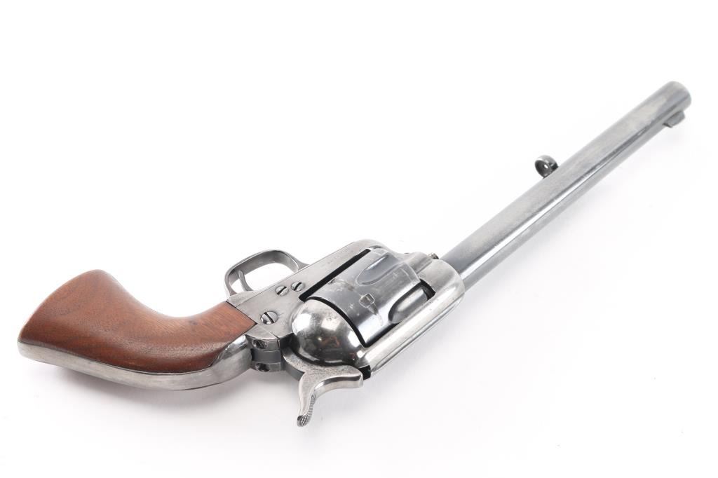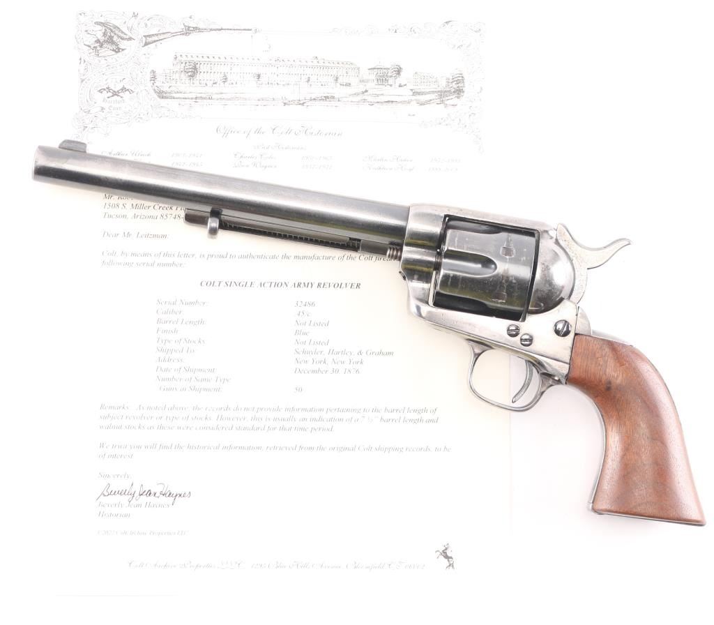 1st Generation Single action revolver manufactured in 1876 w/ factory letter. 3rd year of manufacture. Revolver has had some refurbishing over the years. Old reblued finish. Features 7-1/2" barrel, fixed sights, single piece walnut grip, round donut ejector rod head. Matching serial numbers on frame, triggerguard, backstrap and barrel under the ejector rod housing. Assembly number "1169" on loading gate. One line Hartford address on barrel, 2 line patent dates on left frame. Cylinder face stamped "H". Screw type base pin for black powder frames but the pin is not original to the gun. Bore is somewhat bright, retains good rifling with scattered patches of pin-prick pitting. Charge holes are very good. Blue is about 50%, mostly on the barrel and cylinder with holster/handling wear. Frame has traces of case color, also on the hammer. The grips are near excellent and appear to be later replacements. Markings are mostly sharp with some handling wear to the patent dates but are still readable. Action is crisp/smooth with tight lock-up.NRA Condition-Very Good+ as Refinished. Antique Firearm.