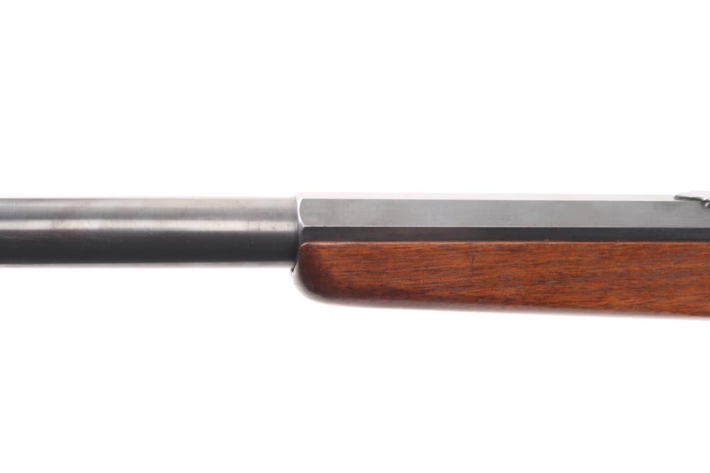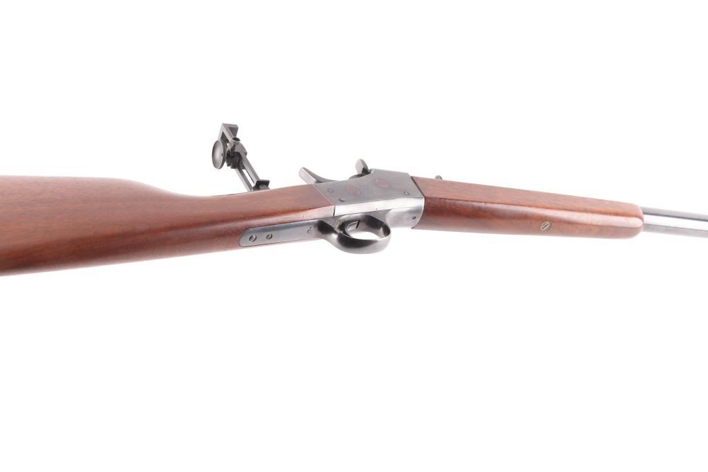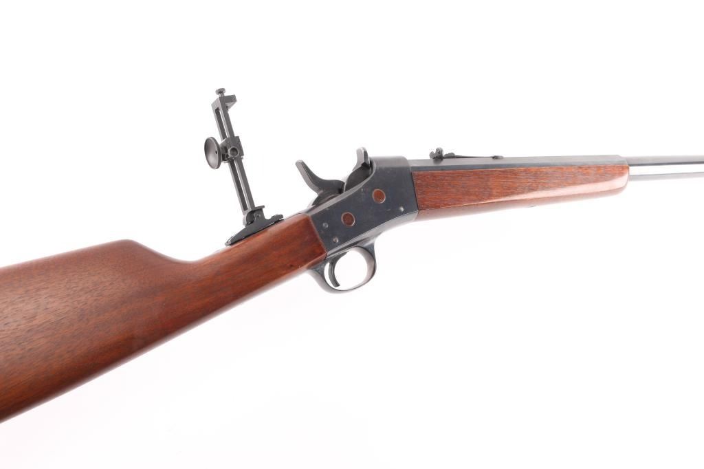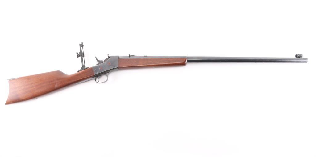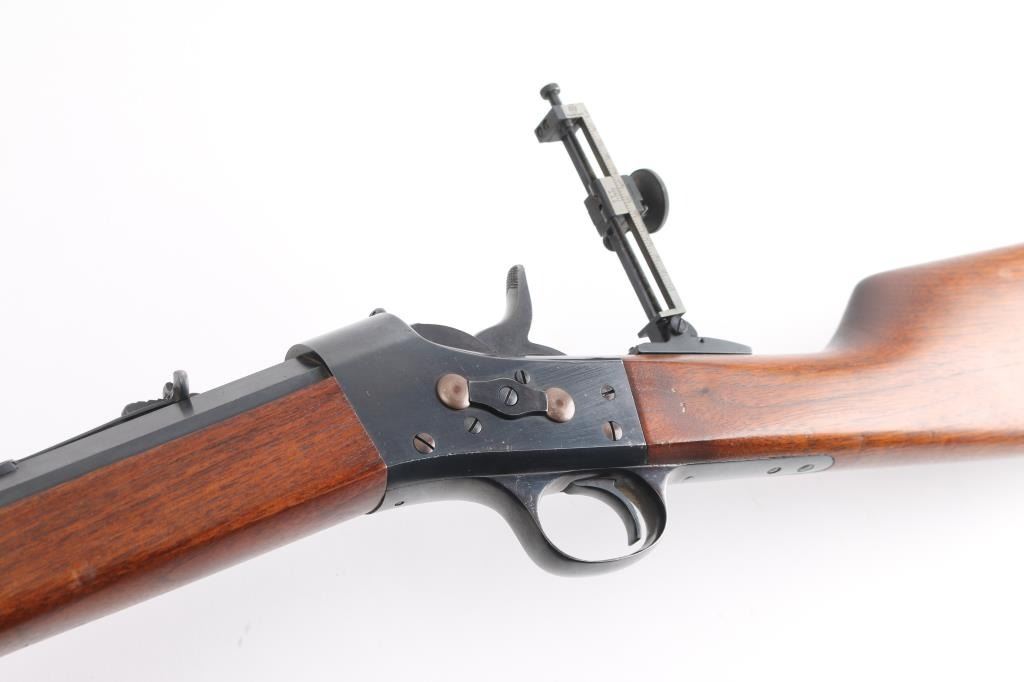 Custom rolling block single shot rifle. Features a 31 1/2" part octagon heavy barrel, globe front sight with post insert, dovetail adjustable sporting rear sight and a Pedersoli Vernier tang sight with variable aperture diopter, smooth trigger, knurled hammer spur, smooth walnut forend and straight grip shoulder stock with crescent metal buttplate. The barrel exhibits approximately 95% of its blued finish showing some faint scattered pin prick pitting and slight edge wear. Action is smooth/tight, the bore is bright with very strong rifling, wood stocks are very good with one dent on the bottom left forearm and some on stock. NRA condition is excellent.***C&R Firearm***