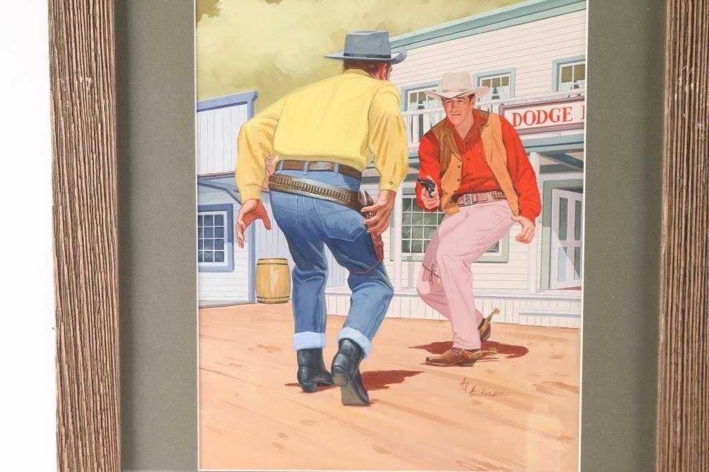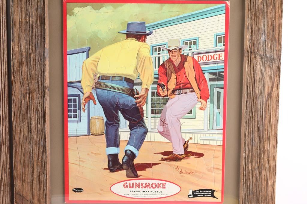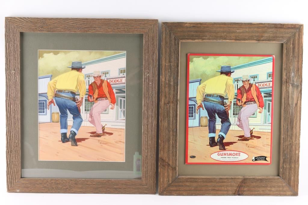 Also known as Matt Dillon of "Gunsmoke". Hand-signed lower right hand corner by Al Andersen. Includes a puzzle off this artwork dated 1960. Measures 14 1/4" x 11 1/4". Both are framed alike in barn wood frames. Al Andersen (20th century) was active/lived in United States. Al Andersen is known for Illustration art.