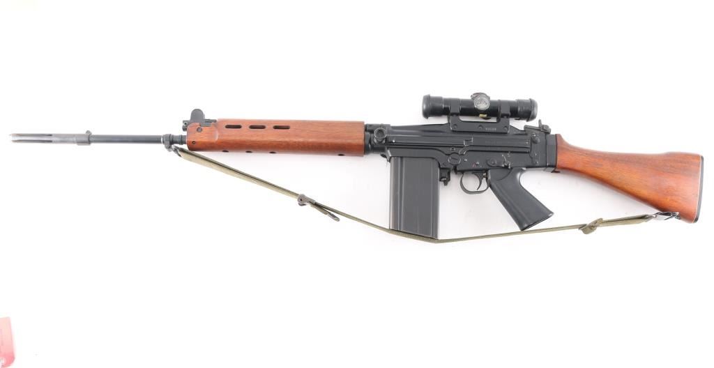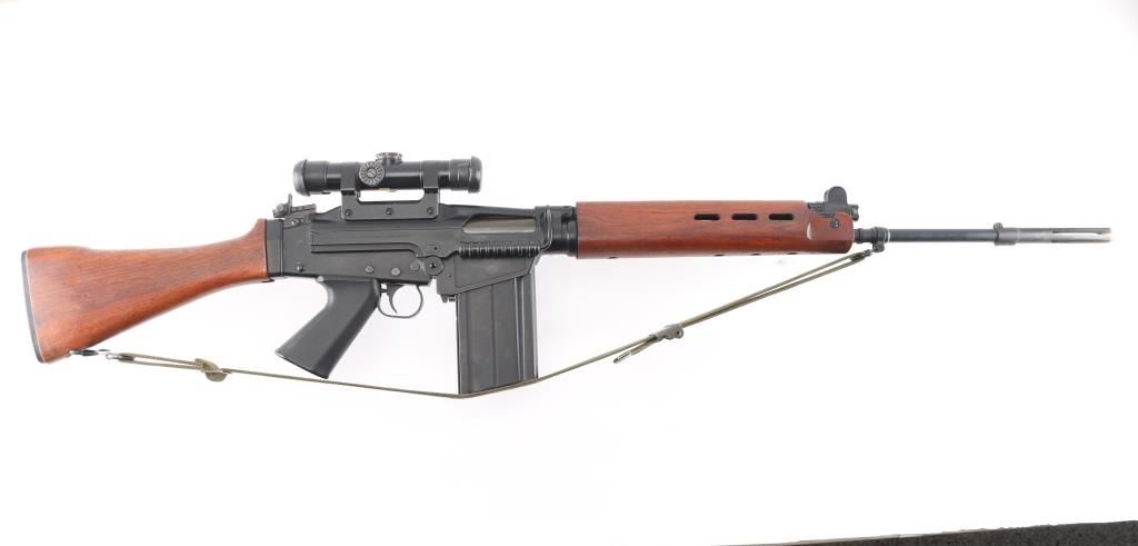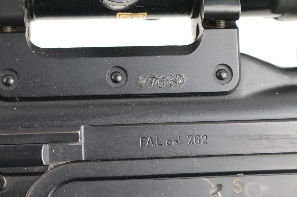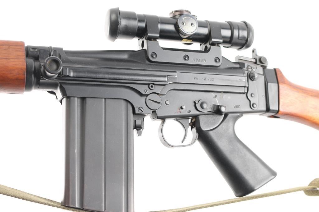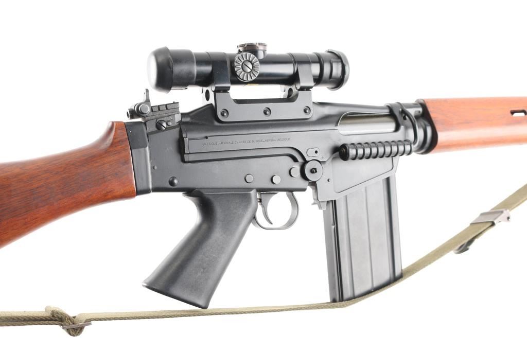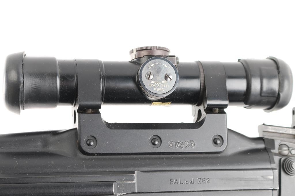SN: G880. Scarce and Desirable Fabrique Nationale G Series FAL Semi-Automatic Rifle. Produced in Belgium, this rifle is part of a limited importation run performed by Browning Arms in the early 1970s. Originally given a green light by the ATF, an exemption was granted for the rifles that had already brought into the country before the ATF reversed their position, due to the use of sear pocket equipped receivers in the G-series. Post front and military tangent peep sights, with a long flash hider, bayonet lug, and adjustable gas port with grenade setting .Carrying handle, 20" round barrel, 24" with removable ported flash hider. The left side of the upper receiver is marked "F.A.L. cal. 7.62", and the trigger housing has the "S/R/A" selector markings, with the "A" position disabled via selector. Fitted with a smooth plastic pistol grip and a fine hardwood ventilated forearm and buttstock set. Metal buttplate. Includes a green web sling. Mounted with a German made Hensoldt Wetzlar ZF 7.62x51-4x scope. The design of the scope was owned by the West German government post WWII. scopes issued to German Bundeswehr are marked with a supply number 12-120-9556, which this one has. Rubber lens covers, German 3 post reticle, clear optics. Rifles wood and matte black finish are excellent, action is smooth and the bore is excellent/bright. Near new condition.NRA condition-Excellent. C&R Firearm.