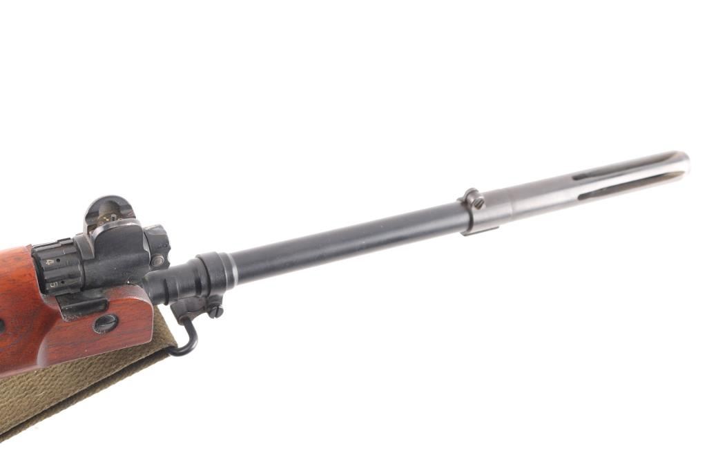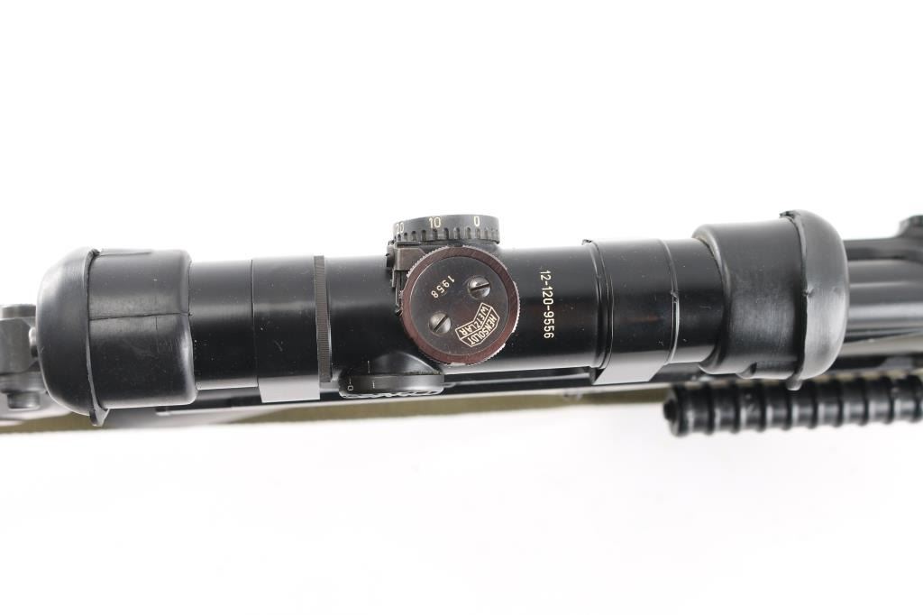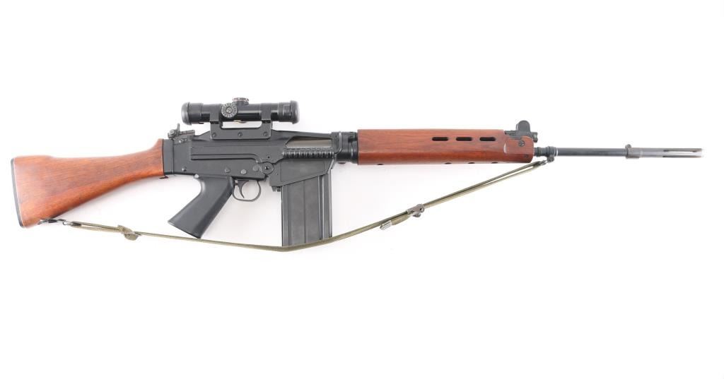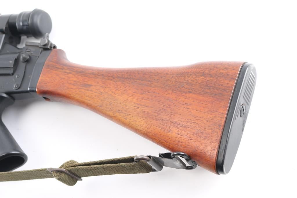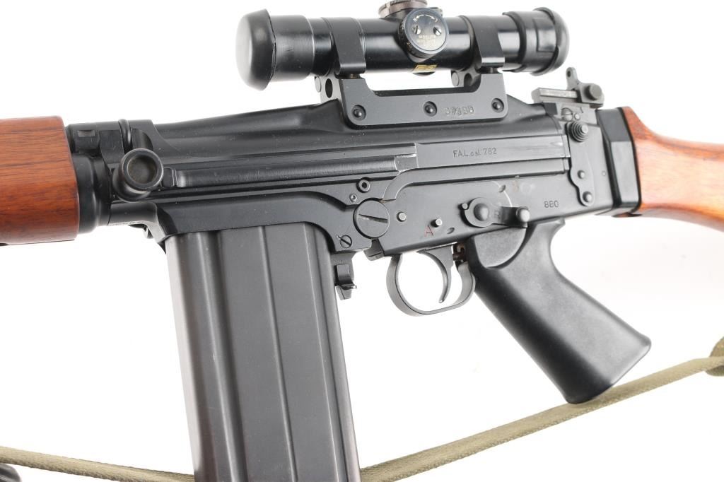 SN: G880. Scarce and Desirable Fabrique Nationale G Series FAL Semi-Automatic Rifle. Produced in Belgium, this rifle is part of a limited importation run performed by Browning Arms in the early 1970s. Originally given a green light by the ATF, an exemption was granted for the rifles that had already brought into the country before the ATF reversed their position, due to the use of sear pocket equipped receivers in the G-series. Post front and military tangent peep sights, with a long flash hider, bayonet lug, and adjustable gas port with grenade setting .Carrying handle, 20" round barrel, 24" with removable ported flash hider. The left side of the upper receiver is marked "F.A.L. cal. 7.62", and the trigger housing has the "S/R/A" selector markings, with the "A" position disabled via selector. Fitted with a smooth plastic pistol grip and a fine hardwood ventilated forearm and buttstock set. Metal buttplate. Includes a green web sling. Mounted with a German made Hensoldt Wetzlar ZF 7.62x51-4x scope. The design of the scope was owned by the West German government post WWII. scopes issued to German Bundeswehr are marked with a supply number 12-120-9556, which this one has. Rubber lens covers, German 3 post reticle, clear optics. Rifles wood and matte black finish are excellent, action is smooth and the bore is excellent/bright. Near new condition.NRA condition-Excellent. C&R Firearm.