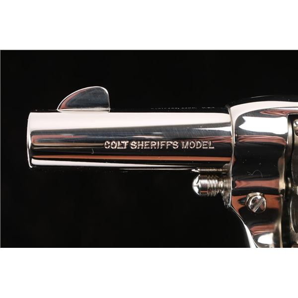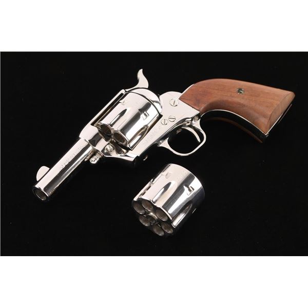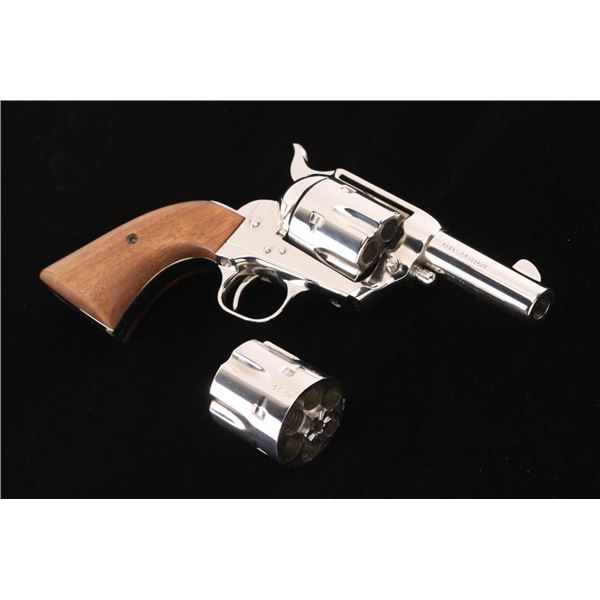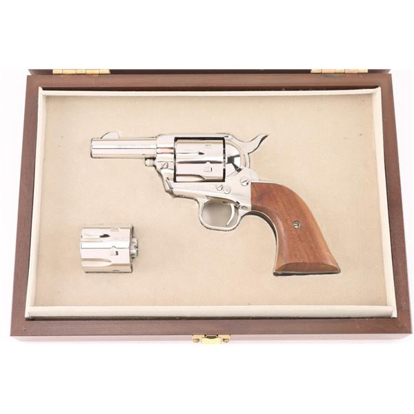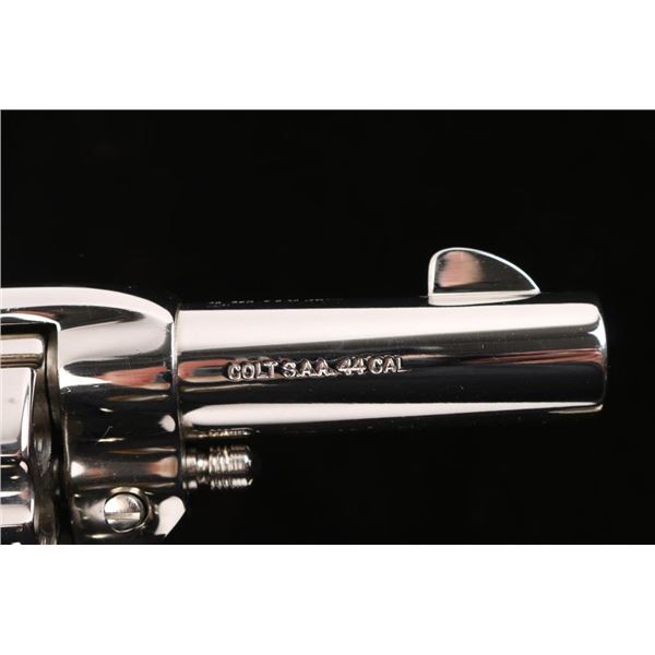 #SA41944 Third Generation Limited edition single action revolver chambered for .44-40 Winchester & .44 Special with convertible cylinders. Manufactured in Hartford, CT circa 1980. Feature a bright nickel plated finish, 3” round barrel, blade front sight, square notched rear sight, fluted six-shot cylinders, checkered hammer spur, smooth thin trigger, special frame without provision for an ejector rod, and two-piece smooth wood grip. Revolver exhibits little to no signs of use or wear. Action is mechanically sound, the bore is pristine and the wood grips are excellent. Includes a glass top presentation case with beige french fitted interior containing a .44 Special cylinder.Condition is near NRA Perfect.***Modern Firearm***