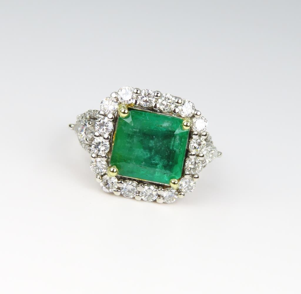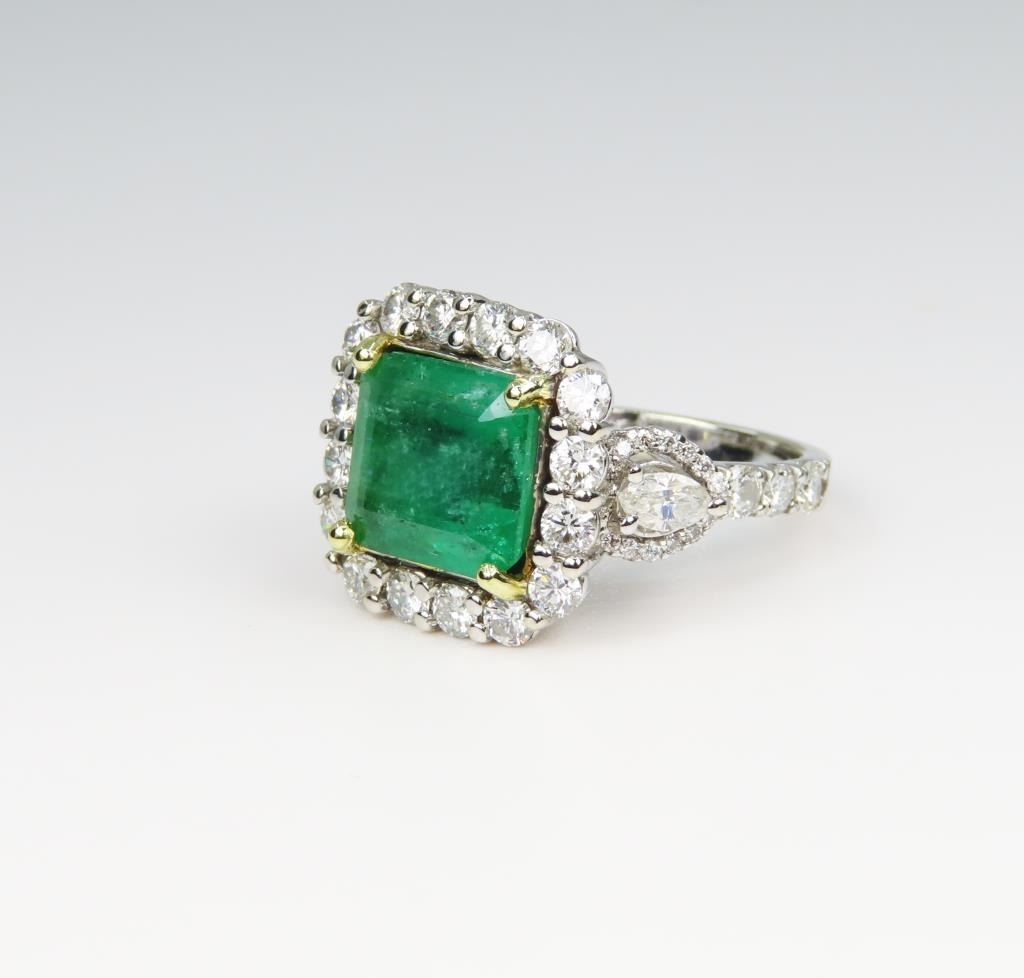 Green color weighing 4.36 carats with 50 round and marquise cut Diamonds weighing approx. 2.12 carats with G-H colors and VS clarity, set in an 18 karat white and yellow gold custom crafted setting, ring size 7. Full Retail Appraisal - $24,500.00.