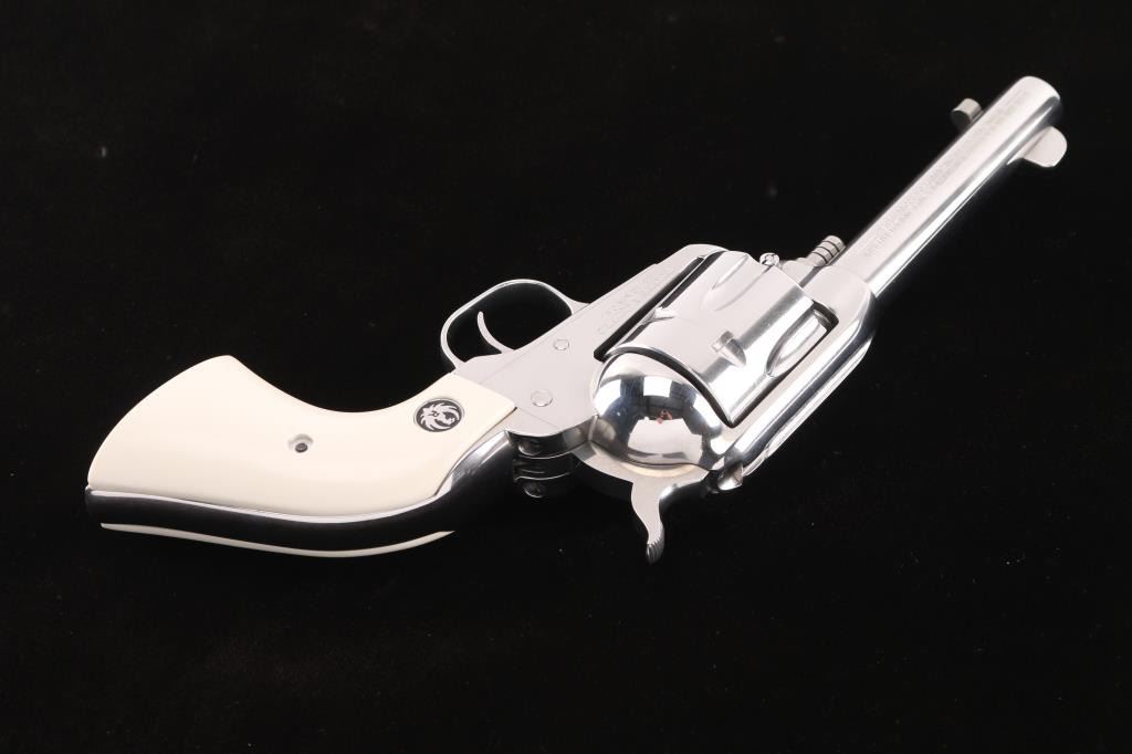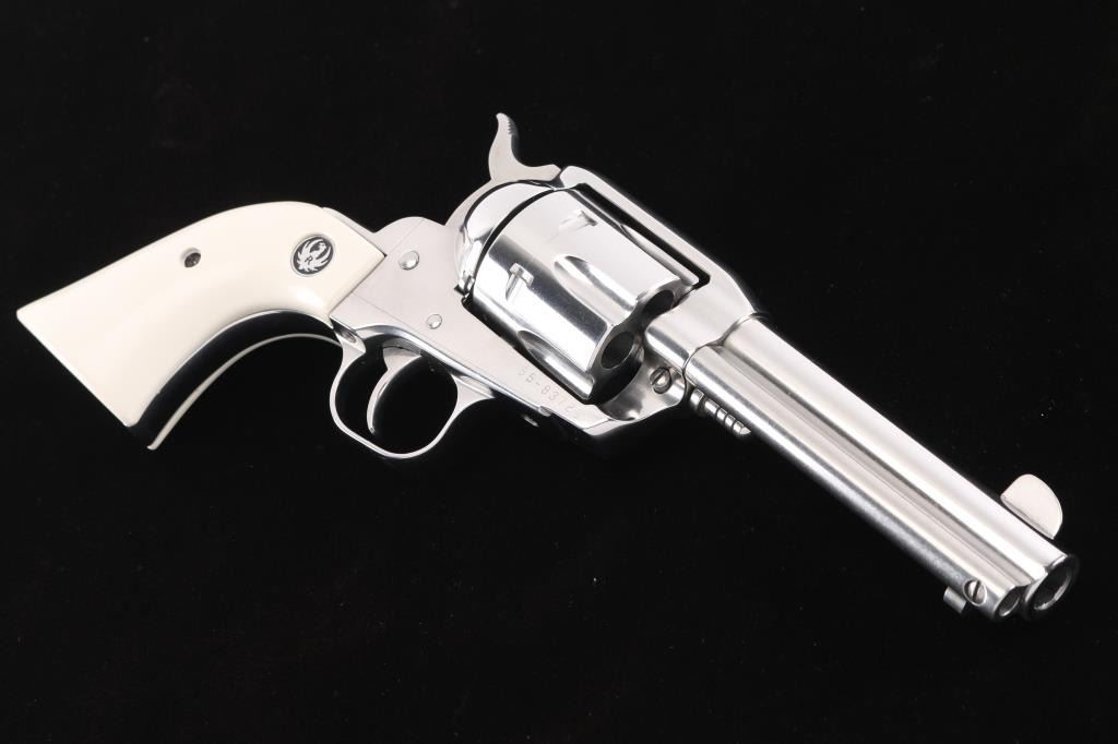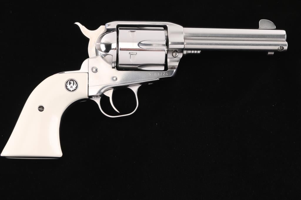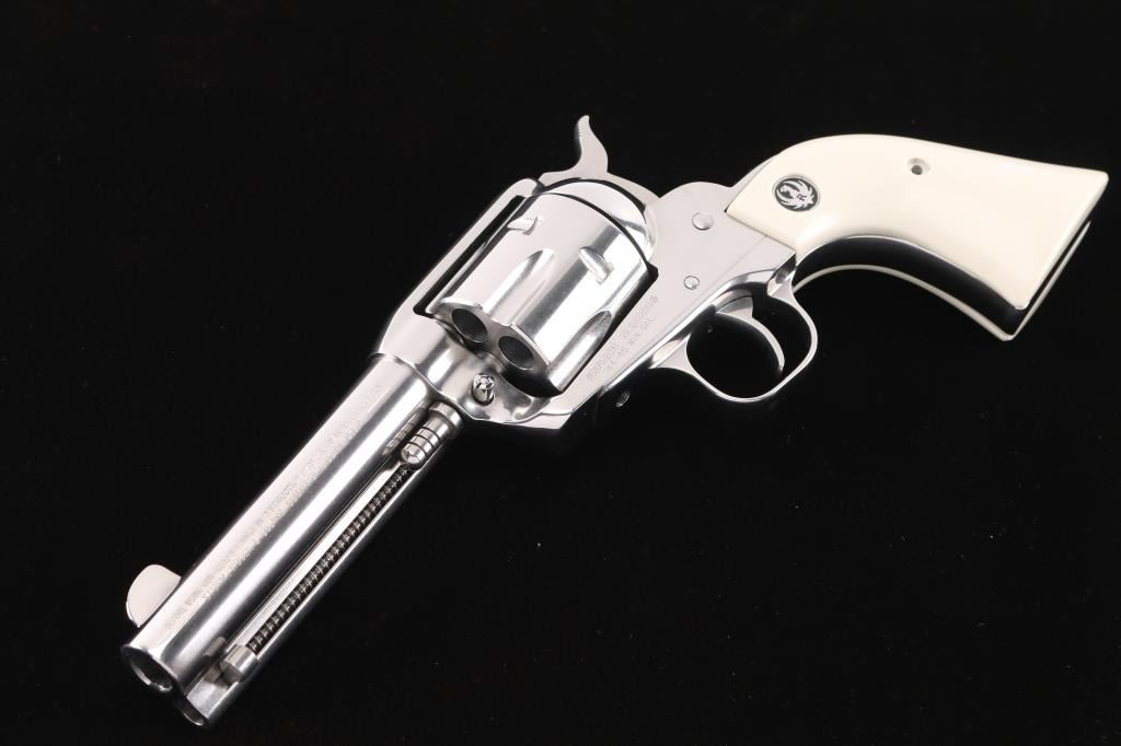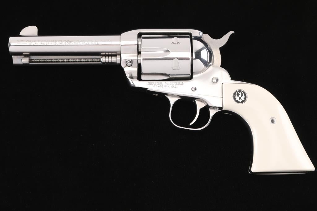 Stainless steel single action revolver chambered in .44-40 Winchester, circa 1995. Features a polished finish, 4.5" barrel, blade front sight, notched rear sight, fluted six shot cylinder, ejector rod, transfer bar safety, smooth trigger, serrated hammer spur, and two piece simulated ivory grips with Ruger medallions. Revolvers finish shows only a faint drag line. Action is smooth, bore looks good needs cleaned and wood grips are fine.Condition is NRA Excellent***Modern Firearm***