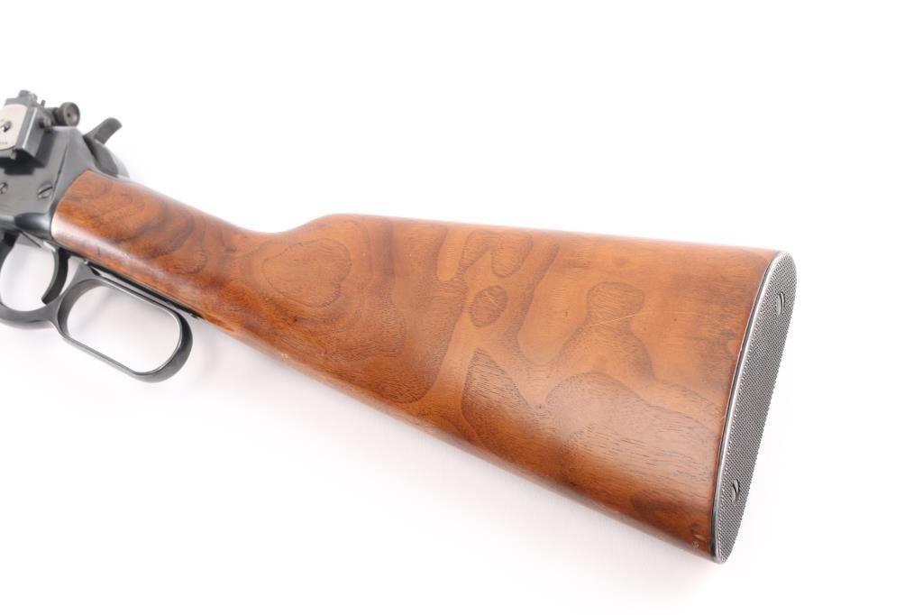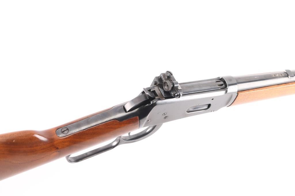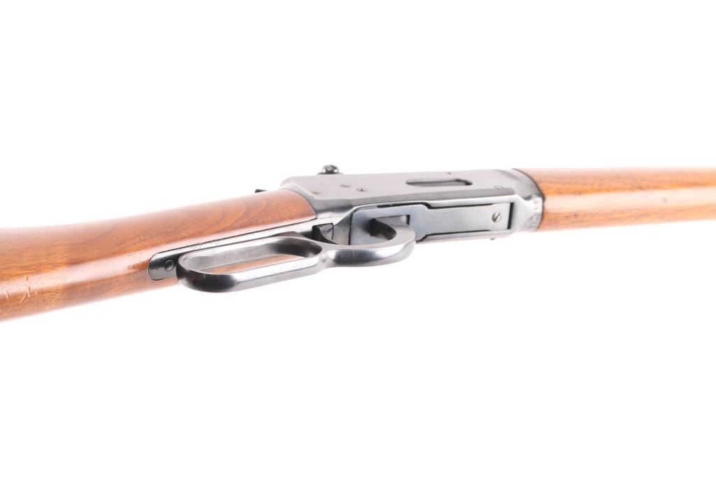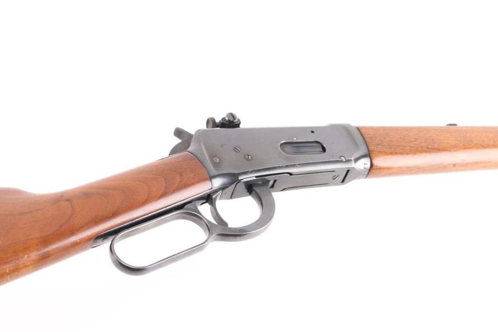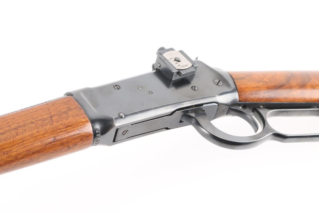 War time production Pre-64 Eastern Carbine Lever action repeating rifle manufactured in New Haven, CT circa 1942. Features a blued finish, 20" tapered barrel, full-length tube magazine, dovetailed blade front sight with white bead, rear sight removed, metal insert in dovetail, Lyman adjustable peep sight installed on the left side of receiver, smooth trigger, knurled hammer spur, two barrel bands, lever safety, smooth walnut forend and straight grip shoulder stock with carbine steel checkered buttplate. Bore is excellent, bright, strong rifling. Retains about 94% finish with minor edge wear/scratches. Wood is very good with minor scratches/dings. Action is smooth.NRA Condition-Very Good+. C&R Firearm.