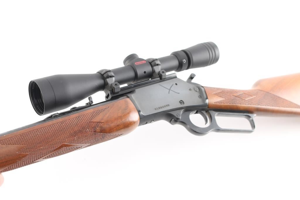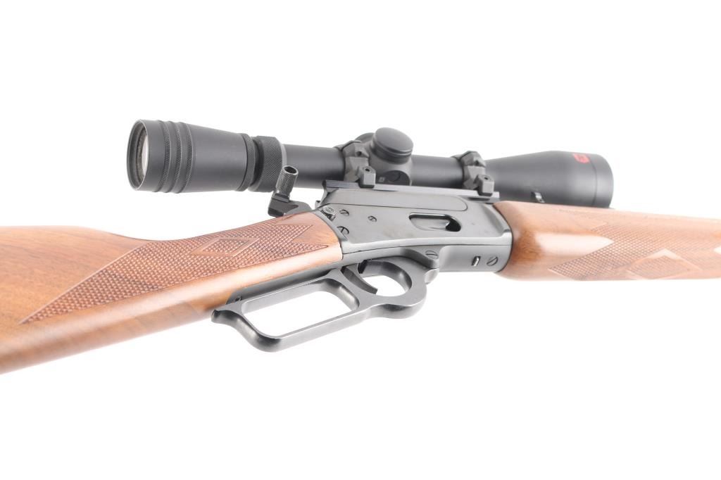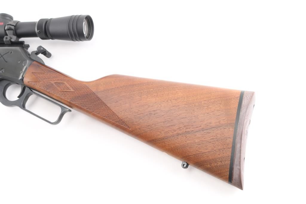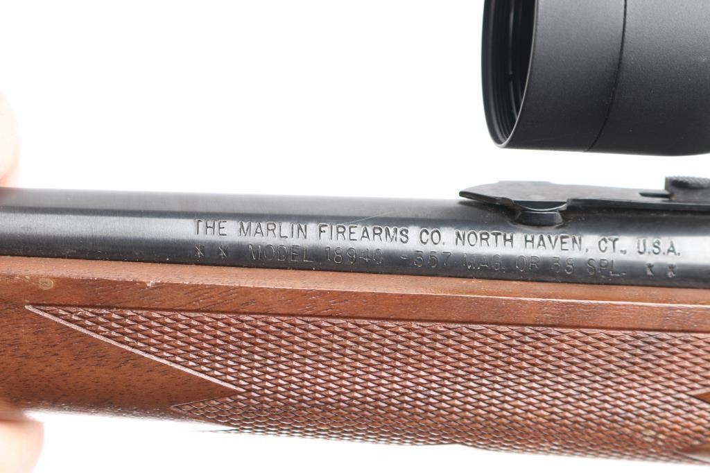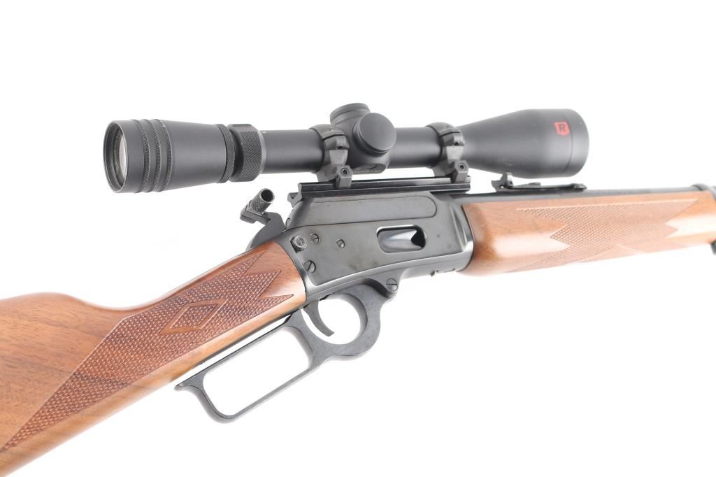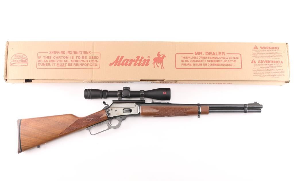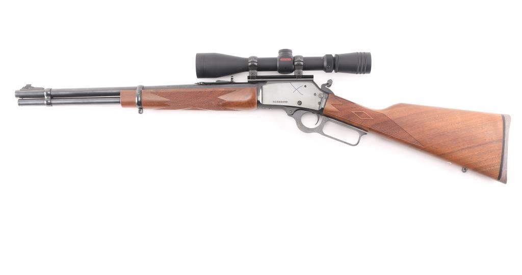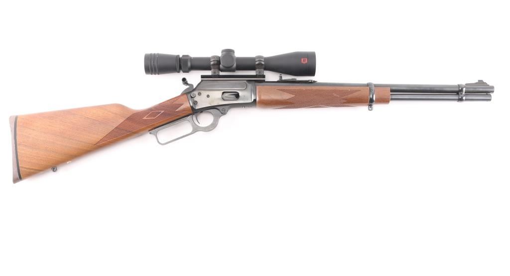 Lever action rifle chambered for .357 Magnum/38 Special cartridges. Features 18.5" blued barrel, blade/bead front sight, folding adjustable rear sporting sight, mounted Redfield Revolution 3-9 X 40 scope, two barrel bands, full length magazine tube, smooth curved trigger, off set hammer extension, pushbutton safety, sling swivel studs. Checkered walnut stocks, straight wrist with a brown rubber Marlin butt pad and black spacer. Bore is pristine. Retains 98% blue with little to no handling marks. Wood is excellent. Scope is clear. Comes with factory box and lock. NRA condition is excellent*** Modern Firearm ***