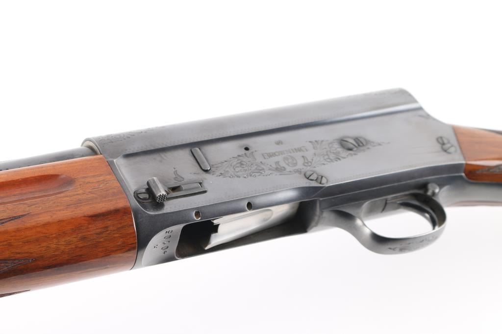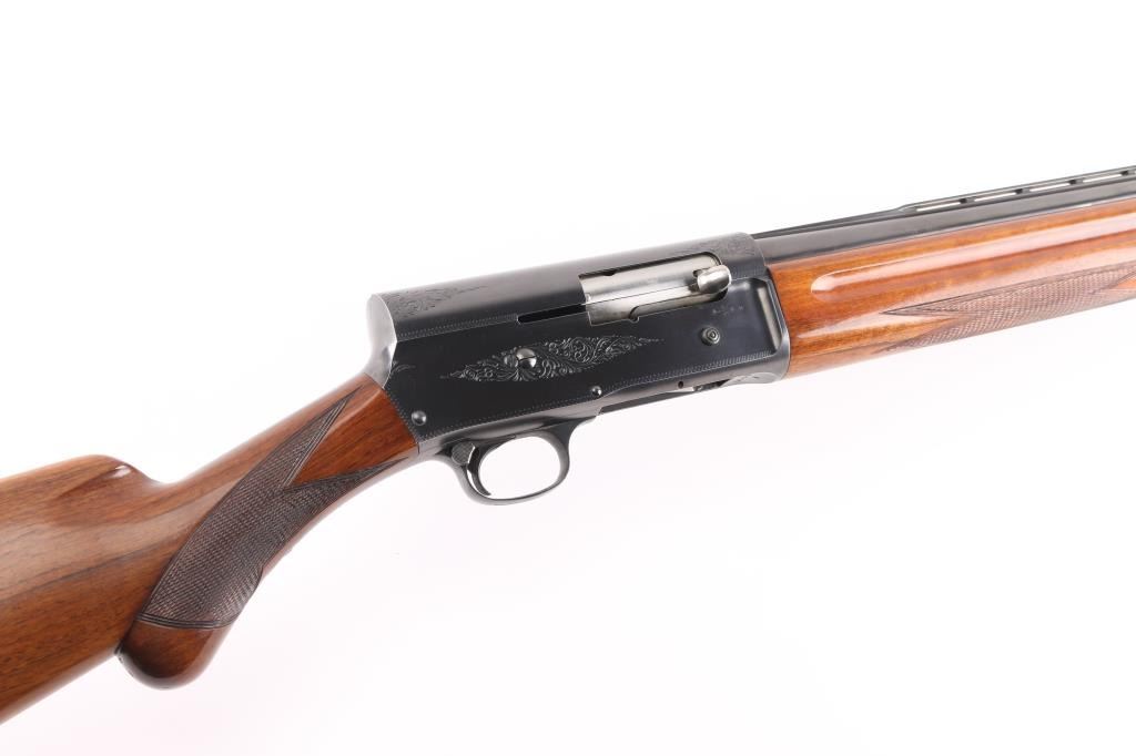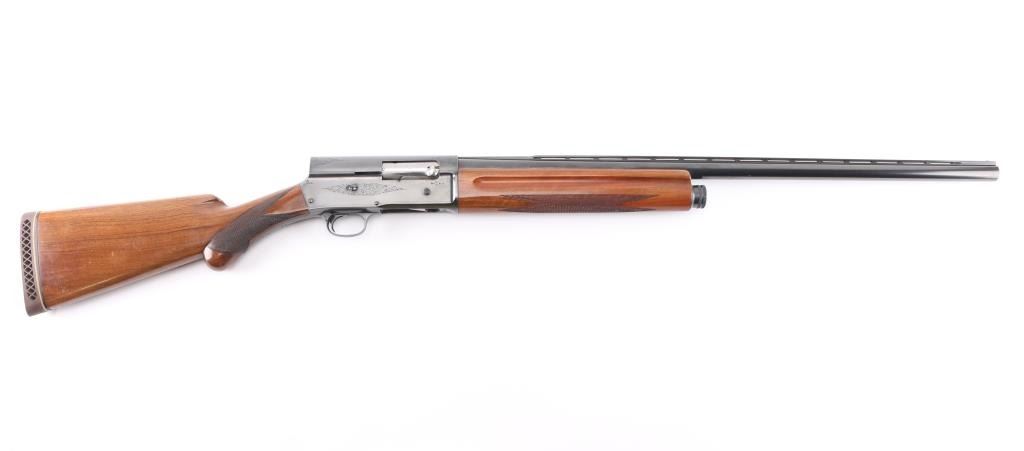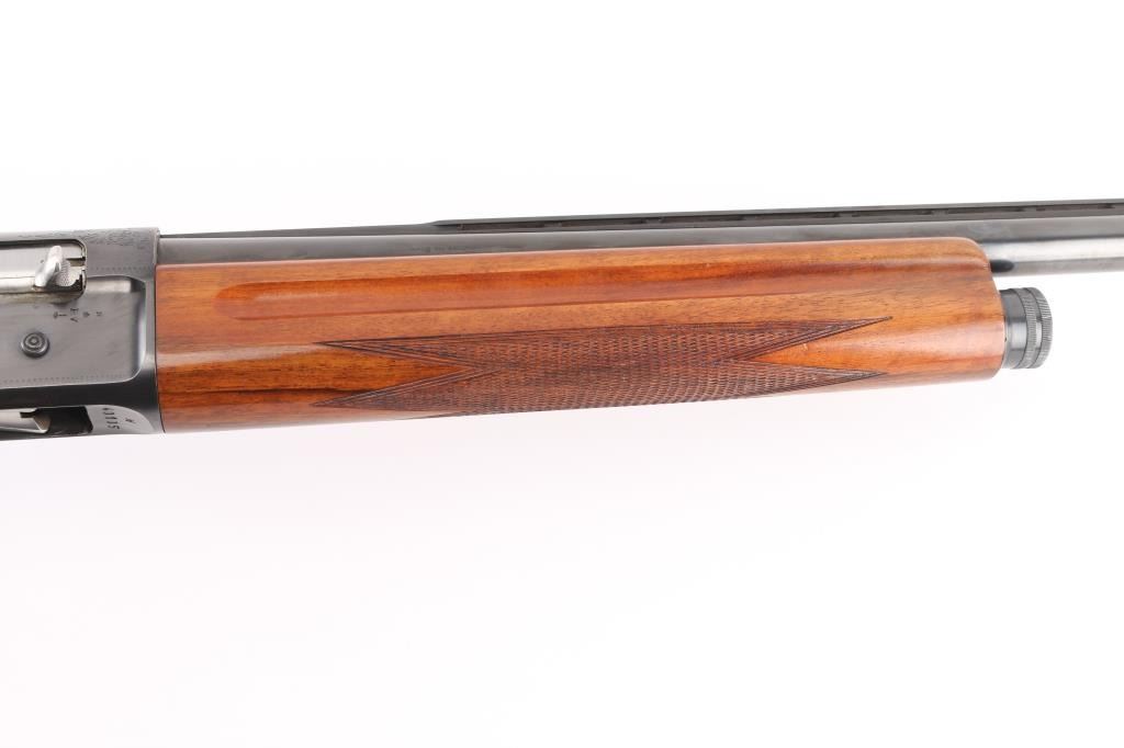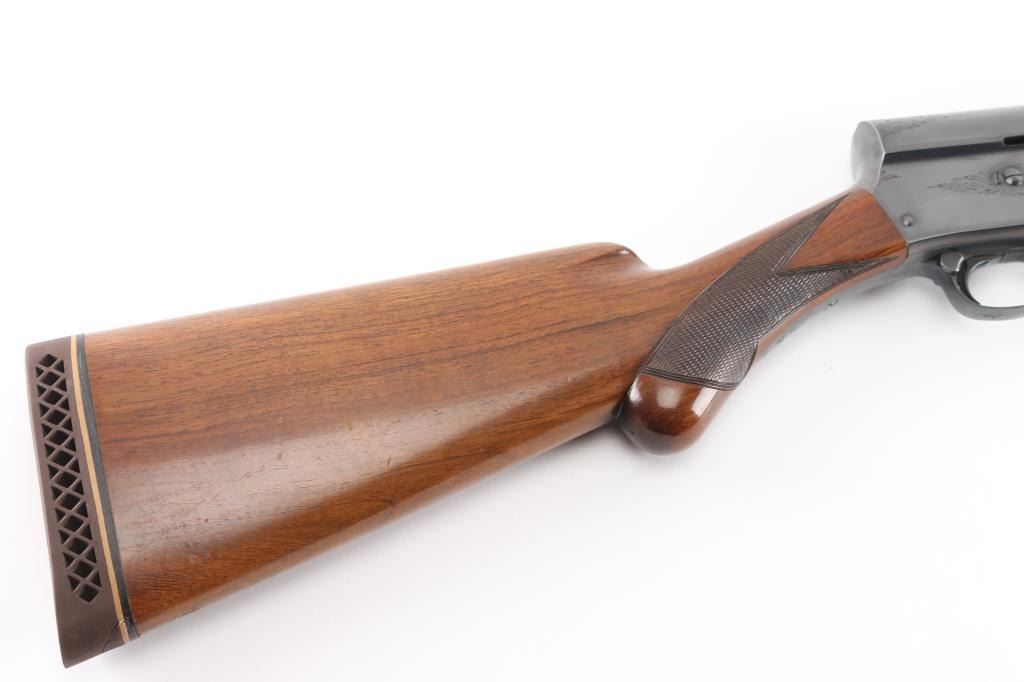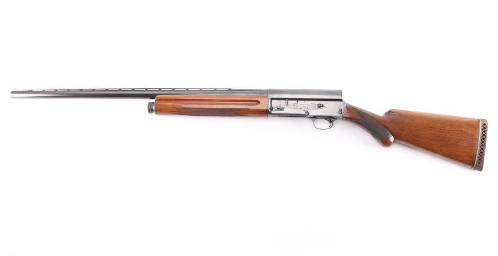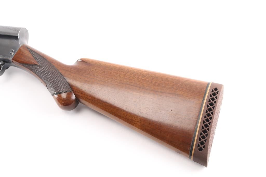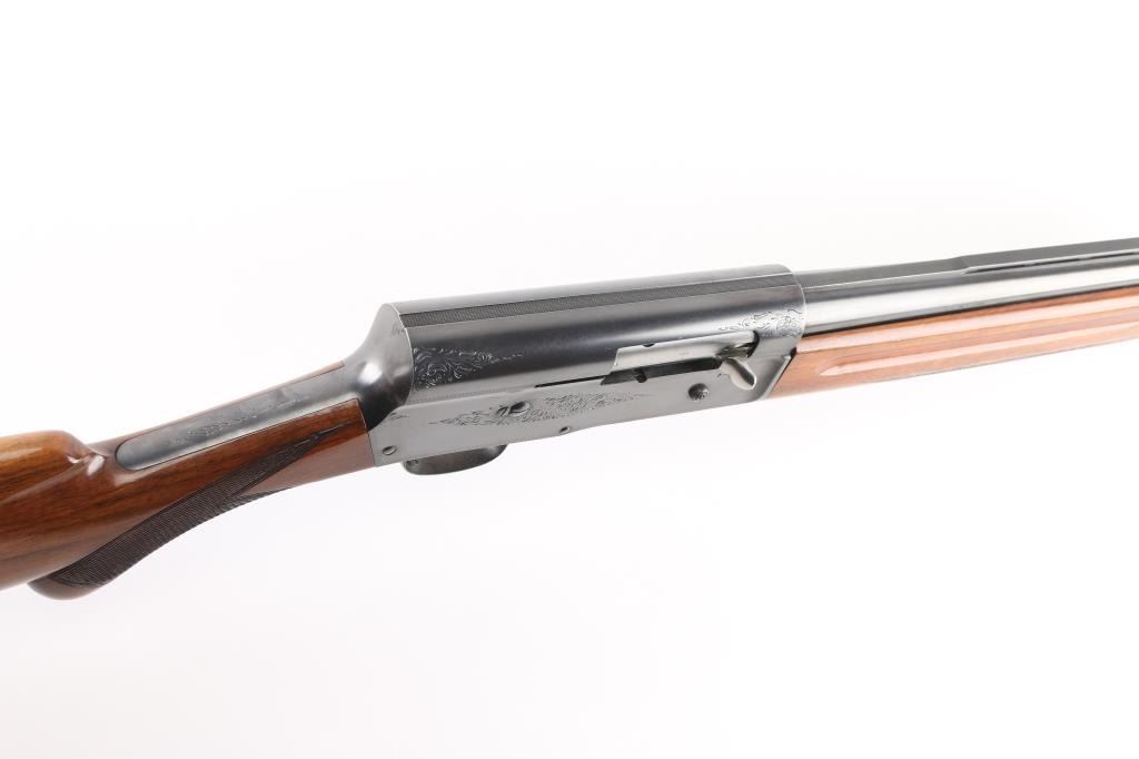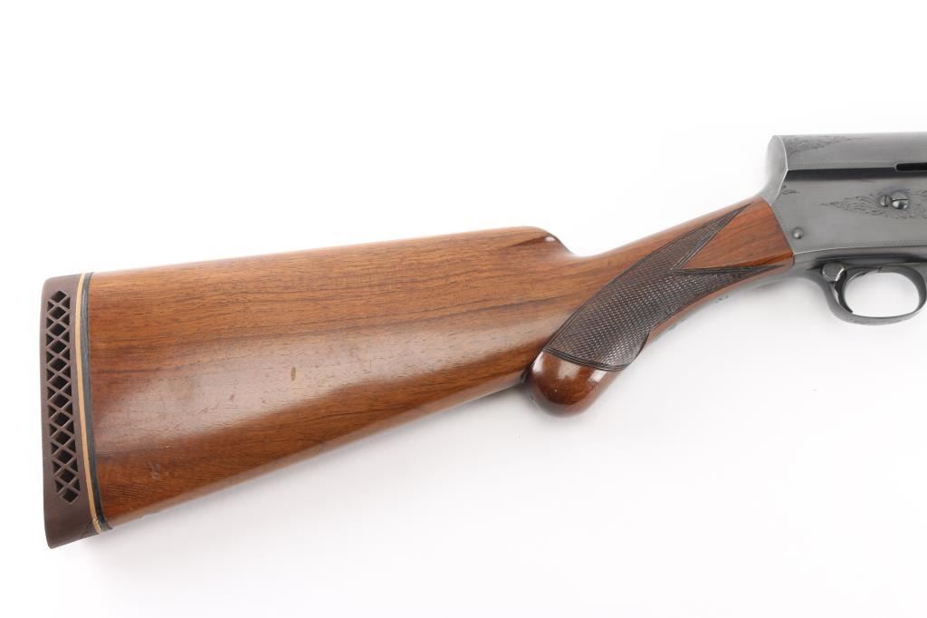 Made in Belgium this is the classic Auto 5 designed by John Moses Browning. It is a standard weight semi-auto shotgun chambered for 2.3/4" 12 gauge shells circa 1954. It has a 27.1/2" blued finish, barrel with a raised bead front sight, vented knurled rib, magazine cut off, metal trigger guard, smooth trigger and manual safety behind the trigger. It has two piece wood stocks with checkering at the wrist and forearm and finger grooves above the checkering on the forearm "Prince of Wales style grip. It has a vented Pachmyer recoil pad with black & white spacers. Blue metal finish is about 98% with minor scratches/edge wear. Bore is excellent/bright, wood is excellent with a few very minor dings. LOP is 15". Choke measures IM.Condition is NRA Excellent. C&R Firearm.