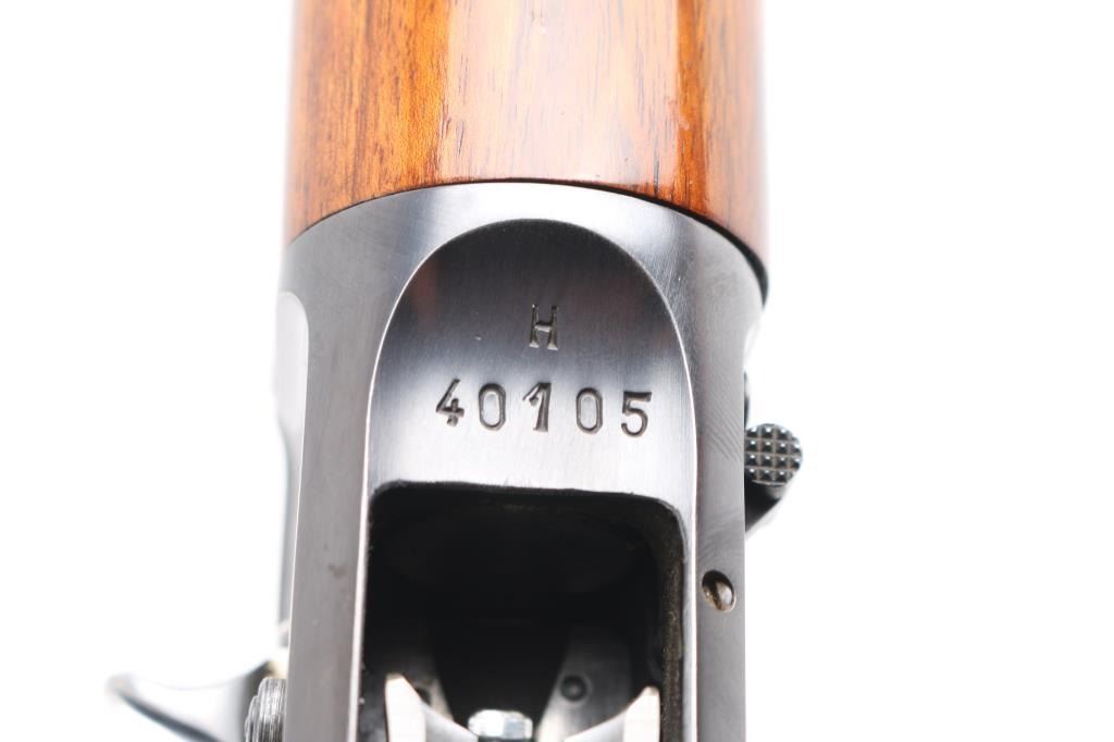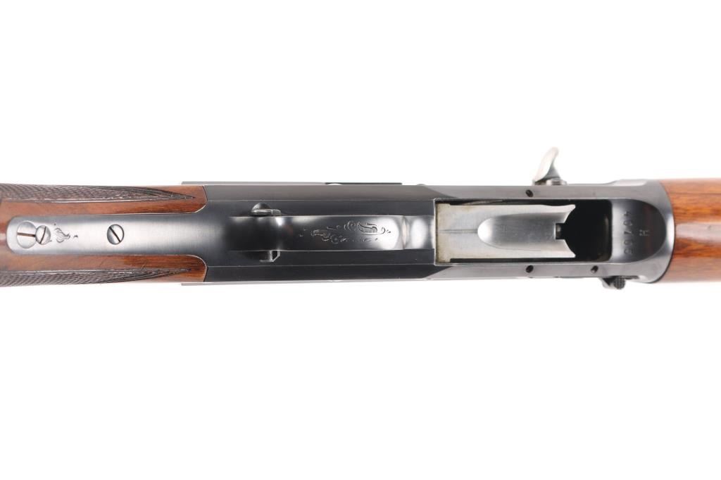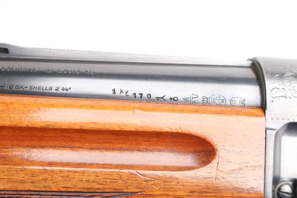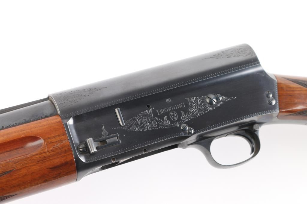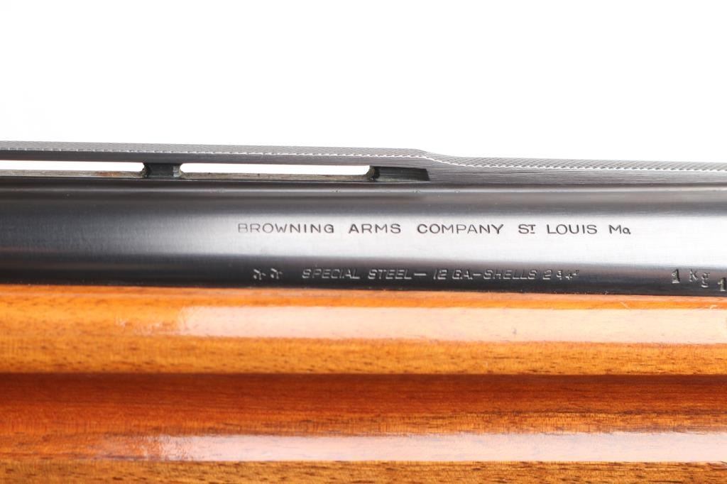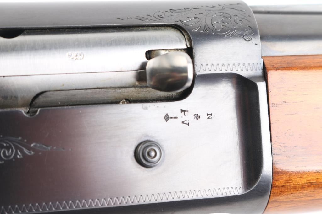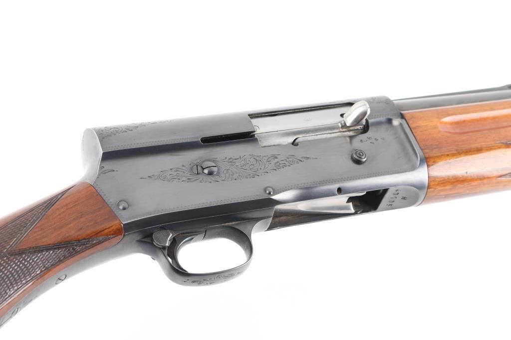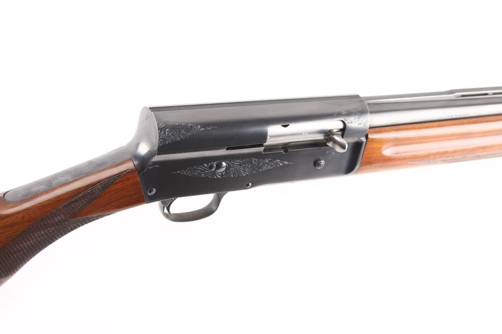 Made in Belgium this is the classic Auto 5 designed by John Moses Browning. It is a standard weight semi-auto shotgun chambered for 2.3/4" 12 gauge shells circa 1954. It has a 27.1/2" blued finish, barrel with a raised bead front sight, vented knurled rib, magazine cut off, metal trigger guard, smooth trigger and manual safety behind the trigger. It has two piece wood stocks with checkering at the wrist and forearm and finger grooves above the checkering on the forearm "Prince of Wales style grip. It has a vented Pachmyer recoil pad with black & white spacers. Blue metal finish is about 98% with minor scratches/edge wear. Bore is excellent/bright, wood is excellent with a few very minor dings. LOP is 15". Choke measures IM.Condition is NRA Excellent. C&R Firearm.
