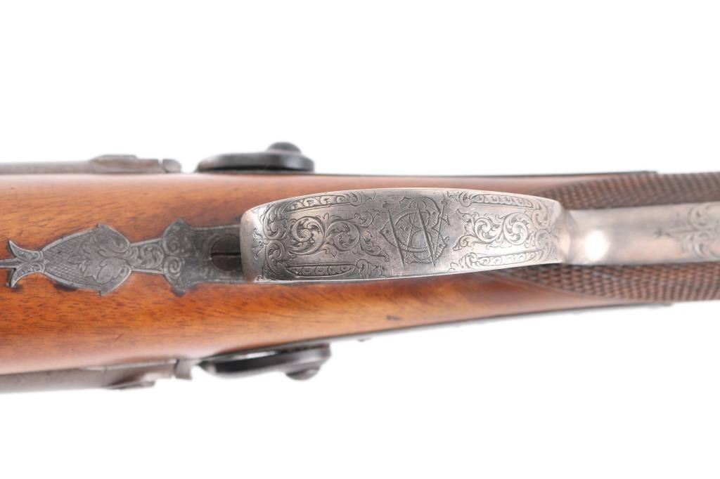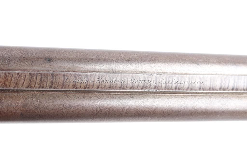 L. Meredith marked back-action percussion shotgun with rib hand-engraved, "Liddle and Kaeding makers San Francisco." Very high quality hand-engraved silver mounts with initials W. C. B. intertwined on the trigger guard. Select grain light colored checkered stock possibly maple of fruit wood. 10 ga with 28" barrels and 44" overall, weight 7.75. Barrels show 70-80% original brown with some minor pitting and discoloration to patina on firing areas and locks. Stocks have a 2" opening or crack to grain on left side otherwise very good plus. Locks work well. A very high grade gun and prized by Shelton as only known California percussion with silver mountings. Condition is NRA Very Good***Antique Firearm***