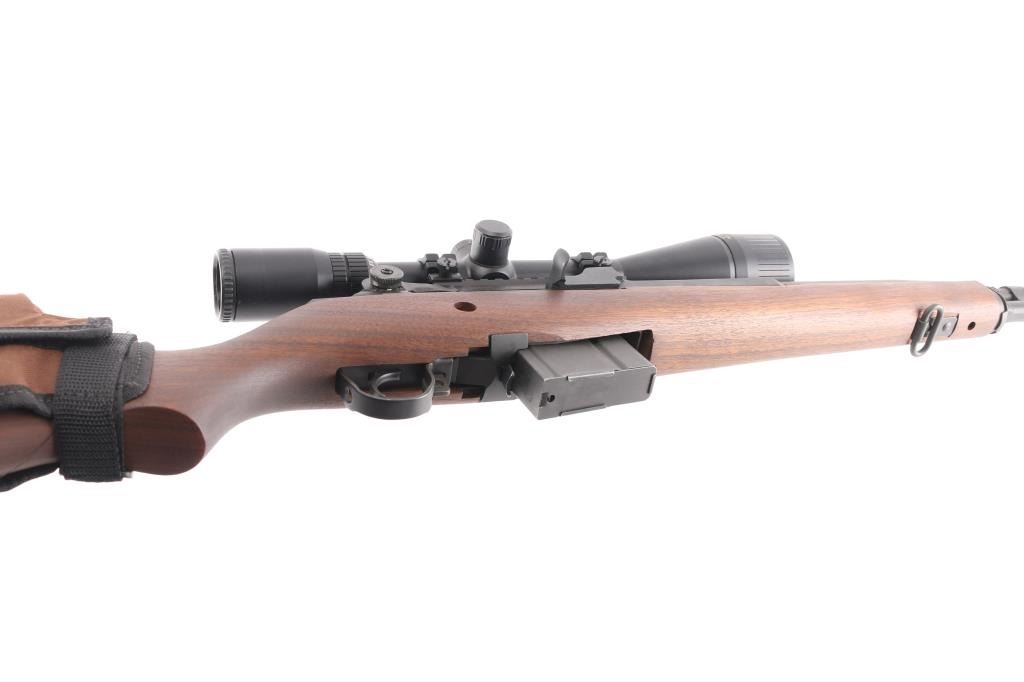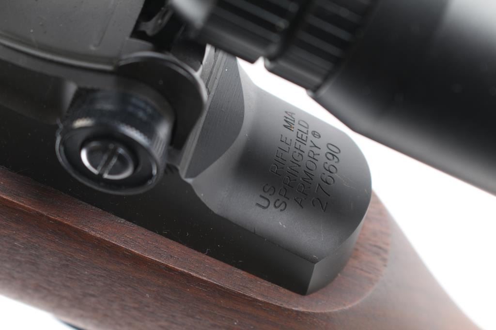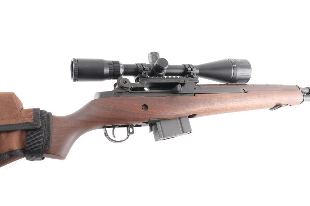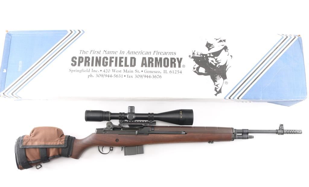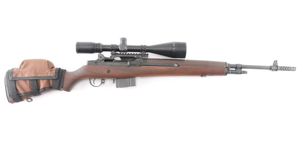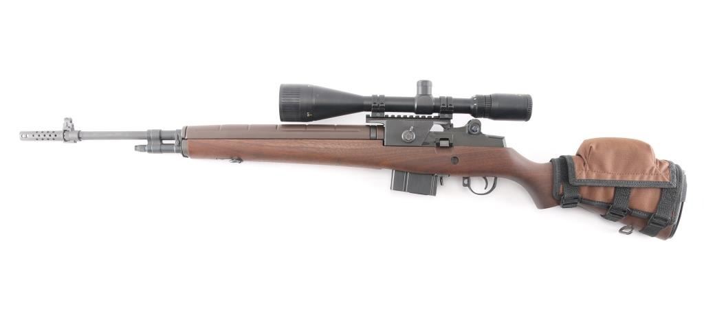 Semiautomatic rifle features parkerized finish, walnut stock with butt trap, brown fiberglass handguard, 22" barrel, flash hider, bayonet lug, blade front sight with protective ears, adjustable rear peep sight, sling swivels, manual safety, stripper clip guide on receiver, accepts detachable magazines. Buttplate has hinged cover over trap door. Mounted with a NcSTAR 6-24X50 AO scope on a Promag PM081 base, duplex reticle, clear optics, Tactical Buttstock Cheek Piece attached. Bore is excellent/bright. Retains 98% metal finish, with minor scratches and scuffs. Stock is excellent condition with handling marks. Fiberglass handguard is excellent condition. Includes (1) 10 rd magazine, (1) 5 rd magazine, both factory, M1907 USGI type tan leather sling, cleaning gear, documents, manuals, 2 different height cheek rests and factory cardboard box with matching label.Condition is NRA Excellent. Modern Firearm.