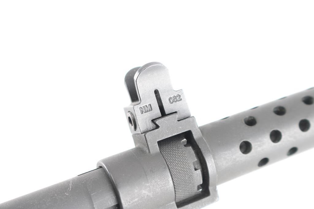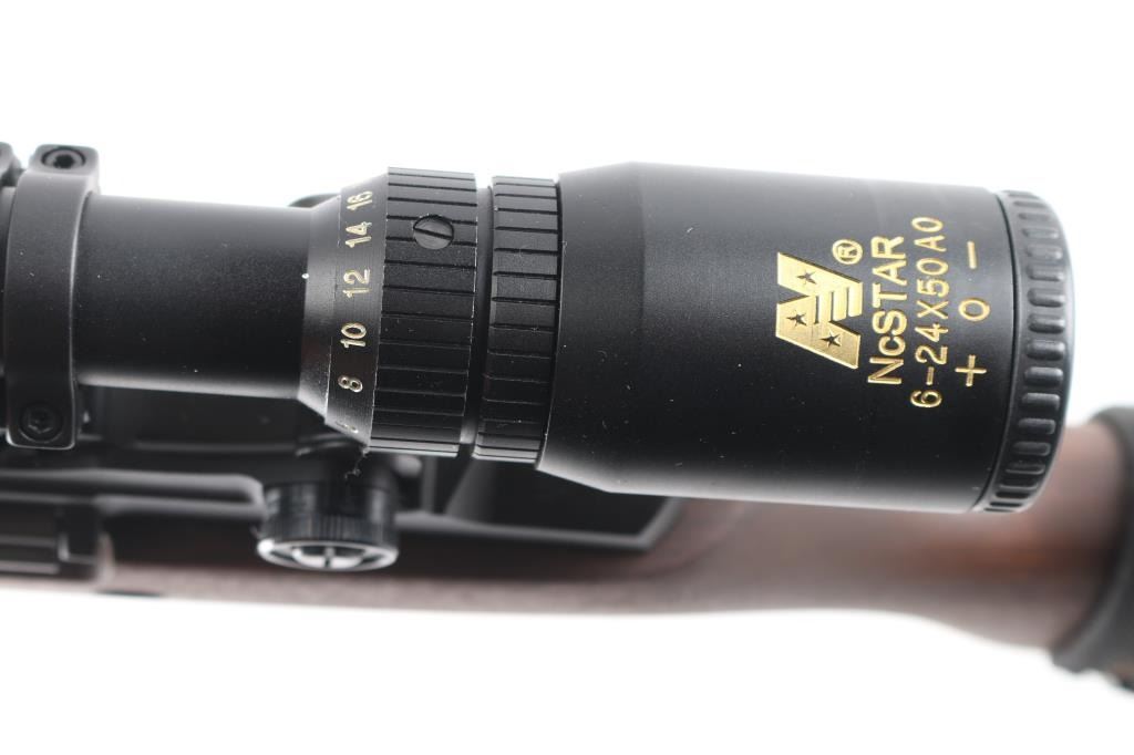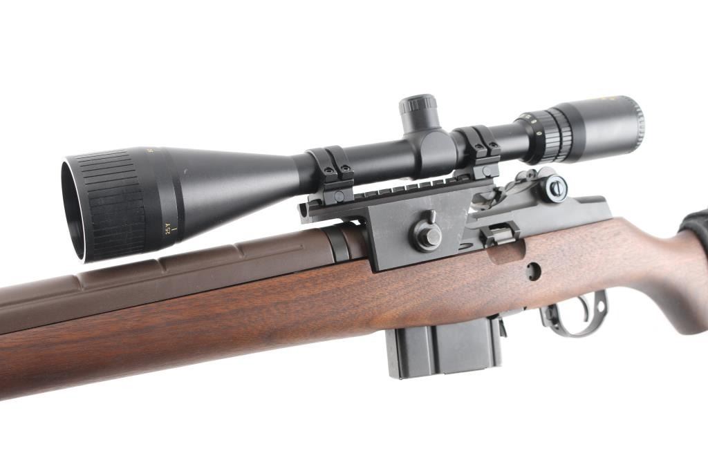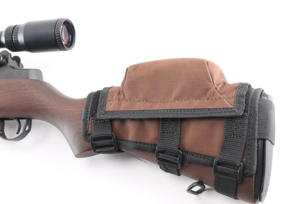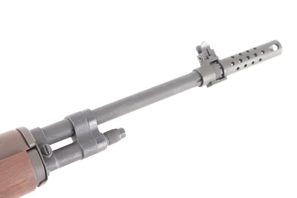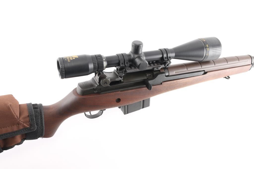 Semiautomatic rifle features parkerized finish, walnut stock with butt trap, brown fiberglass handguard, 22" barrel, flash hider, bayonet lug, blade front sight with protective ears, adjustable rear peep sight, sling swivels, manual safety, stripper clip guide on receiver, accepts detachable magazines. Buttplate has hinged cover over trap door. Mounted with a NcSTAR 6-24X50 AO scope on a Promag PM081 base, duplex reticle, clear optics, Tactical Buttstock Cheek Piece attached. Bore is excellent/bright. Retains 98% metal finish, with minor scratches and scuffs. Stock is excellent condition with handling marks. Fiberglass handguard is excellent condition. Includes (1) 10 rd magazine, (1) 5 rd magazine, both factory, M1907 USGI type tan leather sling, cleaning gear, documents, manuals, 2 different height cheek rests and factory cardboard box with matching label.Condition is NRA Excellent. Modern Firearm.
