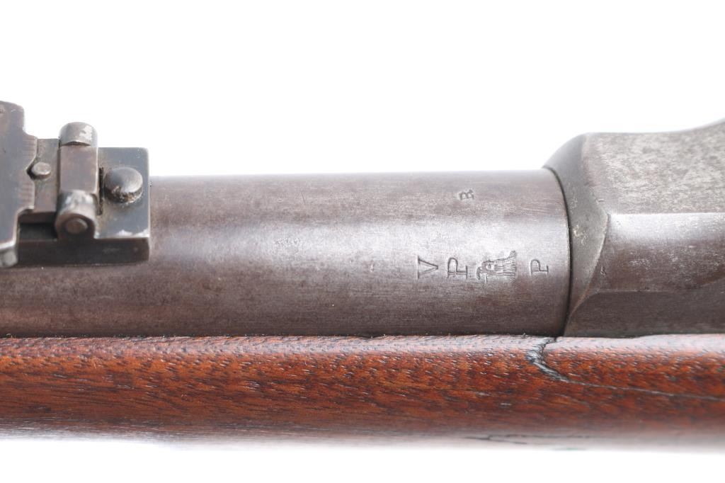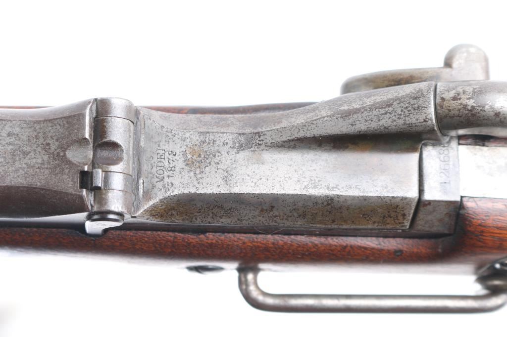 #126686 Single-Shot. Breech-Block action. Cavalry saddle ring carbine with 22" round barrel. "Indian Wars Carbine". Lock plate marked with Eagle, and "U.S. Springfield. Hinged "Trapdoor" stamped "U.S. model 1873", appears "1878", but its just a deeply stamped "3". "VP Eagle proof on lower barrel. There is also a "R", and "P". Serial number on breech block. Correct early rear sight stamped "C" for carbine. Barrel band stamped "U", buttplate tang stamped "U.S." Bore appears good/bright with some very light pitting, good rifling. Metal finish has turned a molted gray/brown patina, traces of blue in protected areas. There are no cartouches, but has the "P" proof on the stock, (faint) possibly has been lightly sanded at some point. Wood is very good/sound with hairline cracks forward of the triggerguard & sling bar.NRA Condition-Very Good as Antique Firearm.