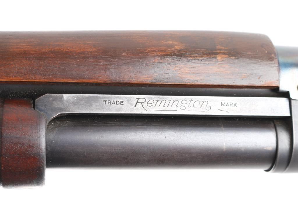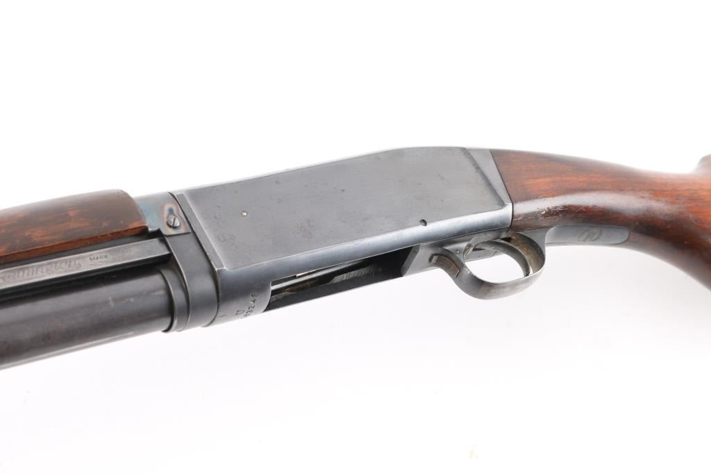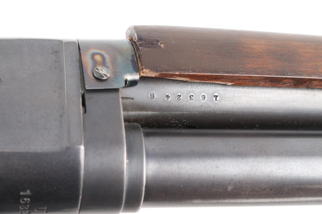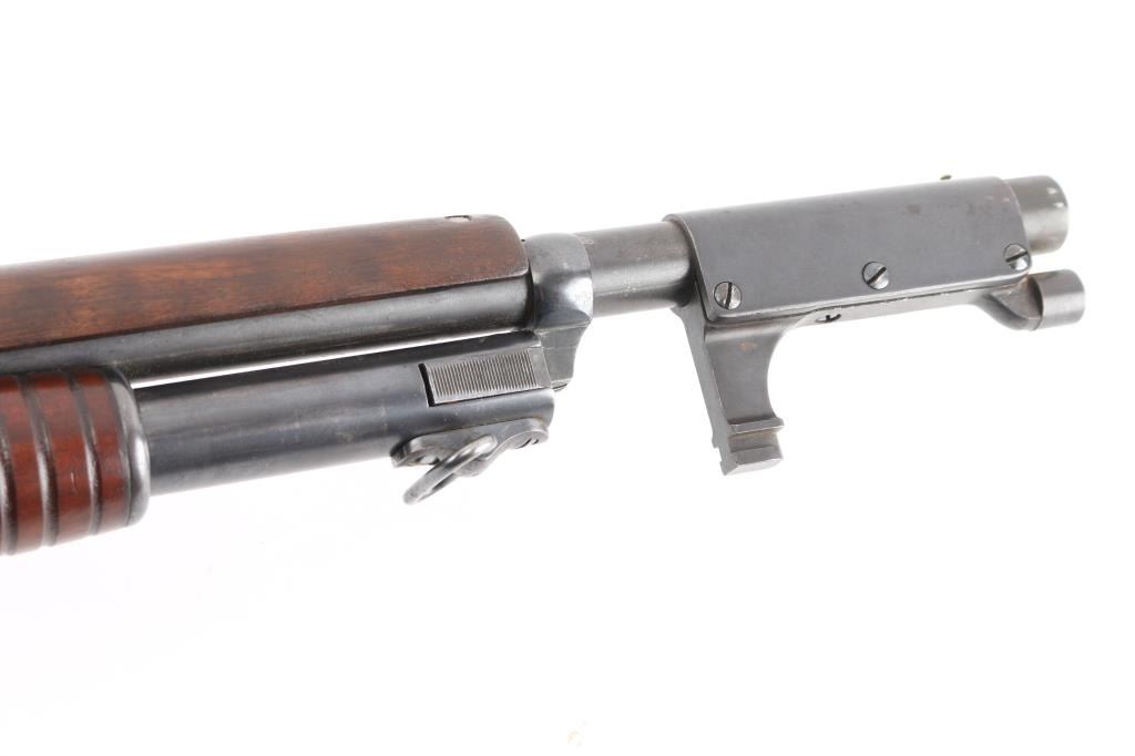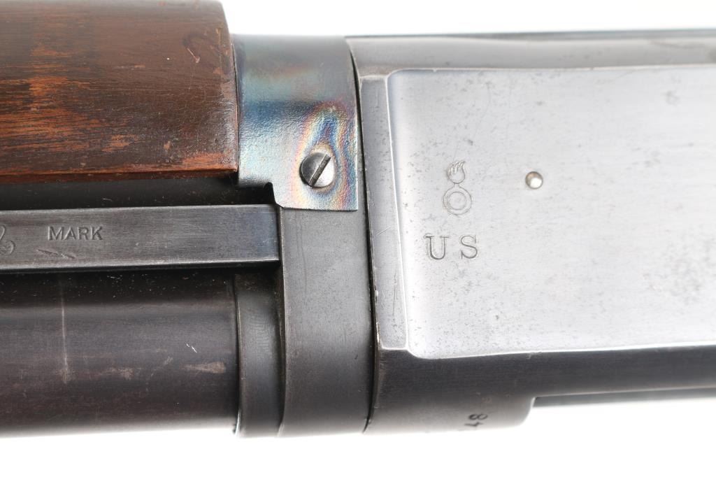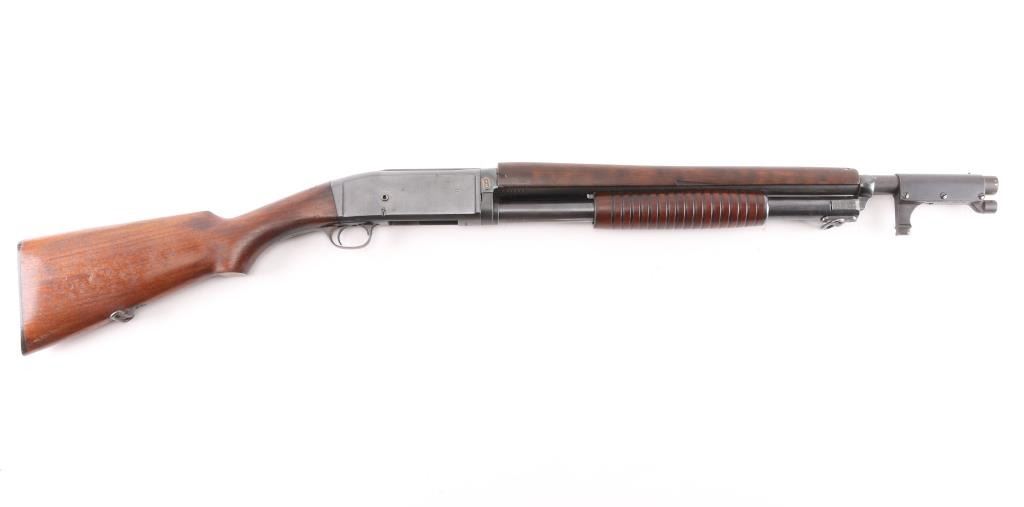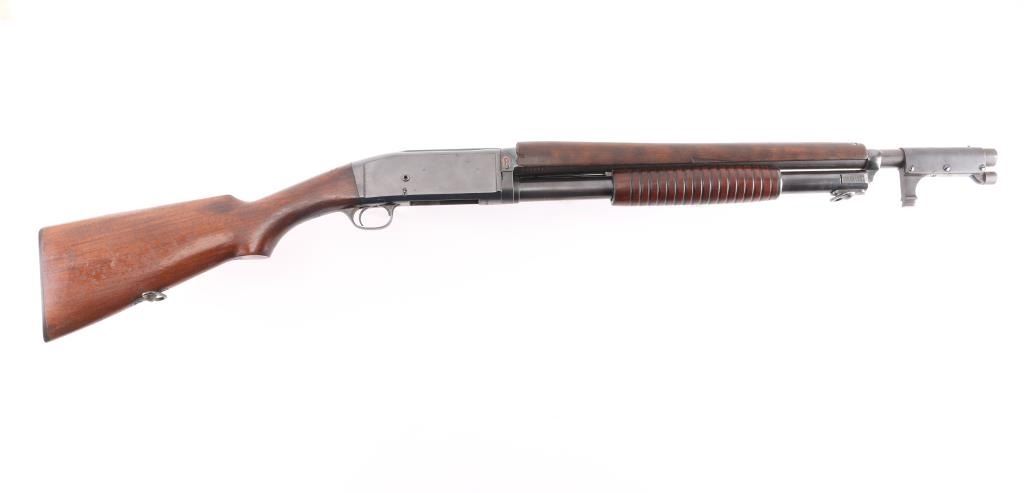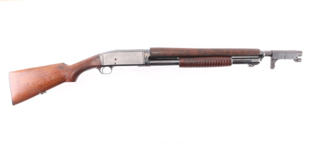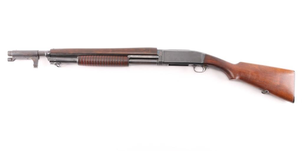 Sn: U163248. This is a example of an very scarce WWI trench shotgun manufactured by the Remington/UMC company under a U.S. Army contract. These were only produced for a very short time circa WWI with most being reconverted back into riot or sporting shotguns over time. Original examples are found in this serial number range (117731-165566) and are considered the apex of a U.S. martial shotgun collection. These have the factory blued finish, and walnut slide handle, buttstock and handguard mounted on top of the barrel. The front underside of the receiver is stamped with the Remington factory serial number of "U/162910". (Correct U prefix)The top of the barrel is correctly marked (under the handguard) "Model 10-A REMINGTON ARMS-UNION METALLIC CARTRIDGE CO./REMINGTON WORKS, ILLION NEW YORK USA/PATENTED FEBRUARY 3, 1903, AND MAY 16, 1905." The barrel is also correctly roll marked with the Remington, circled "REP" factory proof along with the matching serial number "164853" stamped upside down on the lower right rear side. The action bar is marked "Trade REMINGTON Mark" and the lower is marked "Remington UMC" in small circle with "Trade Mark" under it. The barrel is fitted by means of 3 screws, which were secured into 3 transverse grooves milled into the underside of the barrel and a 4th vertically through the adaptor, with a matte blued bayonet lug that lacks the standard "Eagle Head" proof on the front end. The left side of the receiver is stamped with an U.S. Ordnance "Bomb and Flame" proof over "U S". It has an oil finished ribbed pump handle and buttstock with a sling swivel attached to the front end of the magazine tube and the lower underside of the stock. The buttstock has a smooth pistol grip shape with a stamped steel, serrated buttplate. There is evidence of the barrel being factory shortened as per the Army contract by in line in the bore Approximately 3 1/4" from the muzzle under the bayonet lug attachment. The correct wooden handguard and and sheet metal lip are reproductions added by the consignor for display. Bore is very good/bright, action is smooth, wood is very good/sound, Remington UMC plastic buttplate is very good, Blue is mostly all there with handling wear mostly on the barrel and action bar. NRA Condition-Good. ++. C&R Firearm.