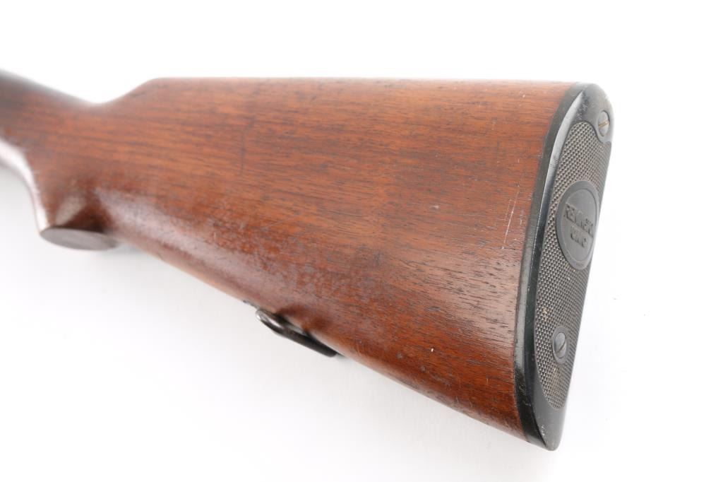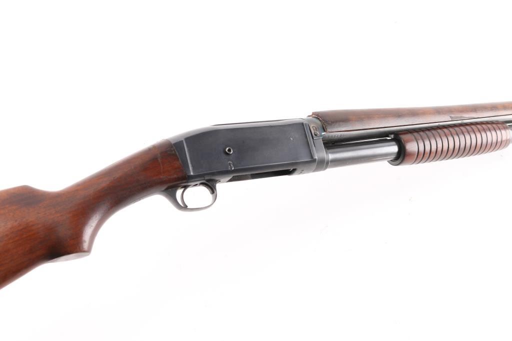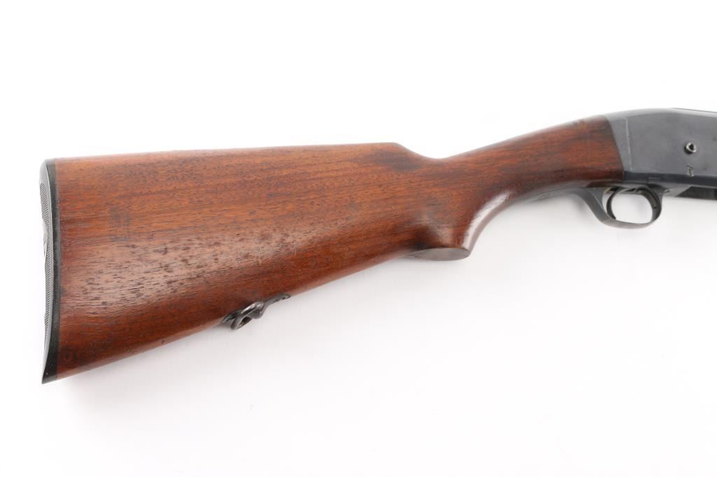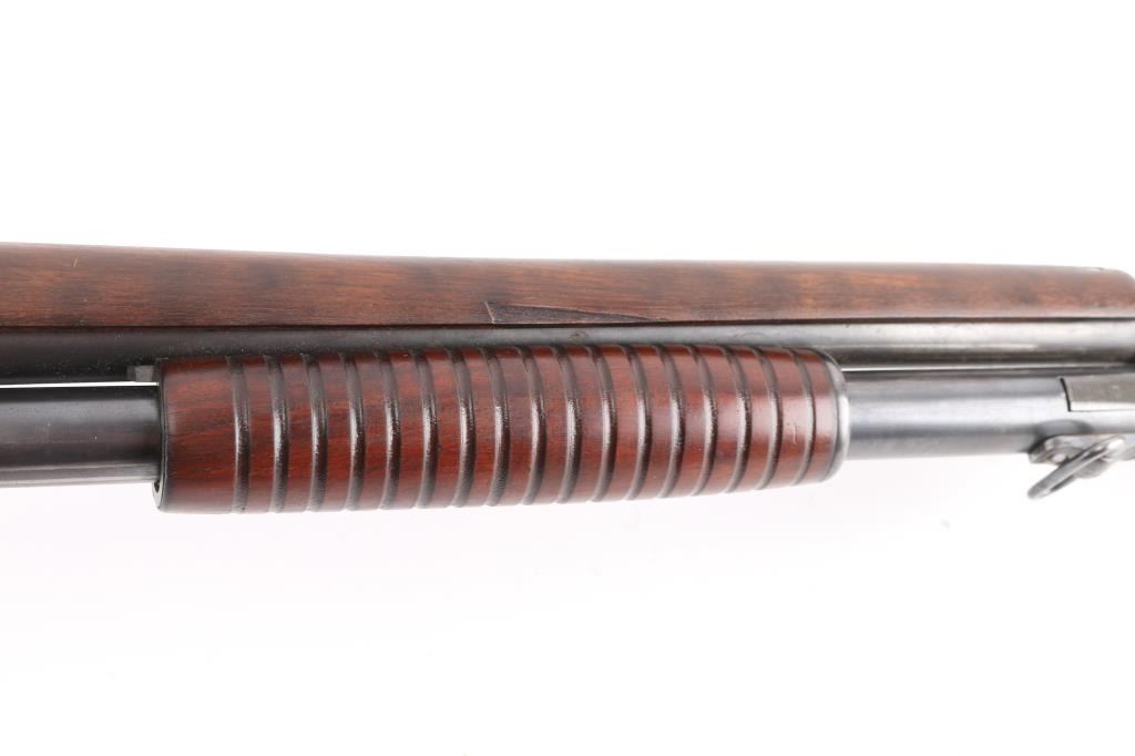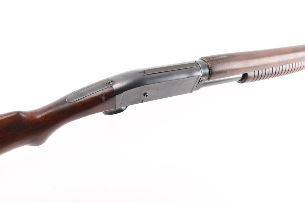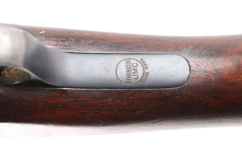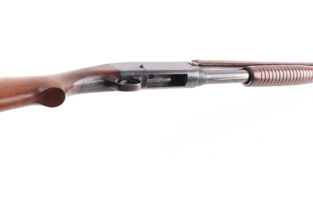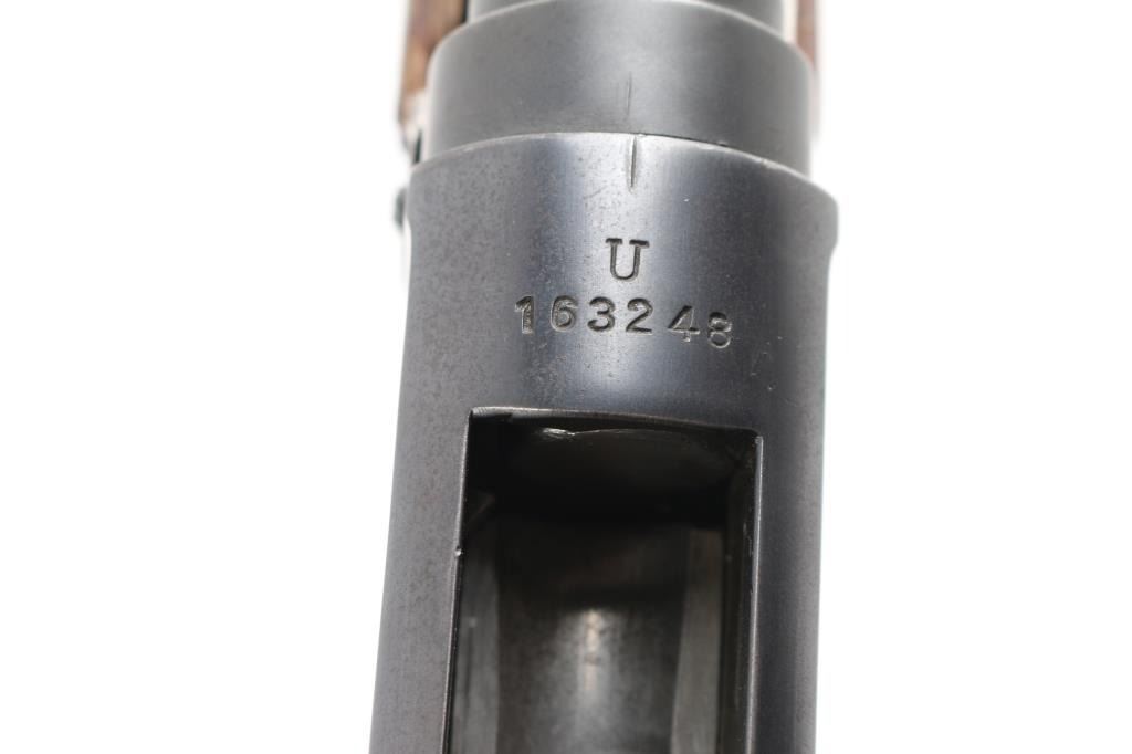 Sn: U163248. This is a example of an very scarce WWI trench shotgun manufactured by the Remington/UMC company under a U.S. Army contract. These were only produced for a very short time circa WWI with most being reconverted back into riot or sporting shotguns over time. Original examples are found in this serial number range (117731-165566) and are considered the apex of a U.S. martial shotgun collection. These have the factory blued finish, and walnut slide handle, buttstock and handguard mounted on top of the barrel. The front underside of the receiver is stamped with the Remington factory serial number of "U/162910". (Correct U prefix)The top of the barrel is correctly marked (under the handguard) "Model 10-A REMINGTON ARMS-UNION METALLIC CARTRIDGE CO./REMINGTON WORKS, ILLION NEW YORK USA/PATENTED FEBRUARY 3, 1903, AND MAY 16, 1905." The barrel is also correctly roll marked with the Remington, circled "REP" factory proof along with the matching serial number "164853" stamped upside down on the lower right rear side. The action bar is marked "Trade REMINGTON Mark" and the lower is marked "Remington UMC" in small circle with "Trade Mark" under it. The barrel is fitted by means of 3 screws, which were secured into 3 transverse grooves milled into the underside of the barrel and a 4th vertically through the adaptor, with a matte blued bayonet lug that lacks the standard "Eagle Head" proof on the front end. The left side of the receiver is stamped with an U.S. Ordnance "Bomb and Flame" proof over "U S". It has an oil finished ribbed pump handle and buttstock with a sling swivel attached to the front end of the magazine tube and the lower underside of the stock. The buttstock has a smooth pistol grip shape with a stamped steel, serrated buttplate. There is evidence of the barrel being factory shortened as per the Army contract by in line in the bore Approximately 3 1/4" from the muzzle under the bayonet lug attachment. The correct wooden handguard and and sheet metal lip are reproductions added by the consignor for display. Bore is very good/bright, action is smooth, wood is very good/sound, Remington UMC plastic buttplate is very good, Blue is mostly all there with handling wear mostly on the barrel and action bar. NRA Condition-Good. ++. C&R Firearm.