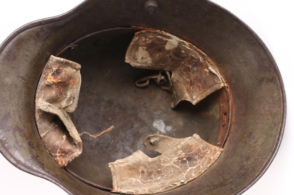 Classic M16 German camouflage helmet in a handpainted three color scheme that has the regulation black dividing lines between each segment. The paint has faded with time but mostly all there. The inside dome of the helmet is marked with the heating lot code "30". The left rivet is a later replacement, the three liner pads are present, complete, but in poor shape, cracked, two still have the horsehair padding. Leather is missing from the steel band, no chinstrap. Makes a great display.