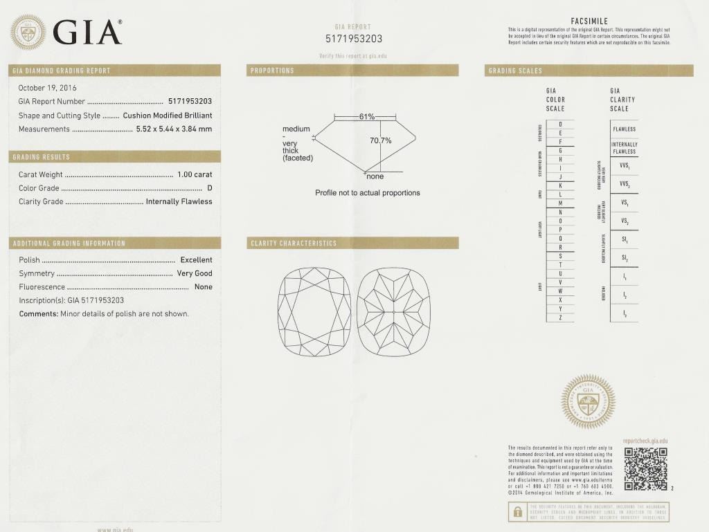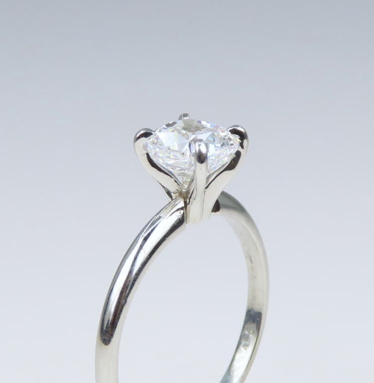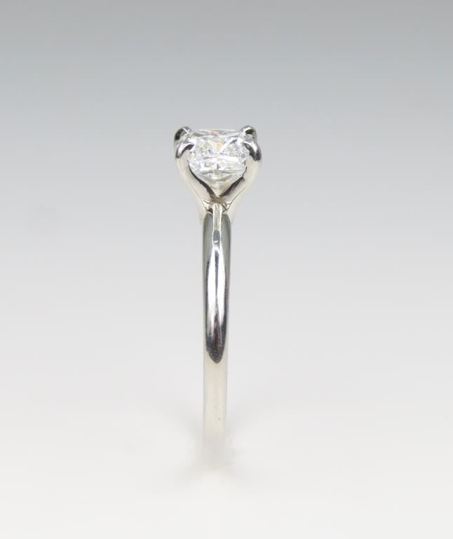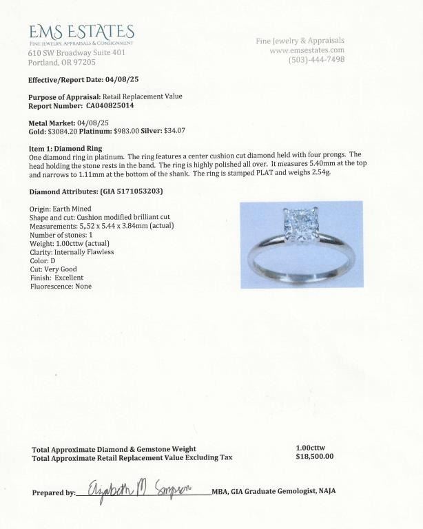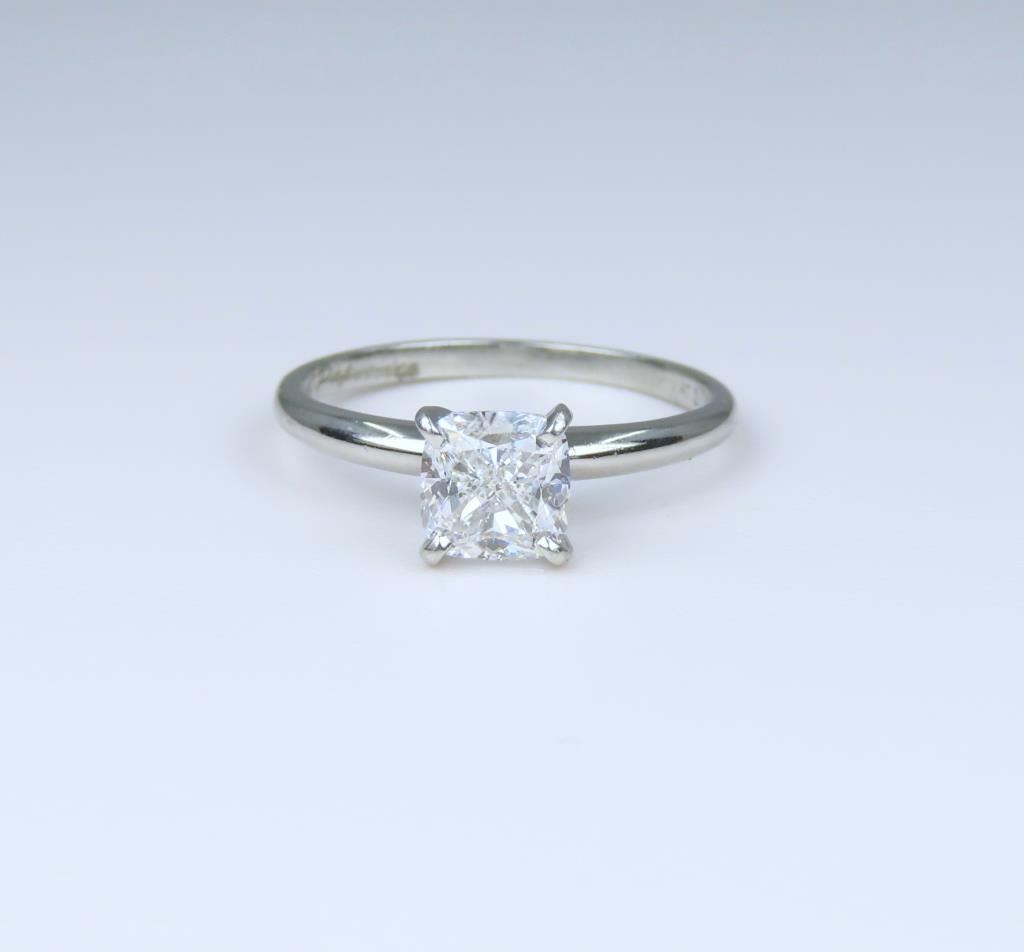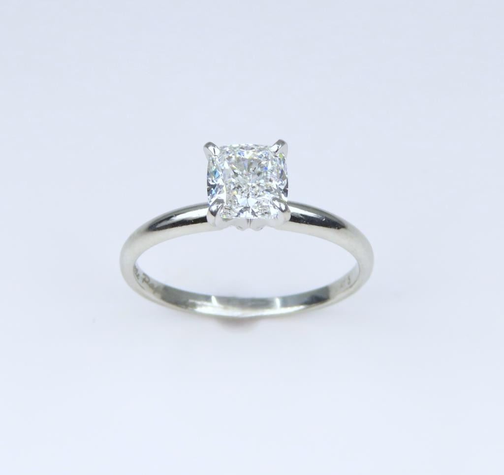 Diamond with full G.I.A. Certificate. This brilliant Earth Mined cushion cut Diamond is set in a classic Platinum Tiffany style setting, ring size 5. Finest in quality, the brilliance of this Diamond Ring is stunning. Full Retail Appraisal - $18,500.00.