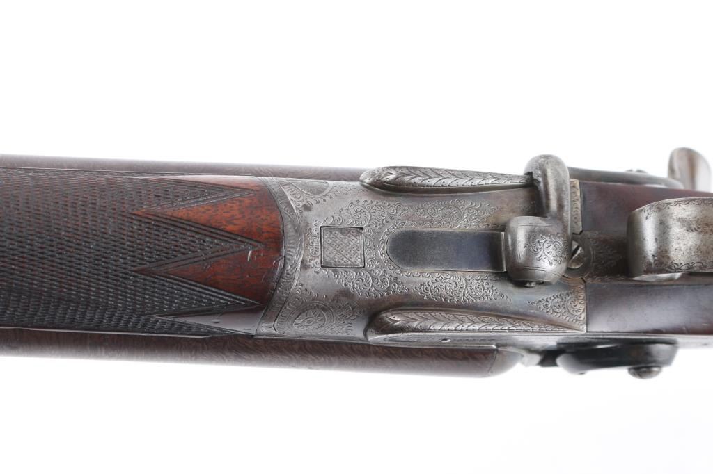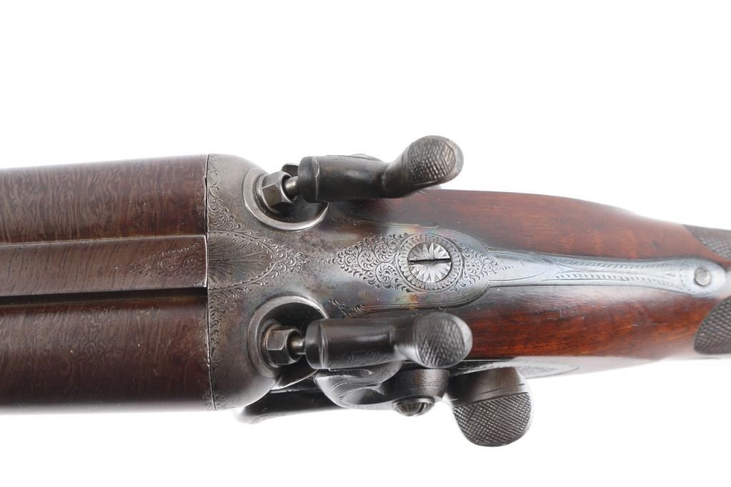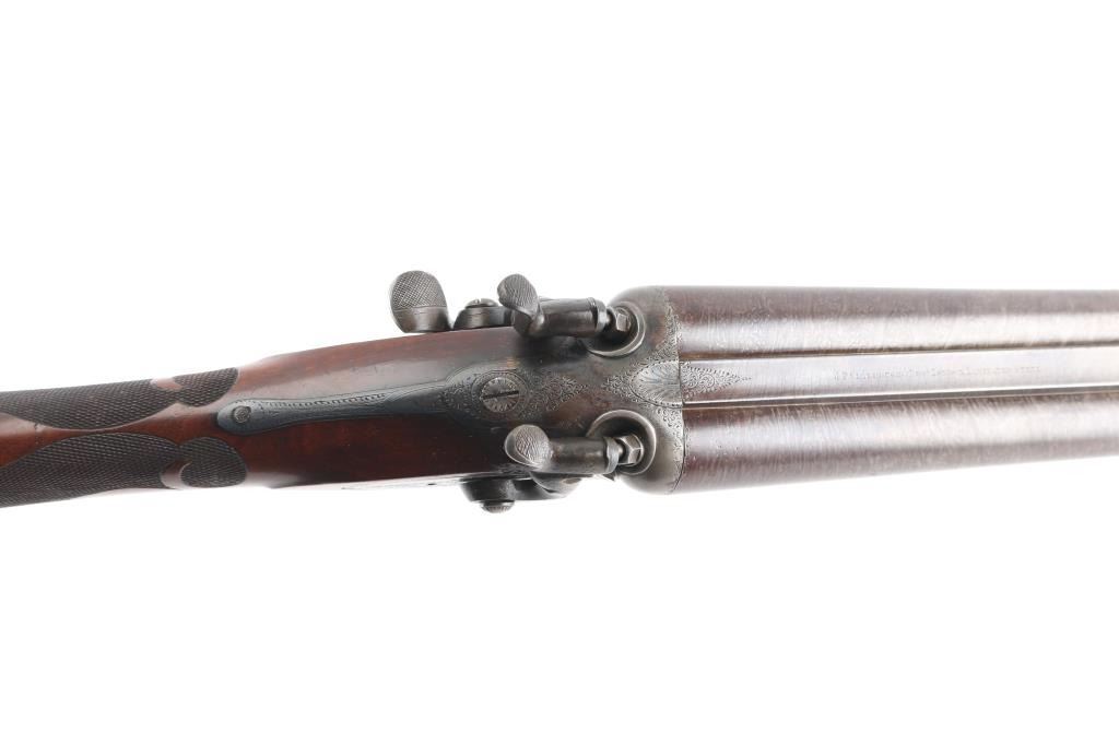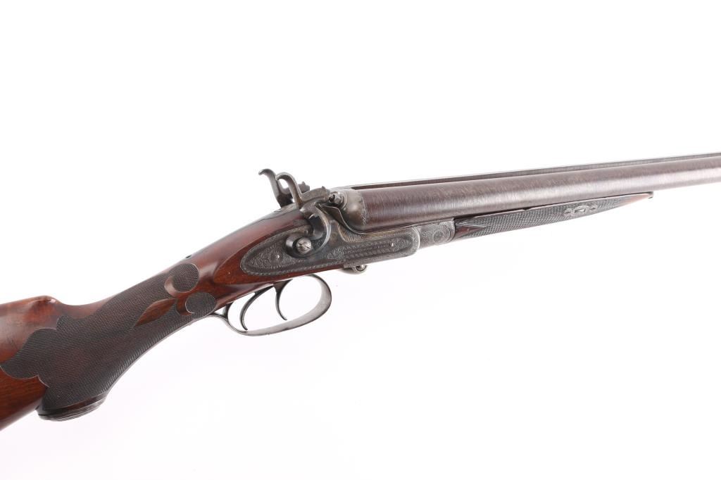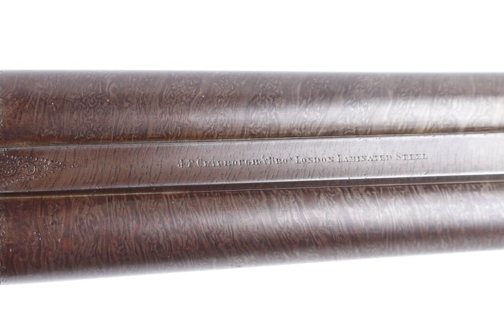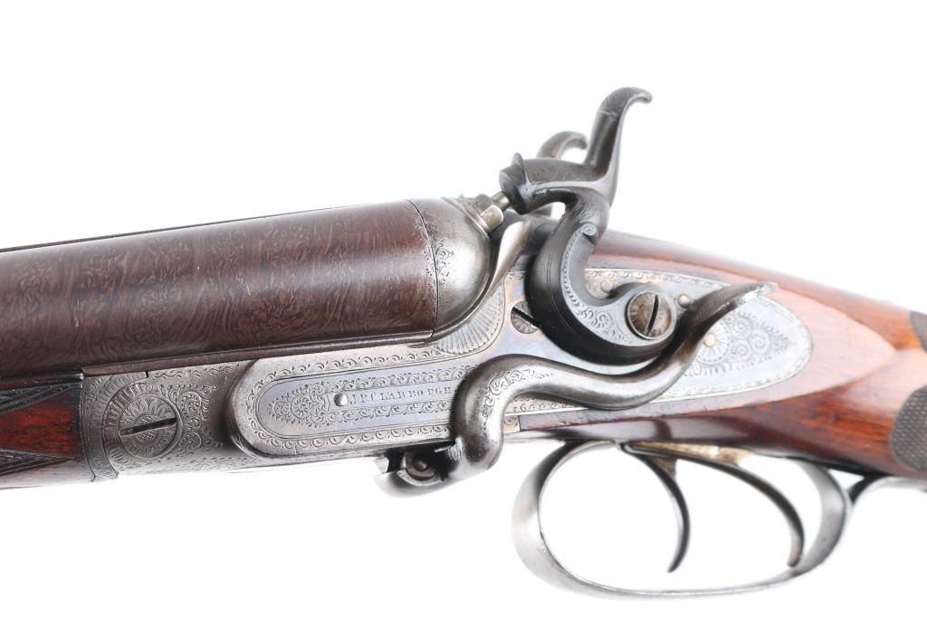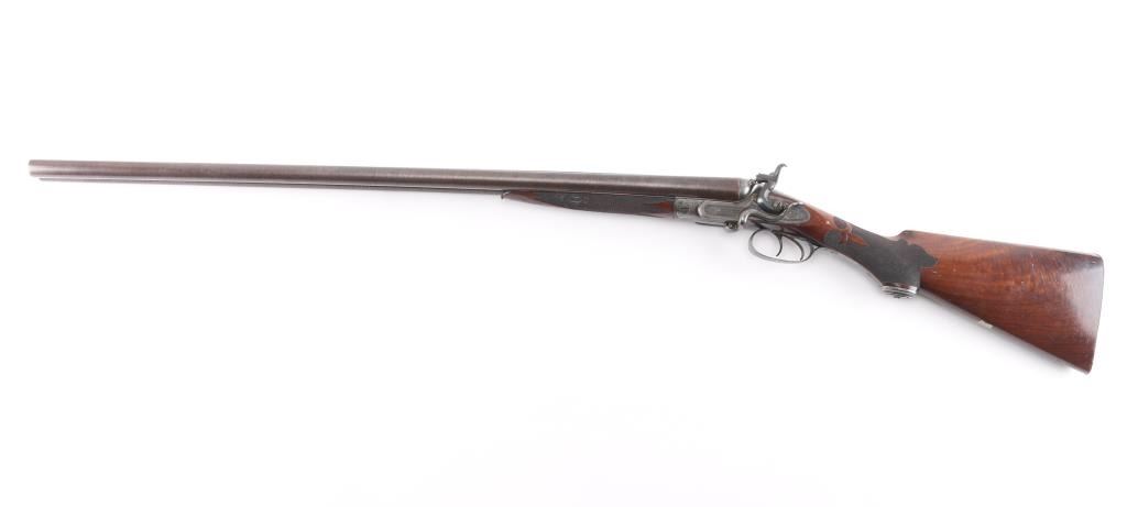 J. P. Clabrough & Bros., London 126A, side by side shotgun with side release lever, high exposed hammers, fancy fluer d lis checkered stocks #2957 made about 1876. Thirty inch barrels, 14 1/2" pull, choked about I.C. right and modified left. The condition is very good plus with 80%-90% brown on Damascus pattern barrels, 30-60 case colors on locks, T.G. drifted to patina along with pistol grip cap and steel butt plate. Stocks are nicely grained with crisp checkering and very good plus with minor handling, light wear and small dings with slight mars. Bores are very bright and gun is mechanically tight and crisp. From Larry Shelton collection author "J. P. Clabrough, Birmingham Gun Makers." Condition is NRA Fine***Antique Firearm***
