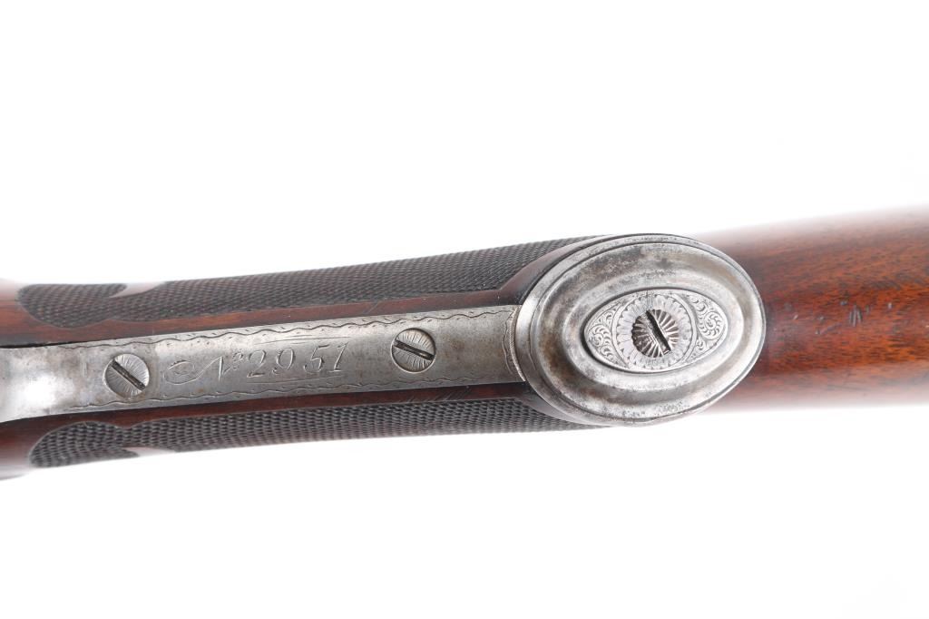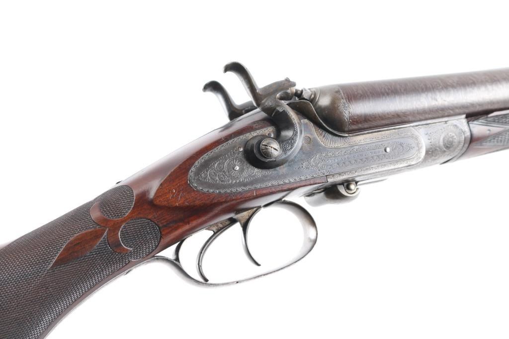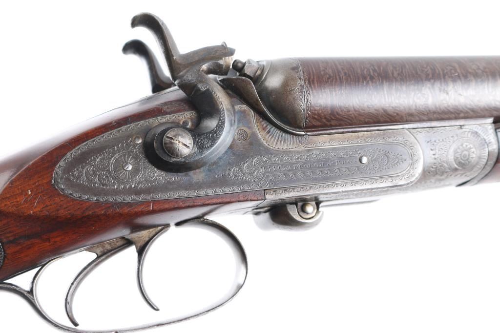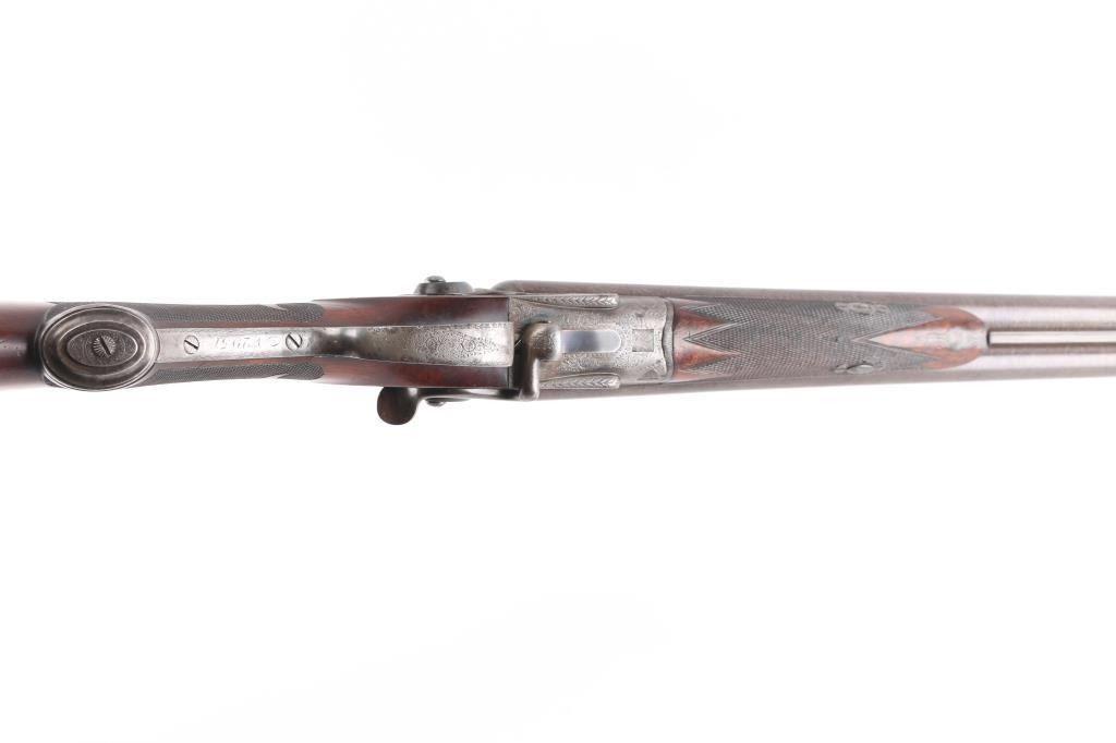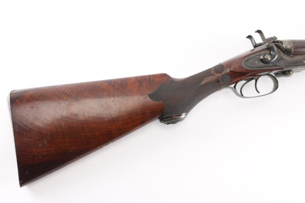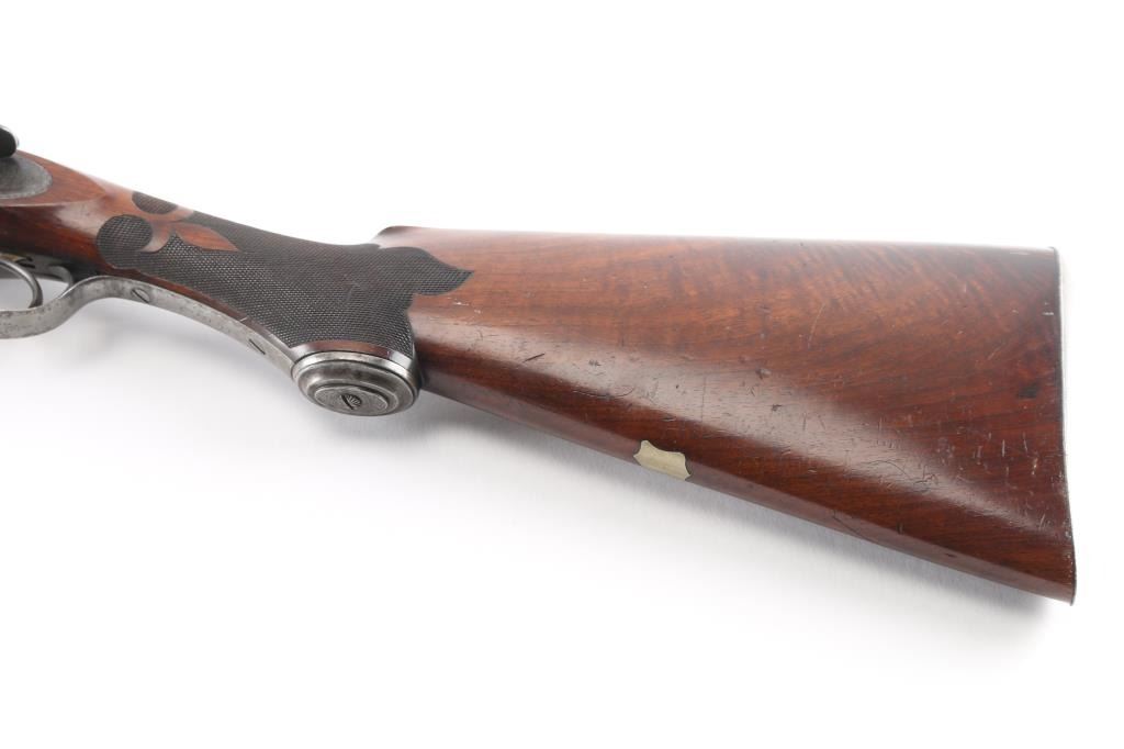 J. P. Clabrough & Bros., London 126A, side by side shotgun with side release lever, high exposed hammers, fancy fluer d lis checkered stocks #2957 made about 1876. Thirty inch barrels, 14 1/2" pull, choked about I.C. right and modified left. The condition is very good plus with 80%-90% brown on Damascus pattern barrels, 30-60 case colors on locks, T.G. drifted to patina along with pistol grip cap and steel butt plate. Stocks are nicely grained with crisp checkering and very good plus with minor handling, light wear and small dings with slight mars. Bores are very bright and gun is mechanically tight and crisp. From Larry Shelton collection author "J. P. Clabrough, Birmingham Gun Makers." Condition is NRA Fine***Antique Firearm***