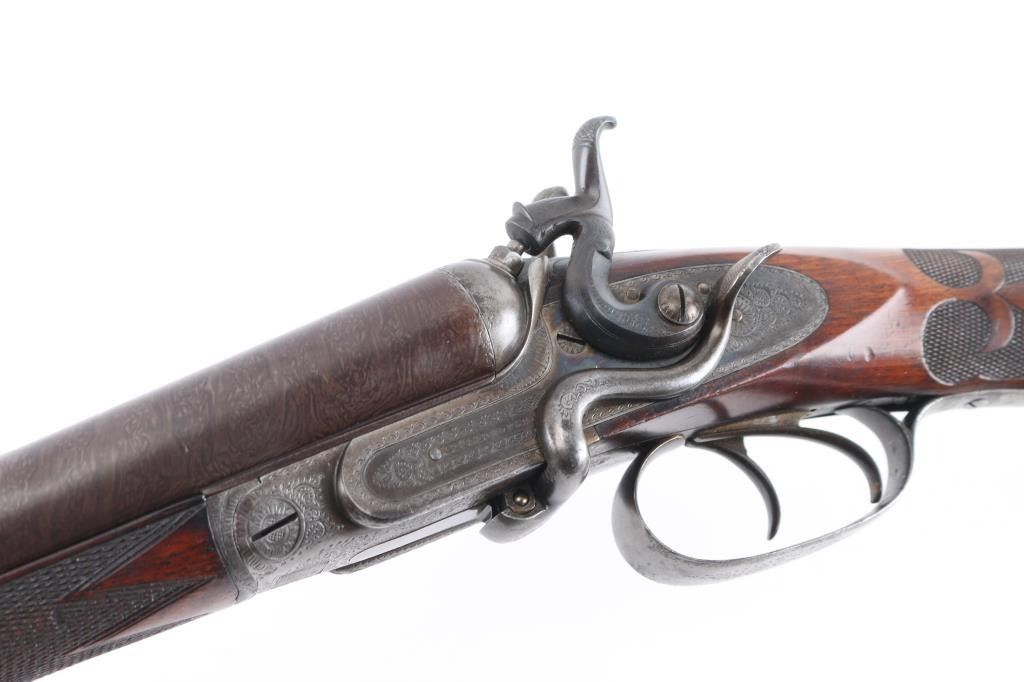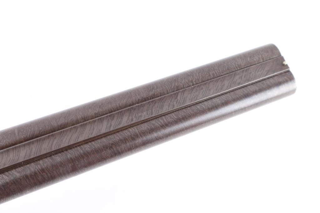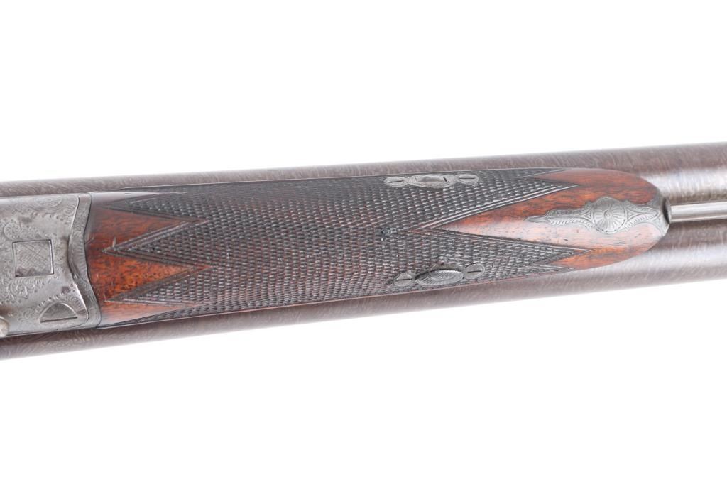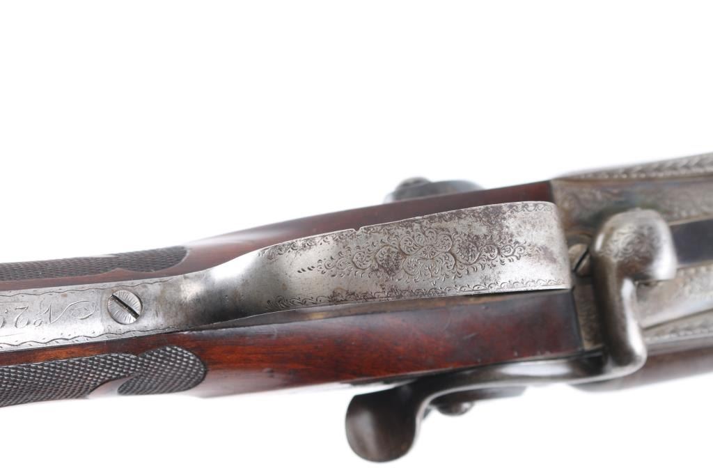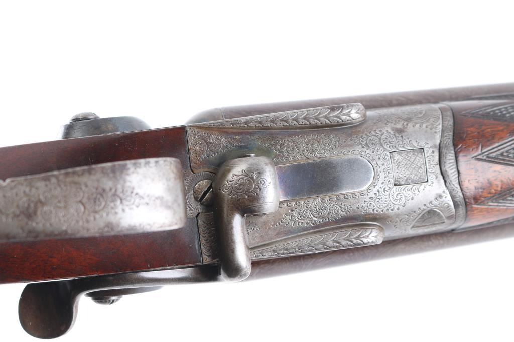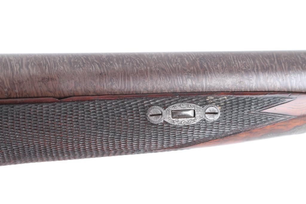 J. P. Clabrough & Bros., London 126A, side by side shotgun with side release lever, high exposed hammers, fancy fluer d lis checkered stocks #2957 made about 1876. Thirty inch barrels, 14 1/2" pull, choked about I.C. right and modified left. The condition is very good plus with 80%-90% brown on Damascus pattern barrels, 30-60 case colors on locks, T.G. drifted to patina along with pistol grip cap and steel butt plate. Stocks are nicely grained with crisp checkering and very good plus with minor handling, light wear and small dings with slight mars. Bores are very bright and gun is mechanically tight and crisp. From Larry Shelton collection author "J. P. Clabrough, Birmingham Gun Makers." Condition is NRA Fine***Antique Firearm***