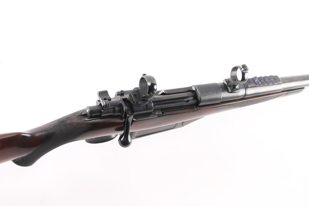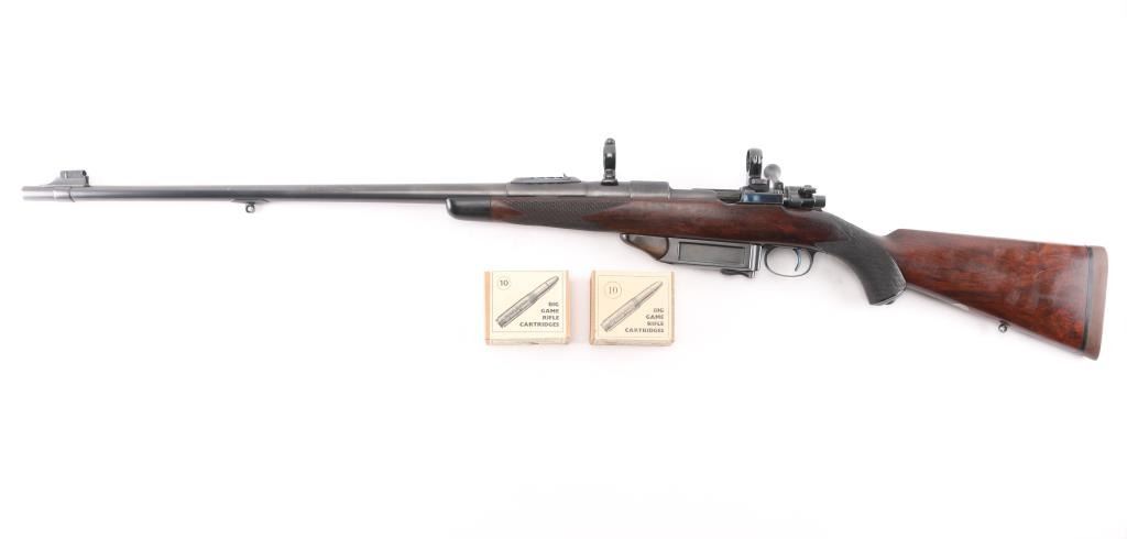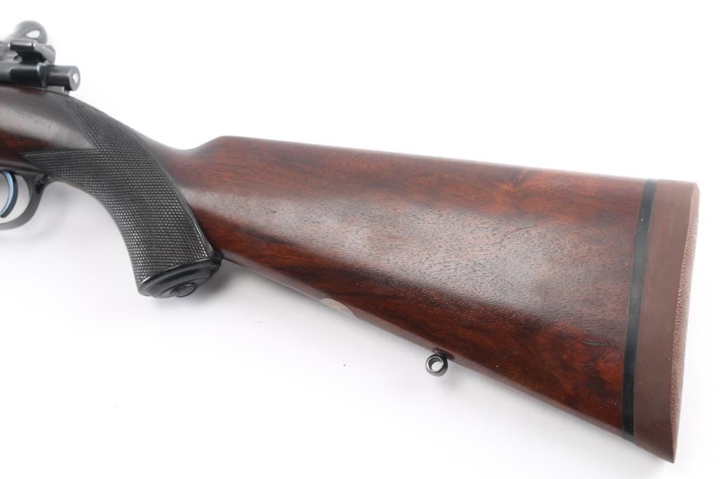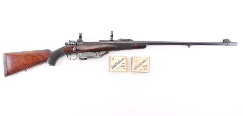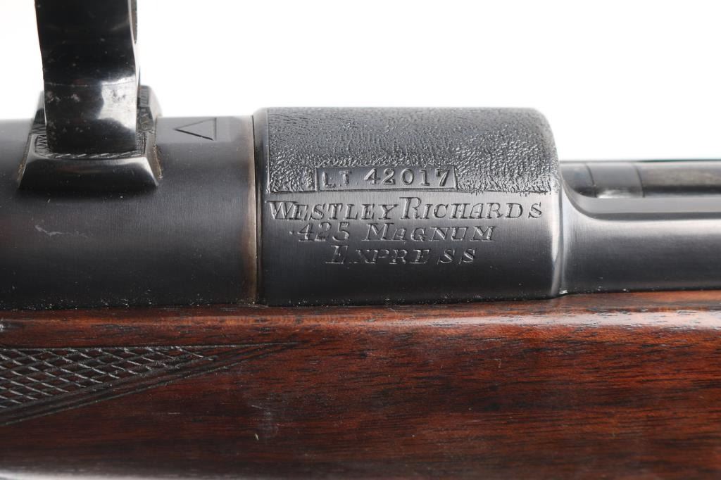 SN: LT42017 Desirable, pre-war, bolt action sporting rifle chambered in .425 Westley Richards Magnum Express. Manufactured in London, England circa 1928 with serial number prefix LT for Leslie Taylor, Managing Director of WR at the time and developer of the .425 cartridge. Features a blued finish, 28" tapered barrel with soldered sling eye, fully-banded front sight base with removable bead top blade sight, pivoting hood & flip-up glooming sight, island rear express sight on sleeve with one standing & four folding leaves marked for 100, 200, 300, 400 & 500 yards, claw scope bases with 1” rings, standard length large ring mauser action with thumb cut, turned down bolt handle with checkered flat panel on the knob, three-position Mauser safety marked “SAFE”, smooth curved trigger, latch release drop-box magazine with clips & horn shrouded hinge, multi-point hand checkered select walnut semi-pistol stock with horn forend tip, horn grip cap w/ storage compartment, inlayed oval escutcheon, installed sling eye, Decelerator recoil pad & 13 7/8" LOP. Weight: 9.2 lbs. The barrel is engraved "WESTLEY RICHARDS & Co. LONDON." & [Golden Triangle] on the Nocks form and the receiver ring is stamped "LT 42017” & engraved “WESTLEY RICHARDS/.425 MAGNUM/EXPRESS”. Rifle retains approximately 97% of its blued refinish showing a few scattered blemishes and contact wear on the bolt. The action is smooth, the bore is bright with good rifling, the markings are clear, and the wood stock is very good with minor blemishes & repair to the top of the wrist. Includes 20 rounds of ammo from Westley Richards, one box of 410gr round capped bullets and one box of 410 gr solid bullets.Condition is NRA Very Good as refinished.***C&R Firearm***