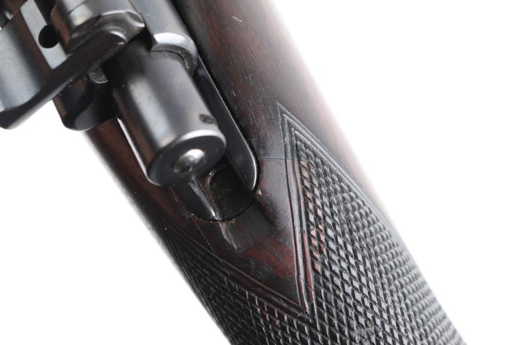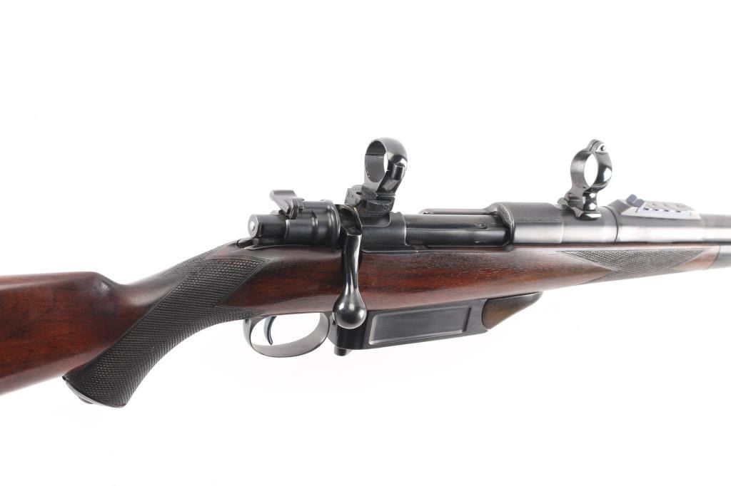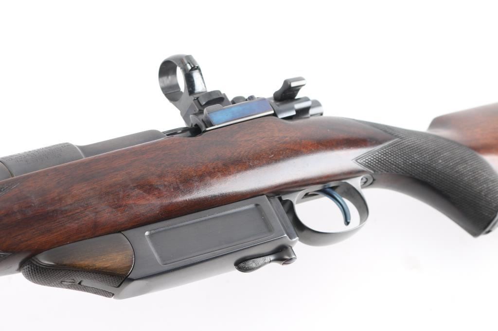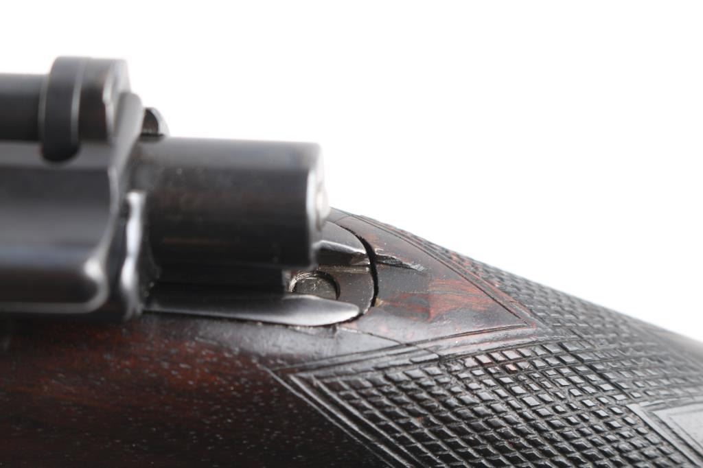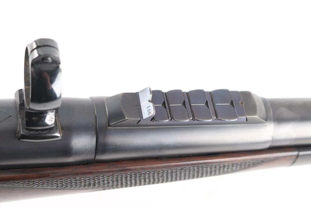 SN: LT42017 Desirable, pre-war, bolt action sporting rifle chambered in .425 Westley Richards Magnum Express. Manufactured in London, England circa 1928 with serial number prefix LT for Leslie Taylor, Managing Director of WR at the time and developer of the .425 cartridge. Features a blued finish, 28" tapered barrel with soldered sling eye, fully-banded front sight base with removable bead top blade sight, pivoting hood & flip-up glooming sight, island rear express sight on sleeve with one standing & four folding leaves marked for 100, 200, 300, 400 & 500 yards, claw scope bases with 1” rings, standard length large ring mauser action with thumb cut, turned down bolt handle with checkered flat panel on the knob, three-position Mauser safety marked “SAFE”, smooth curved trigger, latch release drop-box magazine with clips & horn shrouded hinge, multi-point hand checkered select walnut semi-pistol stock with horn forend tip, horn grip cap w/ storage compartment, inlayed oval escutcheon, installed sling eye, Decelerator recoil pad & 13 7/8" LOP. Weight: 9.2 lbs. The barrel is engraved "WESTLEY RICHARDS & Co. LONDON." & [Golden Triangle] on the Nocks form and the receiver ring is stamped "LT 42017” & engraved “WESTLEY RICHARDS/.425 MAGNUM/EXPRESS”. Rifle retains approximately 97% of its blued refinish showing a few scattered blemishes and contact wear on the bolt. The action is smooth, the bore is bright with good rifling, the markings are clear, and the wood stock is very good with minor blemishes & repair to the top of the wrist. Includes 20 rounds of ammo from Westley Richards, one box of 410gr round capped bullets and one box of 410 gr solid bullets.Condition is NRA Very Good as refinished.***C&R Firearm***
